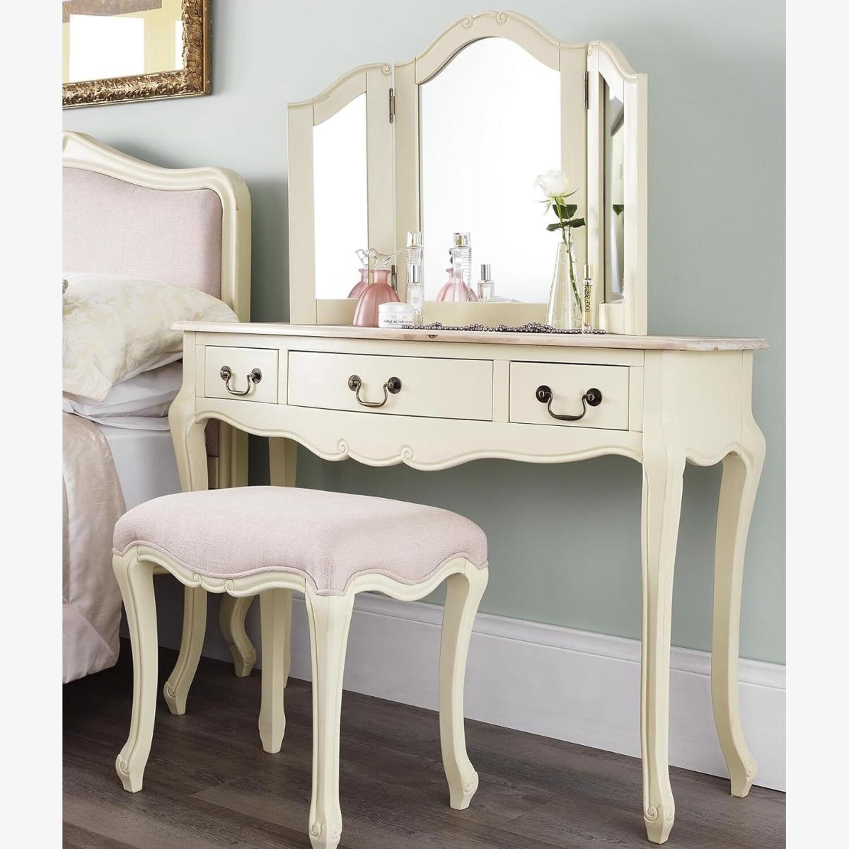 This elegant Juliette Dressing Table set with stool and mirror will add charm and sophistication to your bedroom. Available in a soft champagne or crisp white colour, it features a dressing table with three spacious drawers for storing all your beauty essentials. An arched 3-way mirror and upholstered stool complete the set. Opt for metal swan handles or sparkling crystal handles in a diamond shape for a touch of glamour. French style carved detailing along the table, mirror and stool accentuates the luxurious look. Juliette dressing table set provides the perfect vanity space for all your makeup routines. With its vintage inspired design, this dressing table set will stand the test of time as a timeless addition to your home decor. Dimensions Dressing Table (W110cm D40cm H79cm) Stool (W45cm D35cm H49cm) Mirror (W84cm D2cm H60cm)