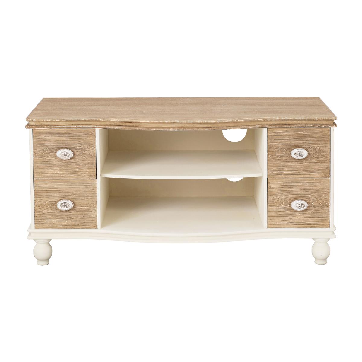 Bring the vintage style of the Juliette TV Unit into your living room for the ultimate luxurious interior. Comprised of four oak drawers set in a soft cream carcass with shelves for your TV essentials, the unit has a distressed effect wooden top and drawer fronts, accented with a delicate rose embossing on the single, cream knobs. Team this with other key items from the Juliette collection to create a beautiful, shabby chic arrangement with all the practical storage space you need for a contemporary home.