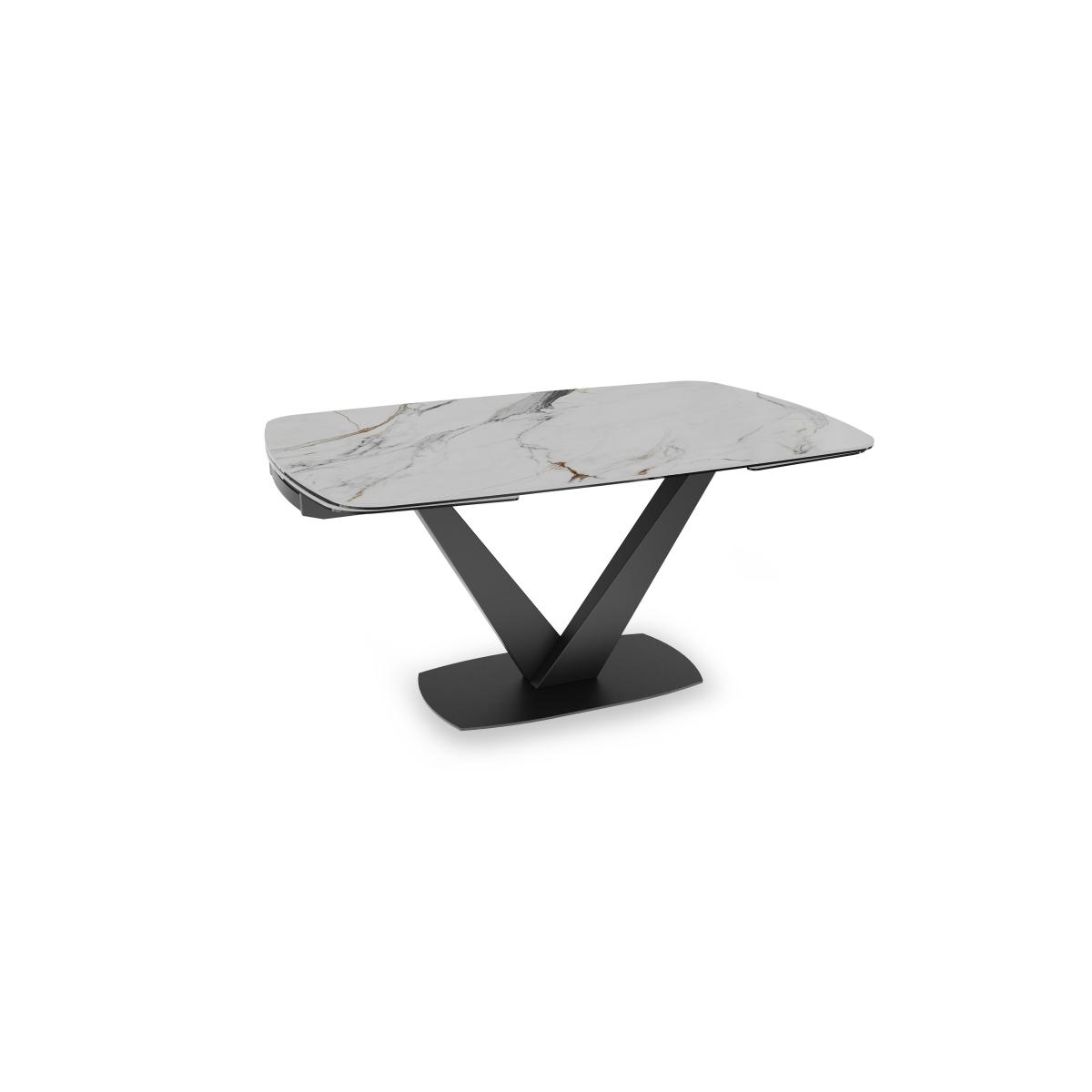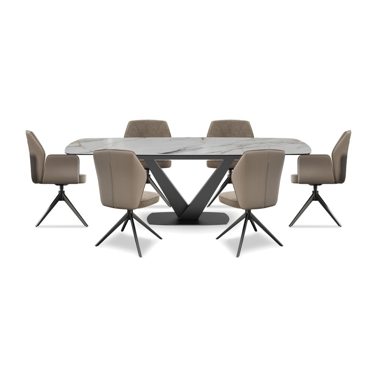 Sleek, stylish and a real showstopper – this dining set will transform a compact dining space. The draw leaf extending dining table has a marble-patterned ceramic top and the set includes six chairs. Why you'll love it Part of our Modern Dining Collection. A sleek modern dining set for your on-trend contemporary home. The draw leaf extending dining table has a curved, boat-shaped top. Ceramic table top has a gorgeous marble-effect finish. The marble patterning always matches whether the table is extended or closed. Easy to look after – ceramic is scratch-resistant, chip-resistant and heat-resistant. Bold metal pedestal base with a matt black lacquered finish. Ergonomic design allows you to seat more diners in comfort. The draw leaf table is easy to extend – pull on the table ends and extra leaves appear. This dining set includes 4 dining chairs and 2 dining arm chairs. Chairs have stylishly shaped seats and space-efficient swivel bases. Designed and made by Akante exclusively for Furniture Village. This dining set is part of our Julio range. What you need to know Dining chairs have foam seat cushioning. 160 cm draw leaf dining table seats 6 closed and 8 when extended. Top is 3 mm ceramic layer on 6 mm glass layer. Steel legs with a lacquered finish. Please note that the ceramic table top is not 100% heatproof. We recommend using coasters and placemats at all times. Wipe clean with a damp cloth. Dry with a soft duster. Do not use abrasive cleaning products. Part of our Julio collection of stylish and space-saving modern dining room furniture. Item code: JULIDSET1--001