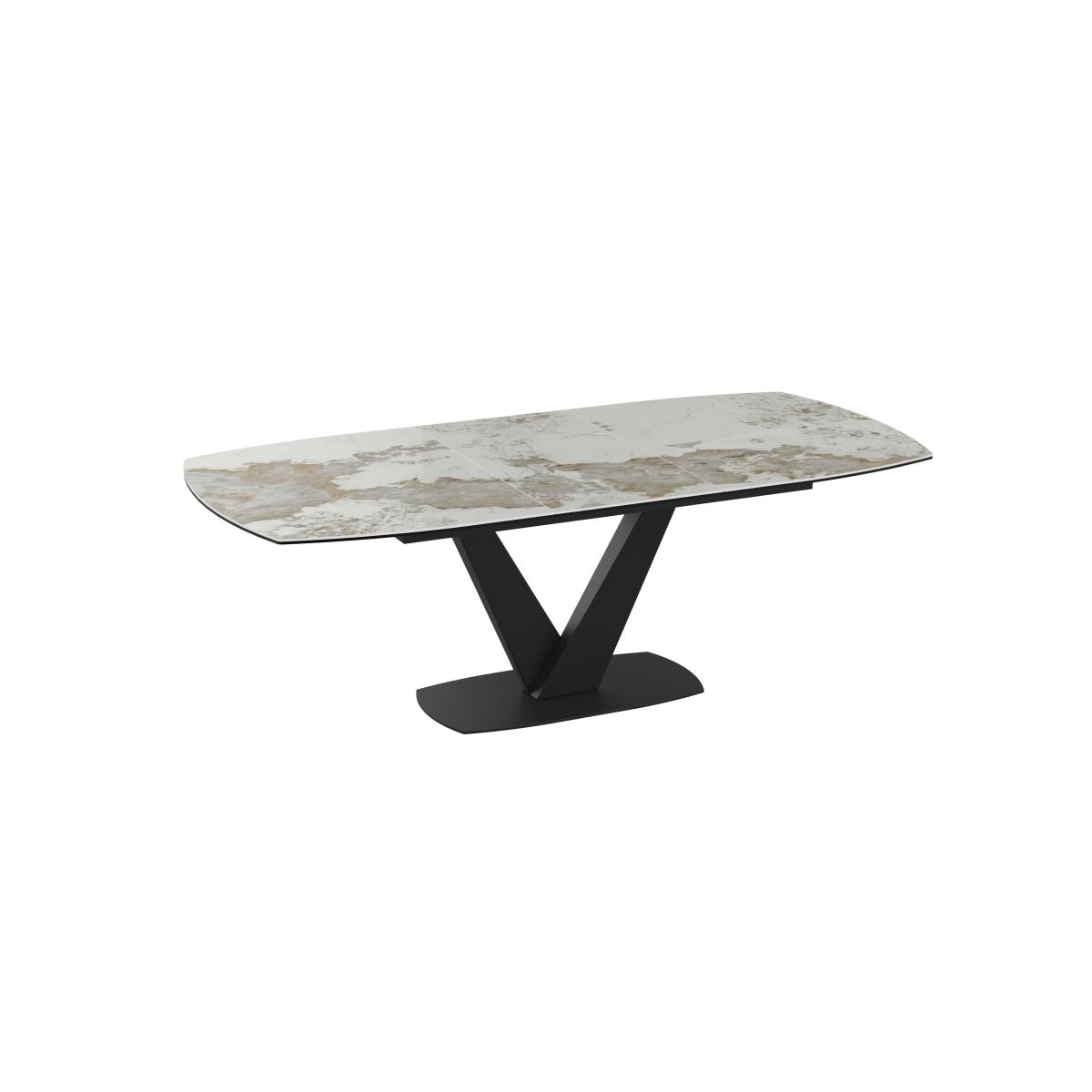 Bring home on-trend elegance and bold urban style with this beautiful boat-shaped ceramic extending dining table. In three sizes and only at Furniture Village. Why you'll love it Part of our Modern Dining Collection. Sleek modern style for your on-trend contemporary home. This exceptionally well-crafted extending dining table has a curved boat-shaped top. Choose from 10 beautiful ceramic finishes, including marbled ceramic. Such attention to detail – the marble patterning always matches whether the table is extended or closed. So easy to look after. Ceramic is scratch-resistant, chip-resistant and heat-resistant. Bold metal pedestal base with a matt black lacquered finish. Ergonomic design allows you to seat more diners in comfort. To extend, simply pull on the table ends and an extra leaf pops up into place. Available in 3 sizes. Designed and made by Akante exclusively for Furniture Village. This pop-up extending dining table is part of our Julio range. What you need to know 130 cm pop-up dining table seats 4 closed and 6 when extended. 160 cm pop-up dining table seats 6 closed and 8 when extended. 200 cm pop-up dining table seats 8 closed and 10 when extended. Top is 3 mm ceramic layer on 6 mm glass layer. Steel legs with a lacquered finish. Please note that the ceramic table top is not 100% heatproof. We recommend using coasters and placemats at all times. Wipe clean with a damp cloth. Dry with a soft duster. Do not use abrasive cleaning products. Part of our Julio collection of stylish and space-saving modern dining room furniture. Item code: JULITBL9AR-001