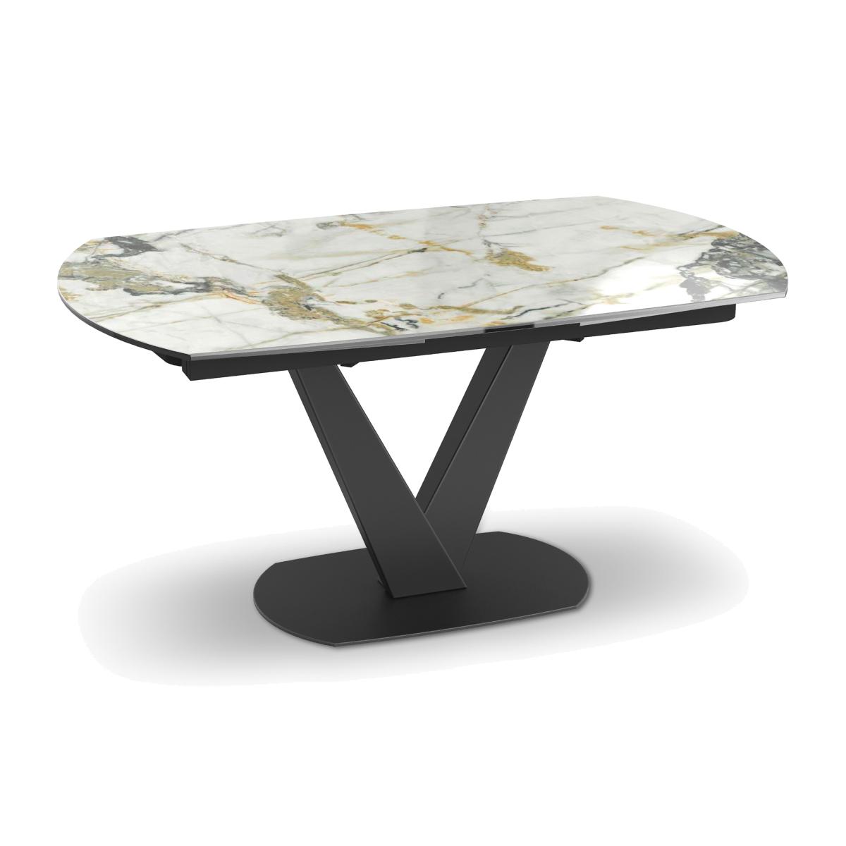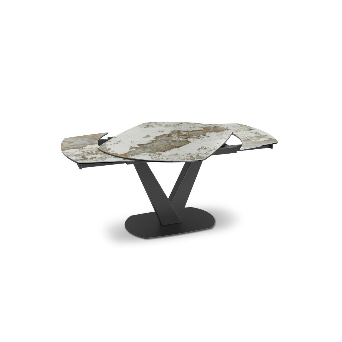 Impress your guests with this beautiful swivel-top dining table – simply rotate the top, and the table extends. In ten stunning ceramic finishes and only at Furniture Village. Why you'll love it Part of our Modern Dining Collection. Sleek modern style for your on-trend contemporary home. This exceptionally well-crafted extending dining table has a curved boat-shaped top. Choose from 10 beautiful ceramic finishes, including marbled ceramic. Such attention to detail – the marble patterning always matches whether the table is extended or closed. So easy to look after. Ceramic is scratch-resistant, chip-resistant and heat-resistant. Bold metal pedestal base with a matt black lacquered finish. Ergonomic design allows you to seat more diners in comfort. The table top of this swivel dining table rotates to extend. Available in 3 sizes. Only at Furniture Village. This swivel extending dining table is part of our Julio range. What you need to know Small swivel dining table seats 4 closed and 6 when extended. Medium swivel dining table seats 6 closed and 8 when extended. Large swivel dining table seats 8 closed and 10 when extended. Top is 3 mm ceramic layer on 6 mm glass layer. Steel legs with a lacquered finish. Please note that the ceramic table top is not 100% heatproof. We recommend using coasters and placemats at all times. Wipe clean with a damp cloth. Dry with a soft duster. Do not use abrasive cleaning products. Part of our Julio collection of stylish and space-saving modern dining room furniture.