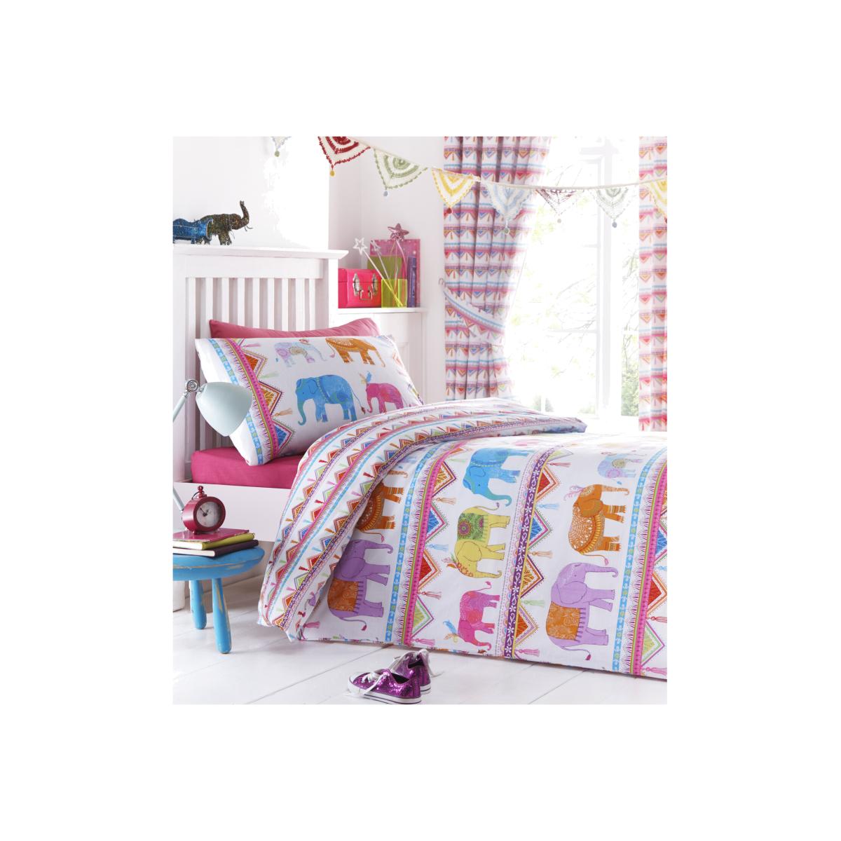 Super bright and colourful, the Elephant Kids Duvet Cover and Pillowcase Set will be a wonderful bedding set for any kid that loves elephants. This duvet and pillowcase feature an allover pattern of illustrated elephants, each coloured a different bright colour. Drawn-on bunting and tassels add a little extra fun, and any little boy or girl will love falling asleep in this fun and arty set. This set comes complete with one matching pillowcase.