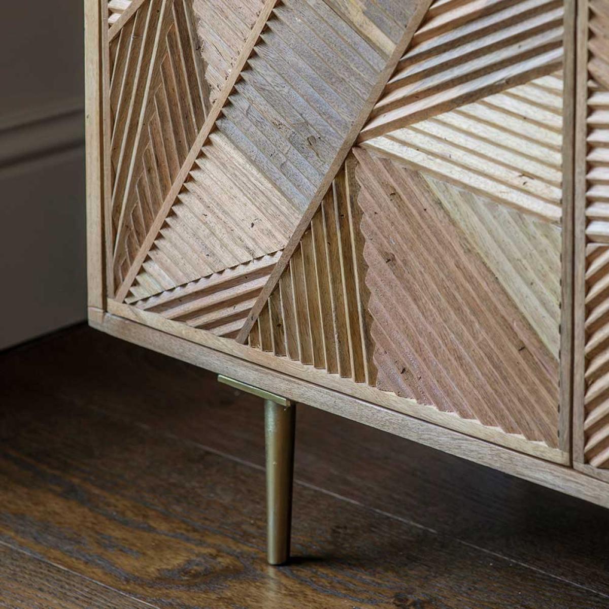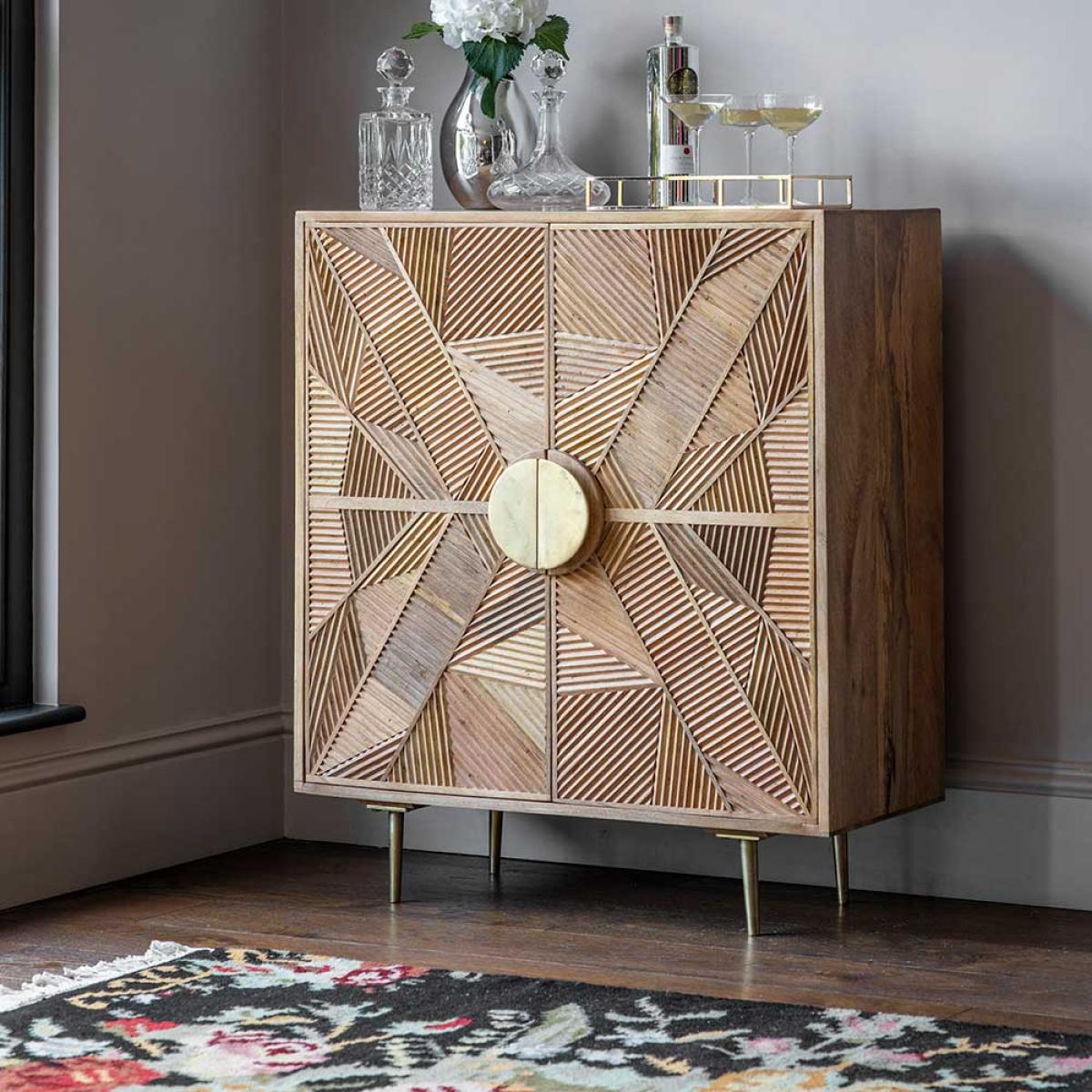 I’m a fan of this sideboard for its hand-carved geometric front and slim brass legs - it adds texture without feeling fussy. It sits equally well in Scandi-inspired or mid-century modern schemes, and brings warmth to relaxed boho spaces, especially against muted wall tones. For styling, keep it simple: a low ceramic vase of greenery, a couple of coffee-table books and a discrete tray let the woodwork remain the star. Pair with a softly patterned rug that picks out the warm hues to complete the look.