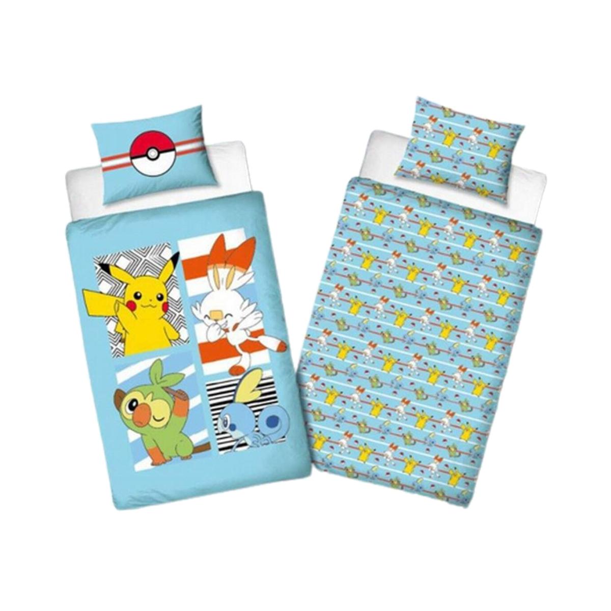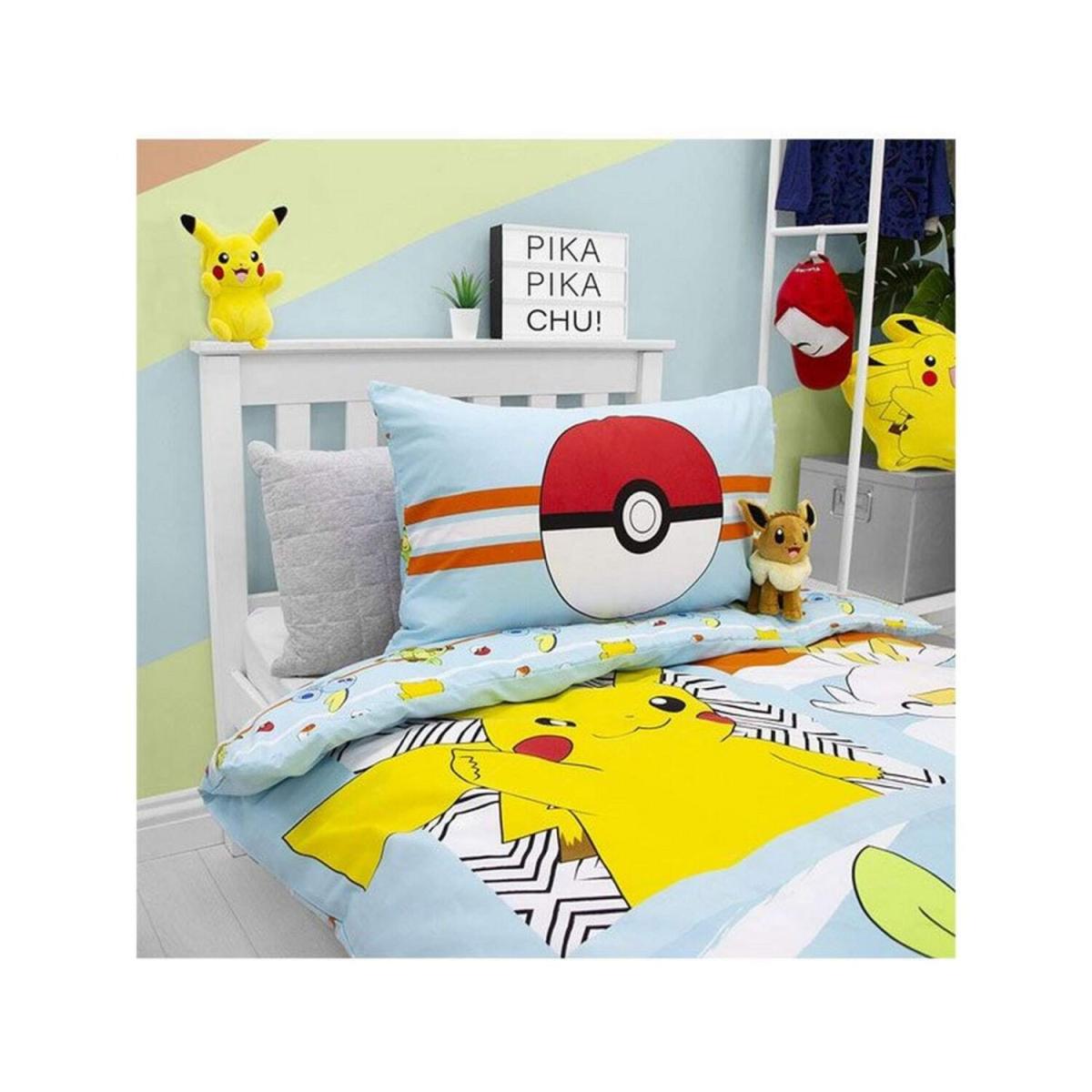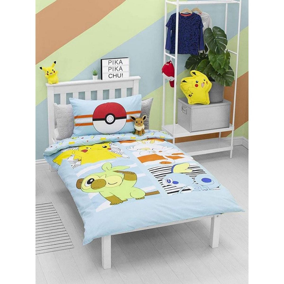 This fun Pokmon Jump single duvet cover set is ideal for any Pokmon fans. The front of the duvet cover features Pikachu, Sobble, Scorbunny and Grookey set in patterned panels on a light blue background, while the reverse has a smaller repeat design of the characters with Pokballs and red and white stripes on the same light blue backdrop. This duvet cover is made from a polycotton blend and can be machine washed and tumble dried on a cool setting.