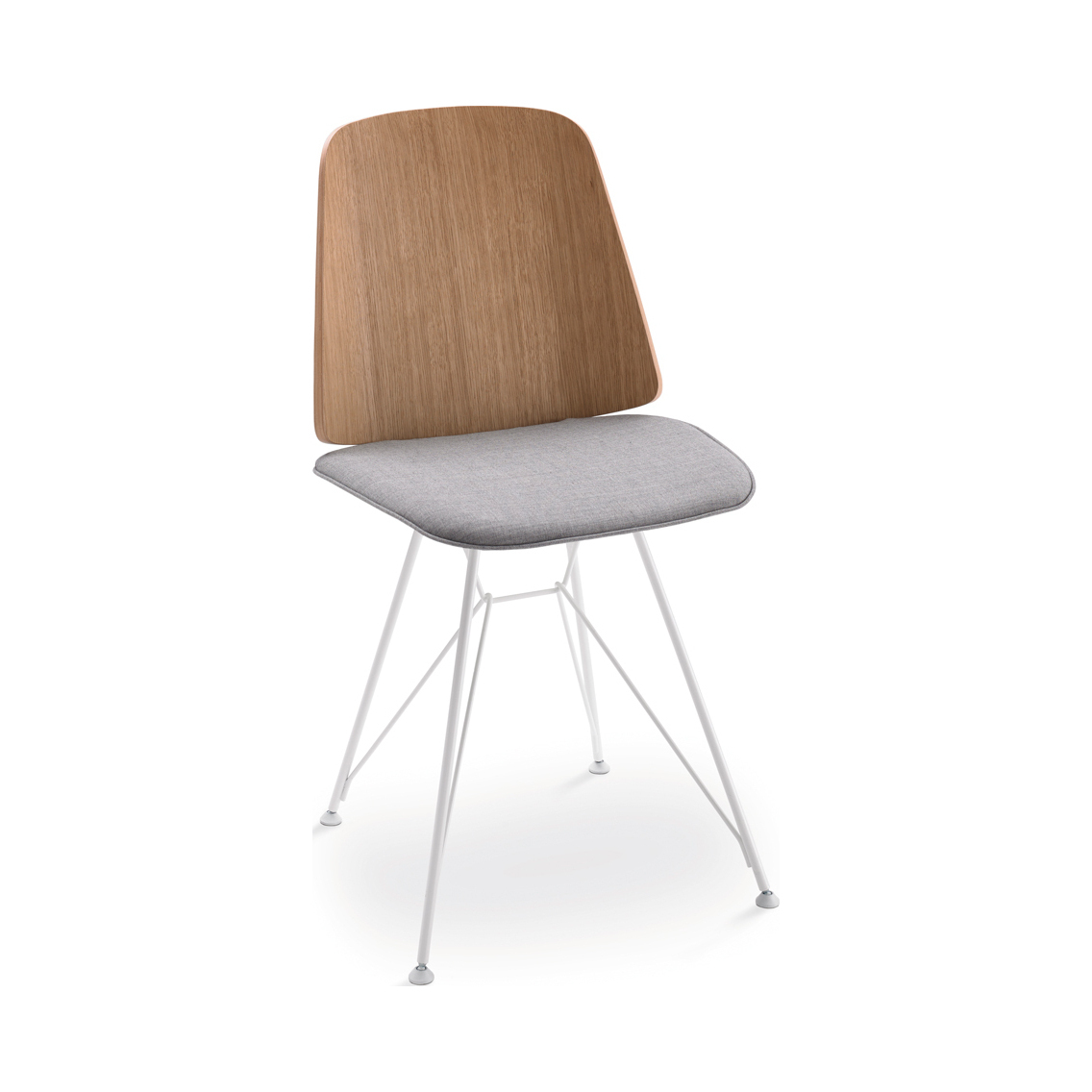 The June 2056 Dining Chair by Frank Rettenbacher for Zanotta is a lightweight design with a pure form, made up of a beech plywood back covered in natural oak, juxtaposed with a chic 'quadrifoglio' fabric upholstered seat. With a gently faceted form and geometric outline, the seat and back are beautifully complemented by the industrial structure of the base, crafted from white painted steel, while the oak has been treated to enhance the wood's natural grain. Upholstered in Zanotta's 'quadrifoglio' fabric, a rich wool and nylon blend, the slender, contemporary form of the June 2056 Dining Chair would complement an array of interiors with its simple, harmonious aesthetic.