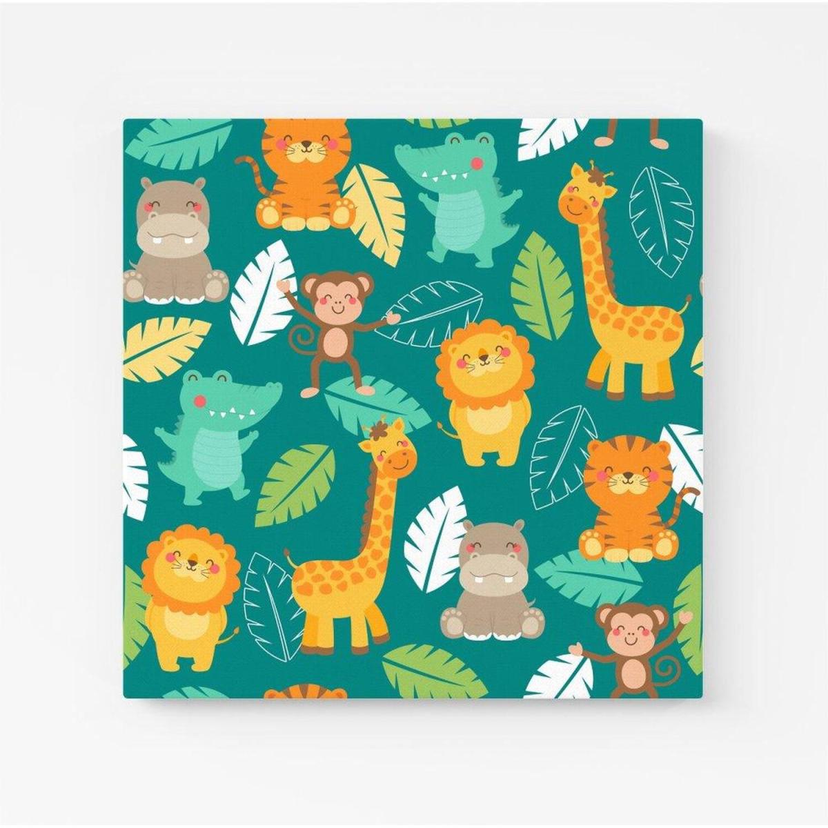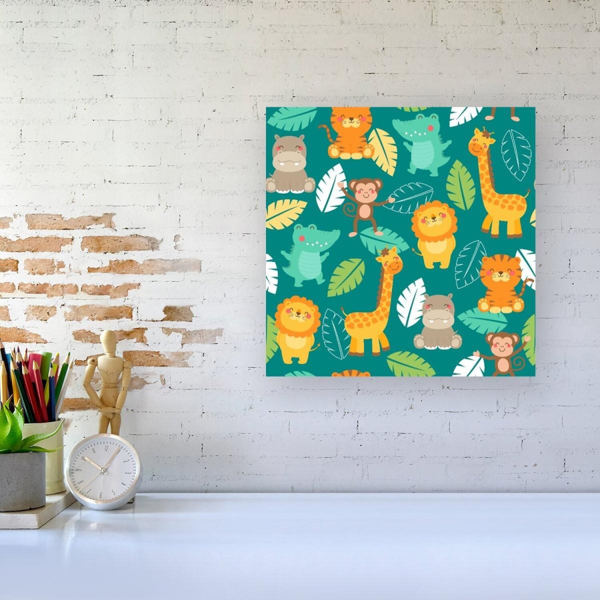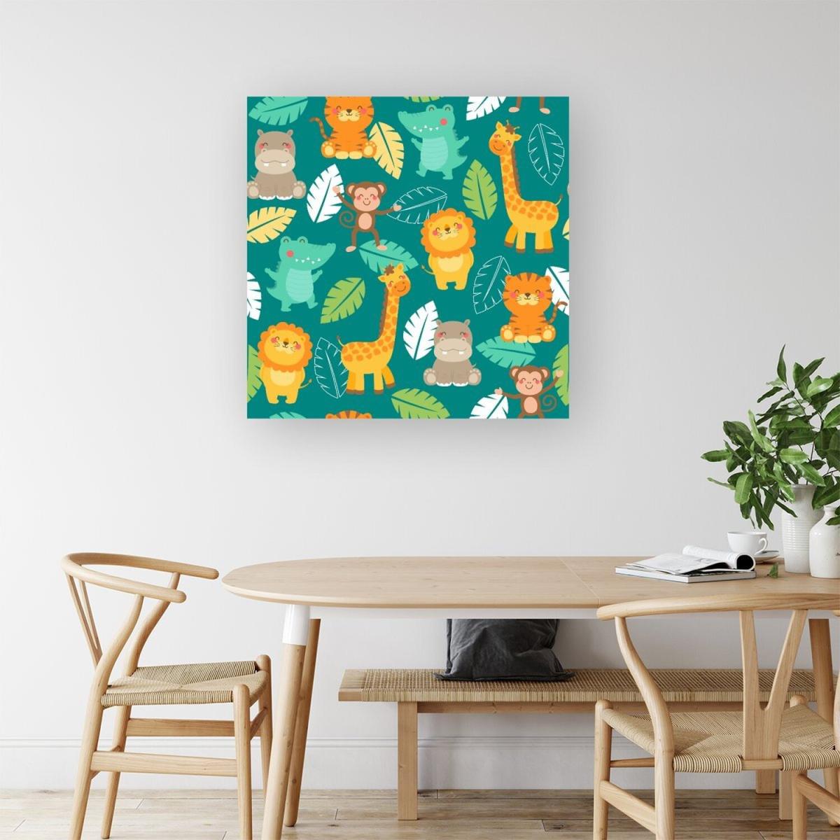 I love this jungle animals print for its playful yet vibrant character, making it a great focal point in a child's bedroom or a lively play area. The green tones add a fresh touch that works well in both modern and more eclectic interiors, especially when paired with natural materials or earthy colours. Styling tips include placing it above a neutral bed linen or alongside other natural textures like rattan or wood accents to enhance its jungle theme. It can also work in a family room or a creative space, injecting colour and personality without overwhelming the space. Keep accessories minimal around it to let the artwork shine, and consider adding soft lighting to highlight its fun design.