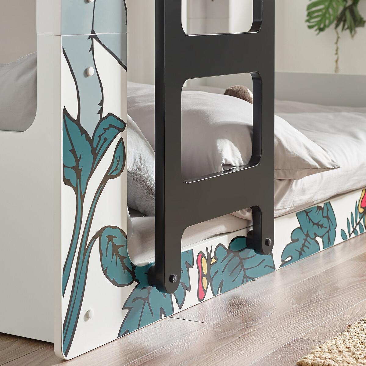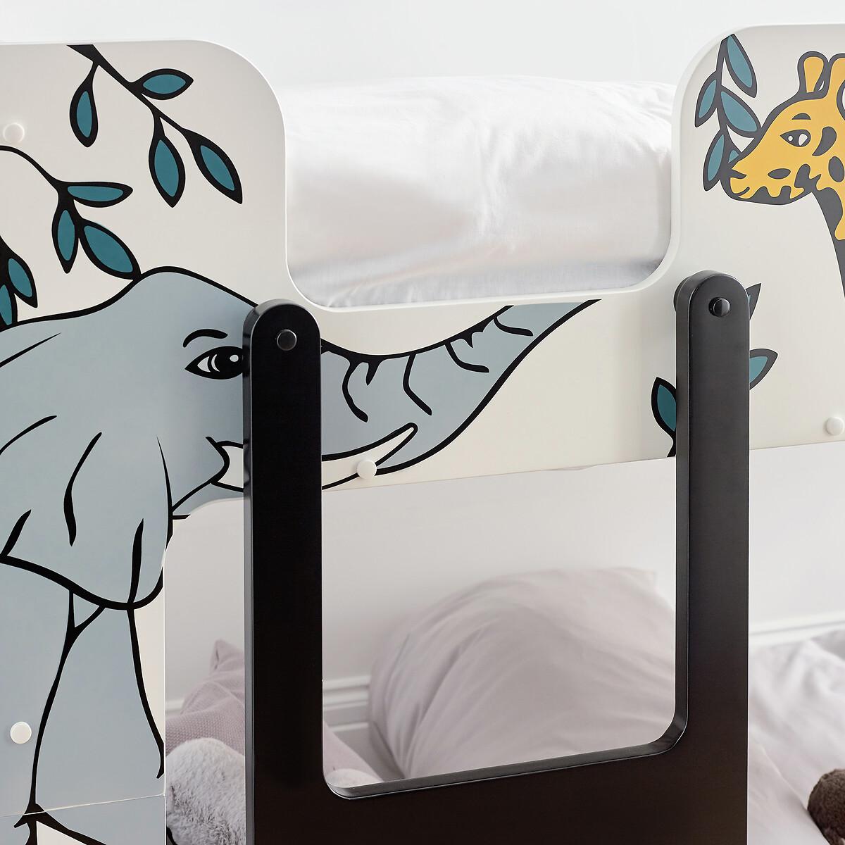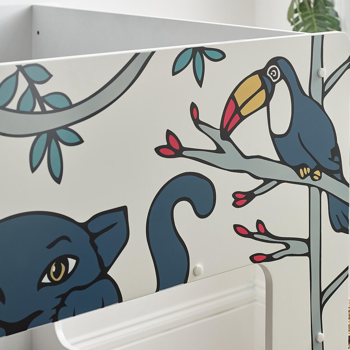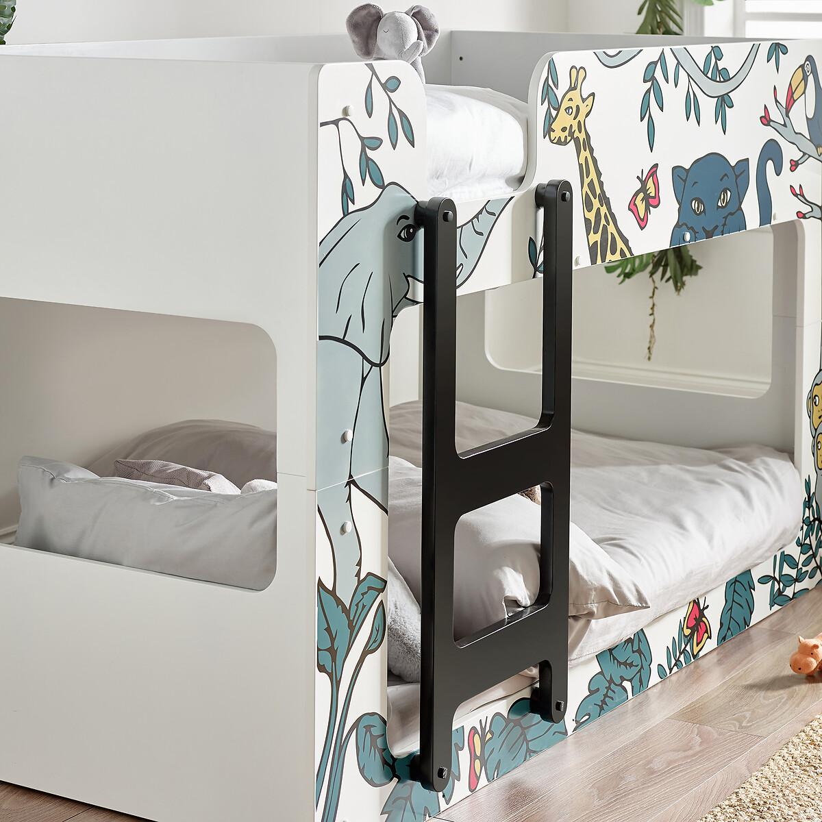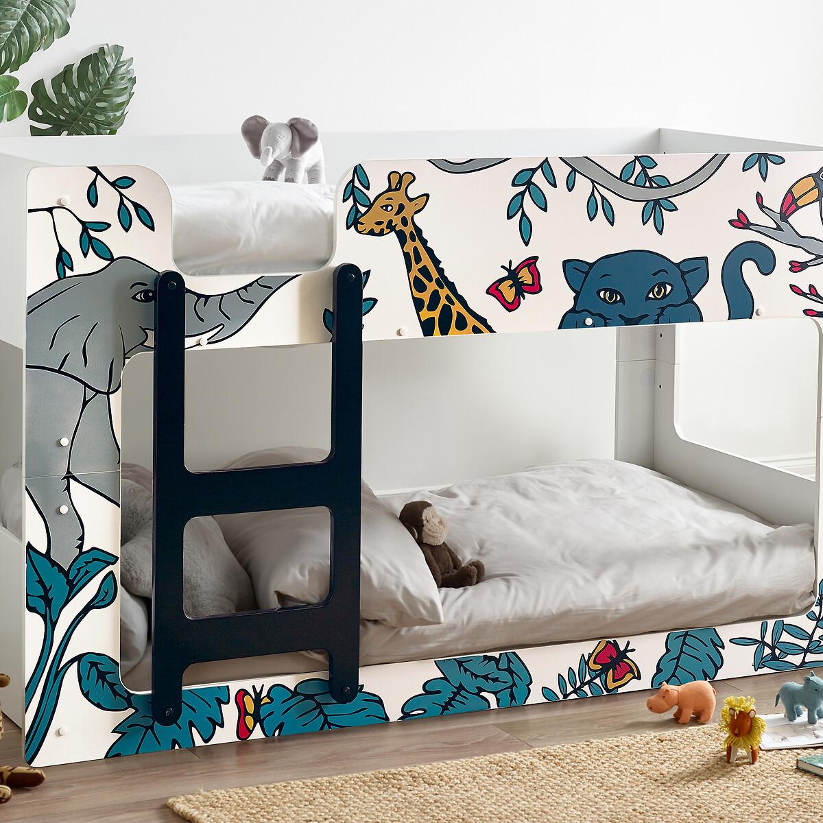 Experience the magic of safari with our Jungle Bunk Bed! The bed provides a colourful and fun space for kids to sleep in comfort and explore their wildest dreams. Featuring a stunning Jungle art print and a black two-step ladder. The lower bed is close to the ground, providing ease of access for little legs. Product details• A playful and imaginative Jungle Bunk Bed, ideal for kids• Jungle themed print• A strong two-step ladder• Solid and durable MDF construction• Suitable for two children• Assembly required• Fixings included• Compatible with Standard UK single 90 x 190 cm mattresses• Mattress not included• Maximum mattress height - 21cm. To minimise the danger of falling from the top bunk, we recommend that the top of the mattress should always be at least 16cm below the top of the lowest part of the guardrail. • 12-month product guarantee. Composition - 100% MDFOverall Dimensions 207.5 cm x 101 cm x 120.5 cm , Weight - 84.5 KGDistance Between Bunks - 102cm. Package Dimensions:Parcel 1 Packaged Dimensions - 218 cm x 70 cm x 8.5 cm, Weight 29 KGParcel 2 Packaged Dimensions - 218 cm x 70 cm x 8.5 cm, Weight 30 KGParcel 3 Packaged Dimensions - 101 cm x 69.5 cm x 16 cm, Weight 31 KGPlease note: this product cannot be be delivered to all Offshore Islands Northern Ireland or Republic of Ireland. This product will be dispatched by one of our trusted suppliers. You’ll be contacted by their selected courier about your delivery.