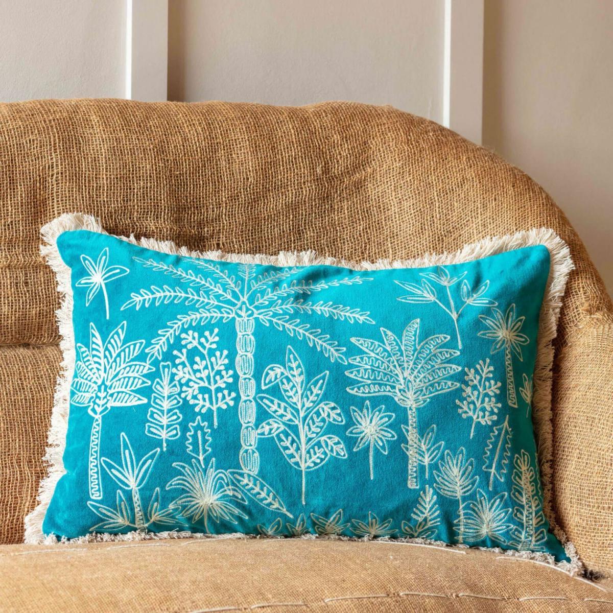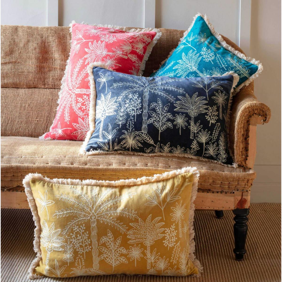 Crafted by artisans on hand-driven machines, which can take up to ten years to master, using an embroidery technique called crewel that dates back to medieval times. The soft cream jungle-inspired embroidery contrasts the jewel-toned cushions and is finished with a matching cream fringe trim.  H40 x 60cm. Made from 100% cotton with a duck feather filled cushion inner. We advise spot cleaning only. The design on these cushions has been created by hand, so exact patterns may vary.