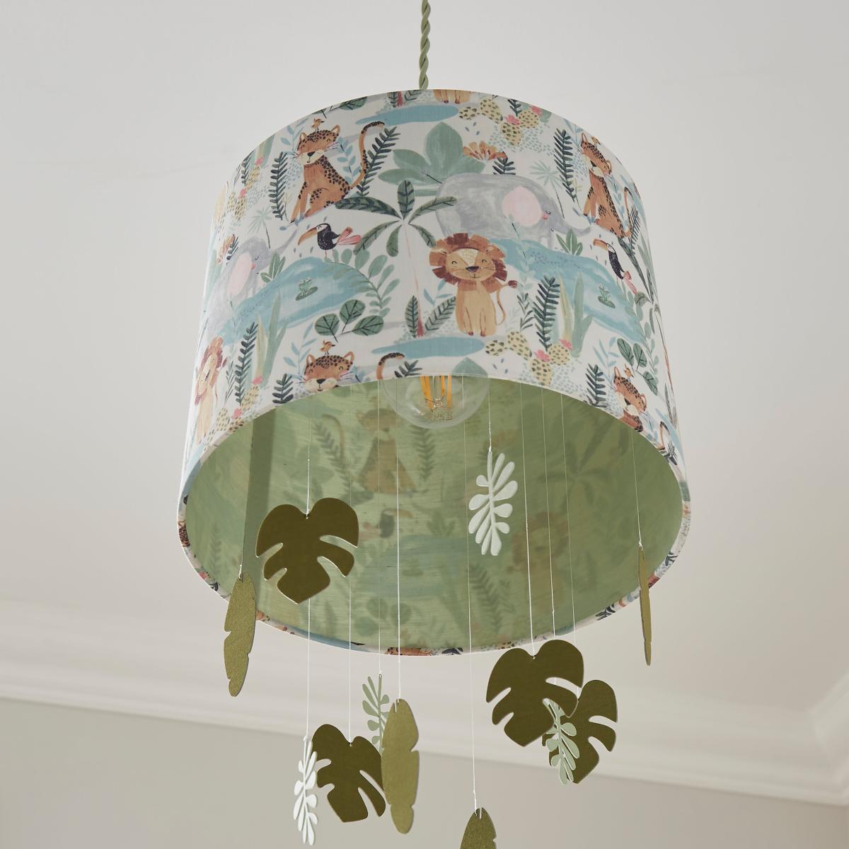 I love this jungle-themed lampshade for adding a playful yet stylish touch to a variety of interiors. It works particularly well in children's rooms, nurseries, or any space looking for a touch of whimsy, but it can also bring a fun element to eclectic or boho living spaces. When styling, consider pairing it with natural textures and earthy colours to enhance the jungle vibe, or use it as an eye-catching statement piece in neutrally decorated rooms. Practical tips include keeping other accessories simple so the shade remains the focal point, and ensuring the size complements the space - larger rooms benefit from a bigger shade for visual impact. Its lively pattern and hanging leaf details make it a versatile choice for injecting character into both modern and more relaxed interiors.
