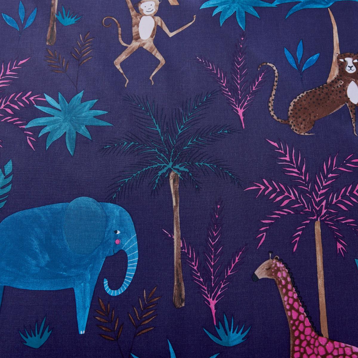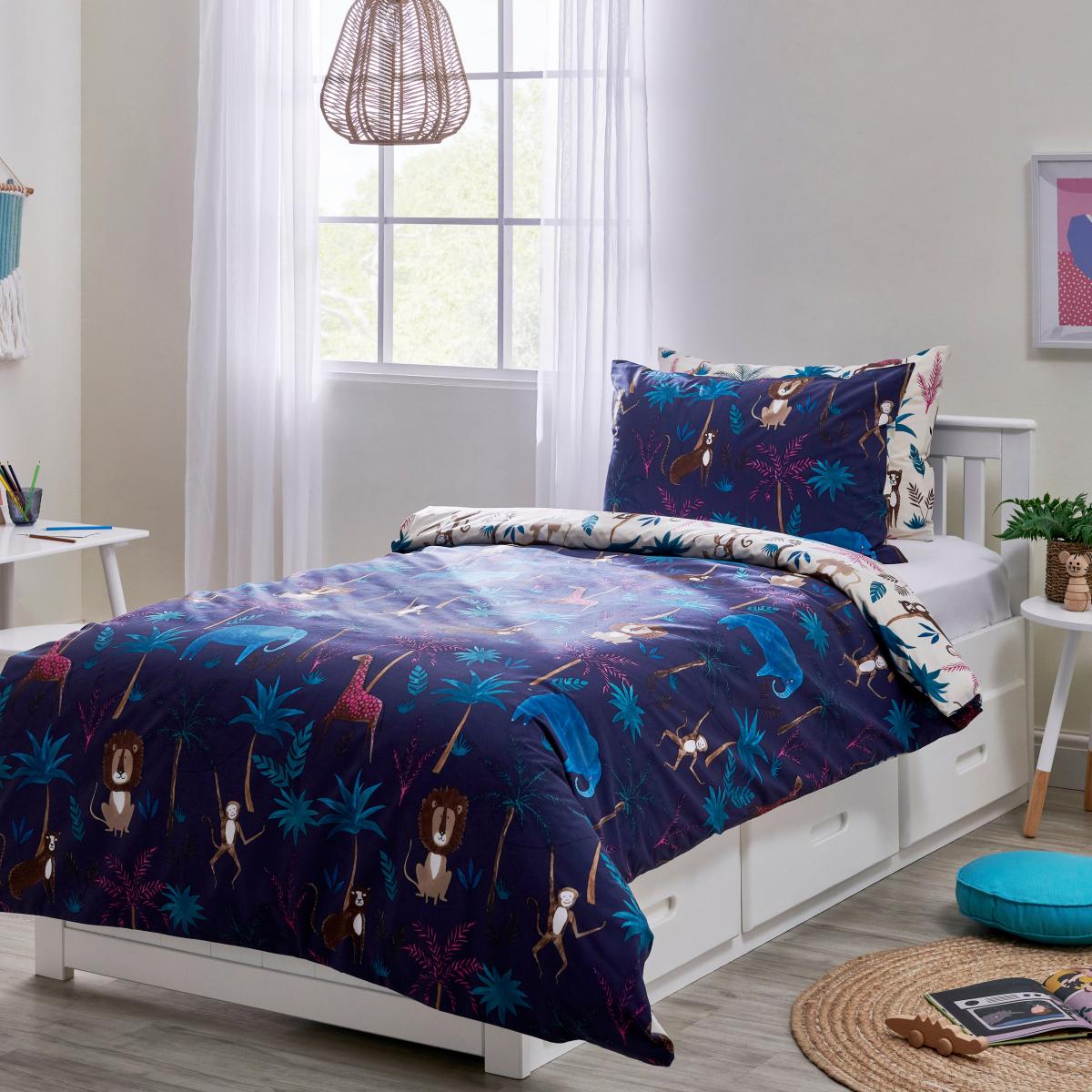Bring a child’s room to life with this exciting, full colour printed duvet set. With two sides of playful illustrations, these jungle characters will add personality and fun to any room. Enjoy the convenience of transforming and refreshing a room, with one side featuring deep dark tones and the other brighter but still with the same theme running throughout. This polycotton set is machine washable and available in a range of sizes.