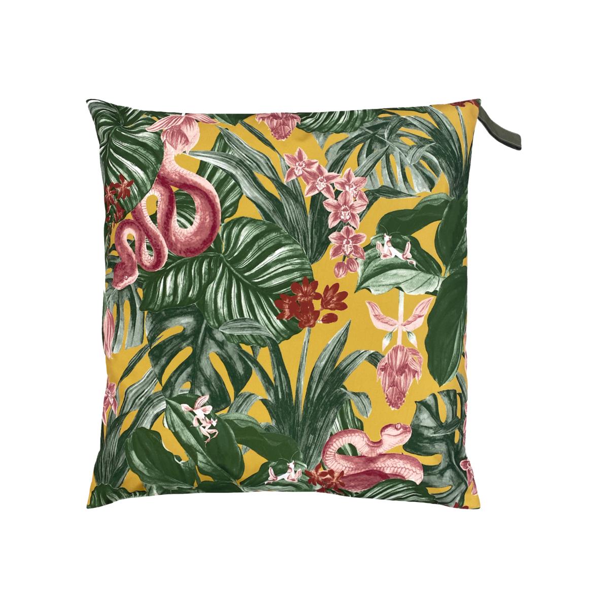 Featuring a tropical floral jungle design with pink snakes on a mustard background. Get lost amongst the tropical floral jungle with the Medinilla outdoor cushion. Delve deep amongst the tropical foliage to discover an exotic array of snakes hiding in their natural habitat. The perfect addition to your garden!