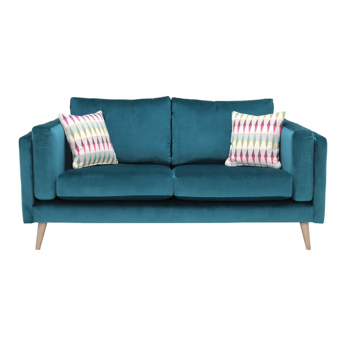This compact, mid-century modern sofa is ideal for small living spaces. Made in Nottinghamshire, the Juni features soft fibre back cushions and resilient foam seat and bolster cushions, offering a comfortable yet supportive sit. Its clean silhouette, solid wood turned feet and geometric feather scatter cushions give the Juni a statement, retro-inspired look. Choose from a variety of high quality fabrics and stained feet finishes to complement your interior.