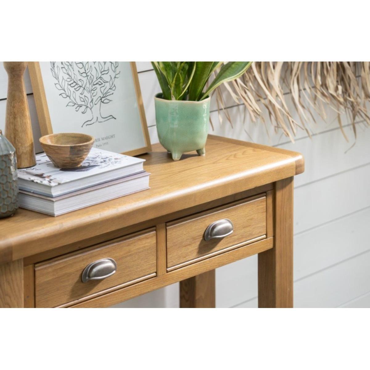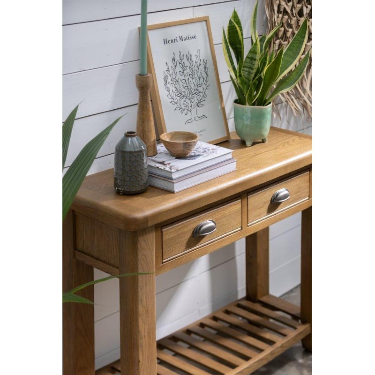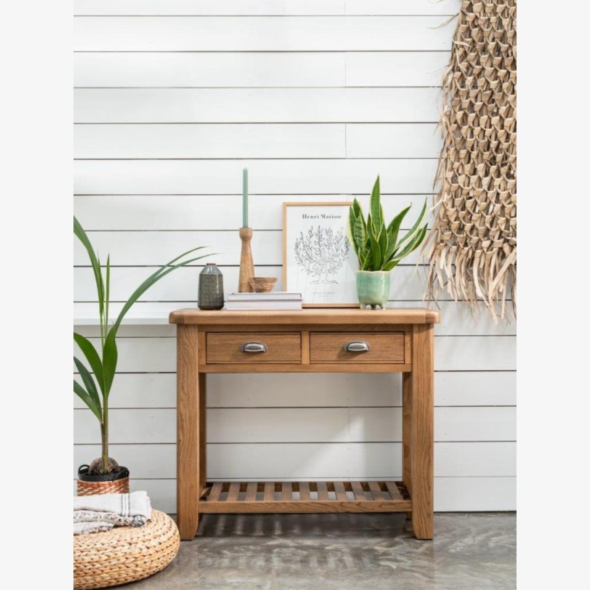 Juniper Console Table – Elegant and Practical Accent Piece Add a touch of modern farmhouse style to your home with the Juniper Console Table. Perfect for displaying lamps, photographs, or decorative pieces, it brings both charm and functionality to your hallway or living space. Key Features: Two small top drawers provide handy storage for everyday essentials Slatted bottom shelf ideal for décor or additional storage Crafted from oak and oak veneers for durability and timeless appeal Complements the Juniper living and dining collection for a cohesive look throughout your home Delivered flat packed for easy home assembly Includes wall attachment device for safety and stability Dimensions: Height: 85cm Width: 100cm Depth: 35cm All screens vary in colour reproduction and whilst every effort has been made to display the colour as accurately as possible it is for guidance only.