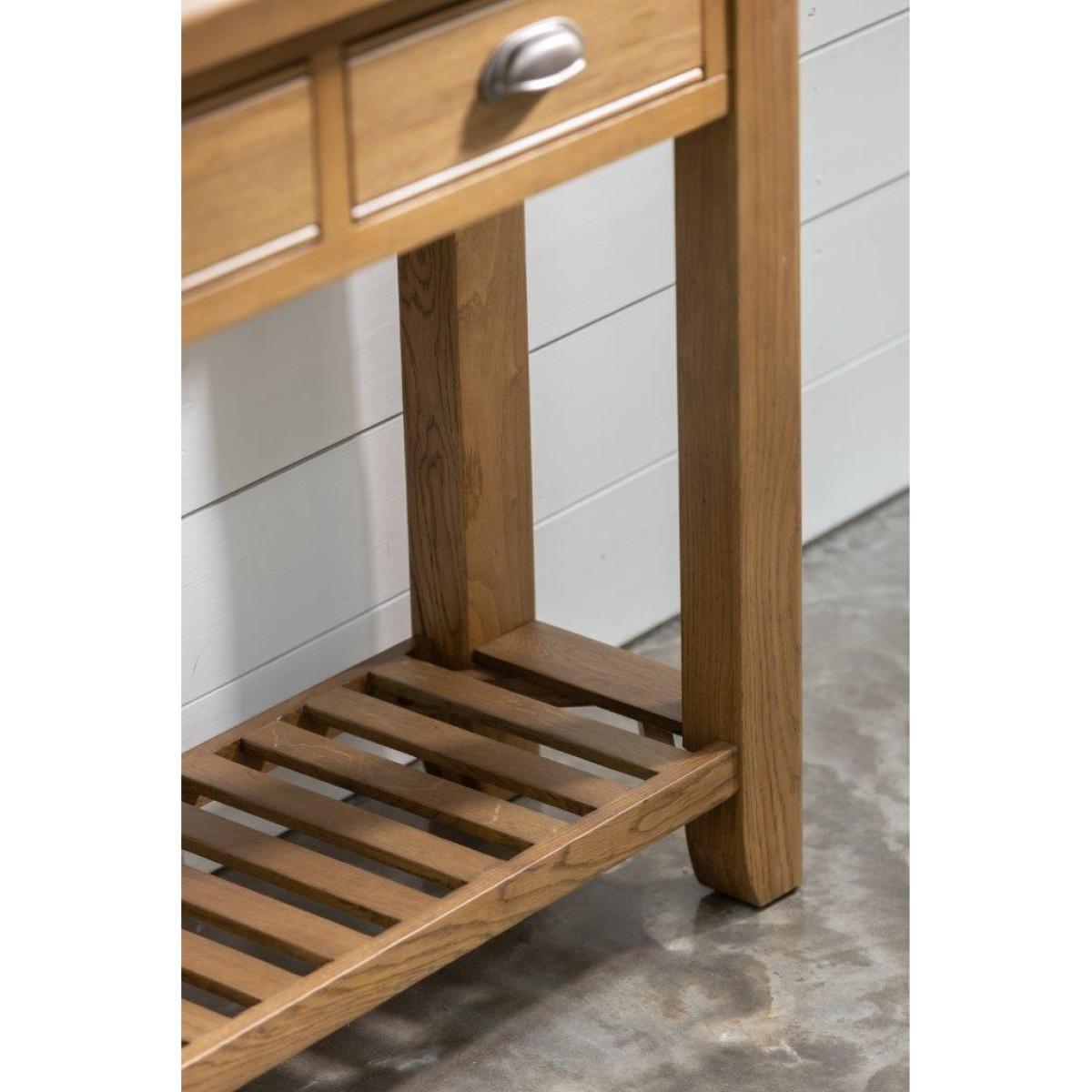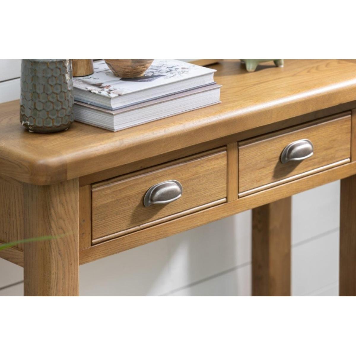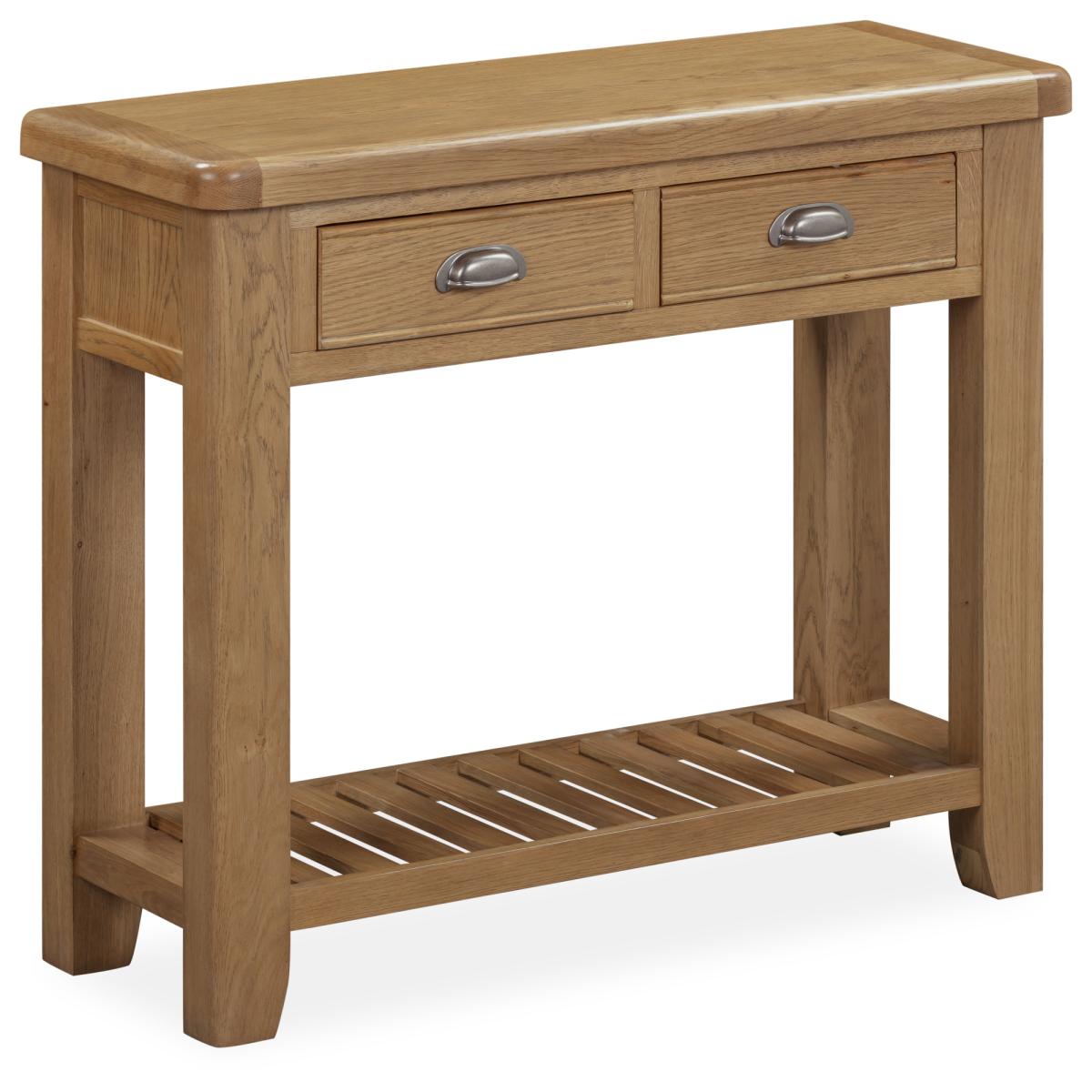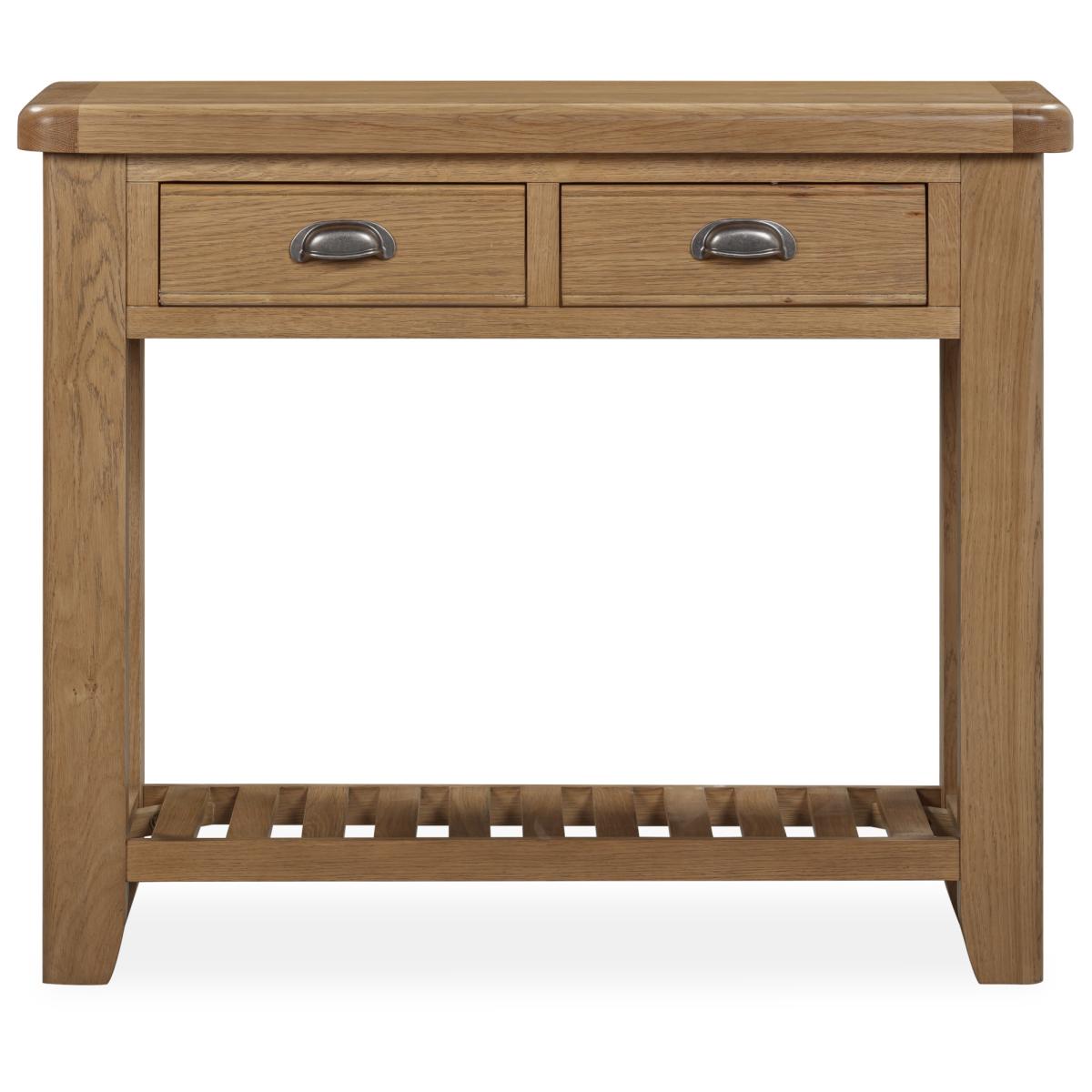 Juniper Console Table – Elegant and Practical Accent Piece Add a touch of modern farmhouse style to your home with the Juniper Console Table. Perfect for displaying lamps, photographs, or decorative pieces, it brings both charm and functionality to your hallway or living space. Key Features: Two small top drawers provide handy storage for everyday essentials Slatted bottom shelf ideal for décor or additional storage Crafted from oak and oak veneers for durability and timeless appeal Complements the Juniper living and dining collection for a cohesive look throughout your home Delivered flat packed for easy home assembly Includes wall attachment device for safety and stability Dimensions: Height: 85cm Width: 100cm Depth: 35cm All screens vary in colour reproduction and whilst every effort has been made to display the colour as accurately as possible it is for guidance only.