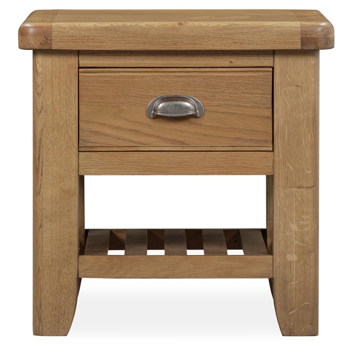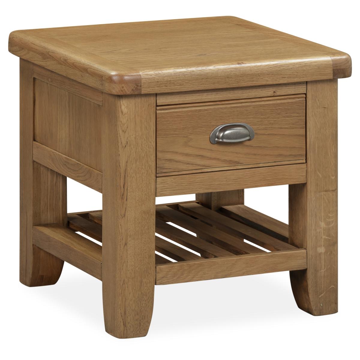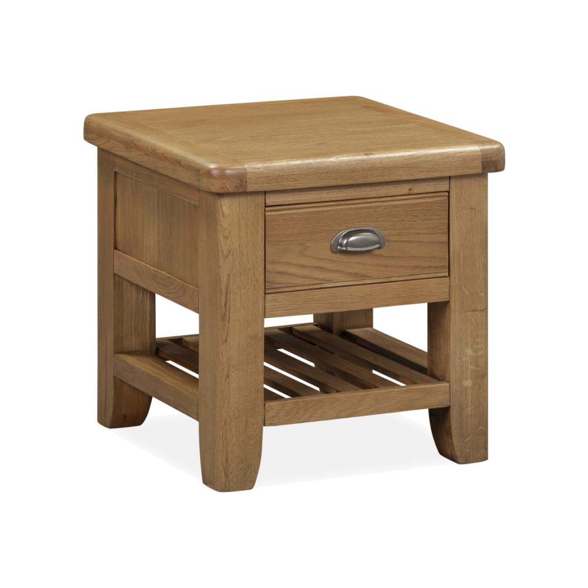 Juniper Lamp Table – Compact and Charming Design Small in size but big on style, the Juniper Lamp Table is the perfect finishing touch for your living or dining space. Its warm smoked oak finish and practical design make it ideal for holding a lamp, plant, or decorative accessory. Key Features: Compact design with a handy top drawer for everyday essentials Bottom shelf provides additional display or storage space Crafted from oak and oak veneers for durability and lasting appeal Complements the Juniper living and dining collection for a coordinated home look Delivered fully assembled for convenience Dimensions: Height: 55cm Width: 55cm Depth: 55cm All screens vary in colour reproduction and whilst every effort has been made to display the colour as accurately as possible it is for guidance only.