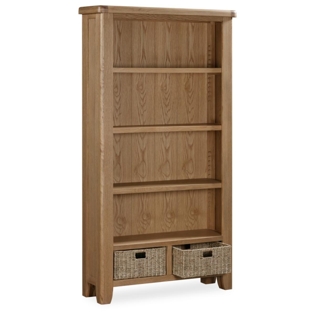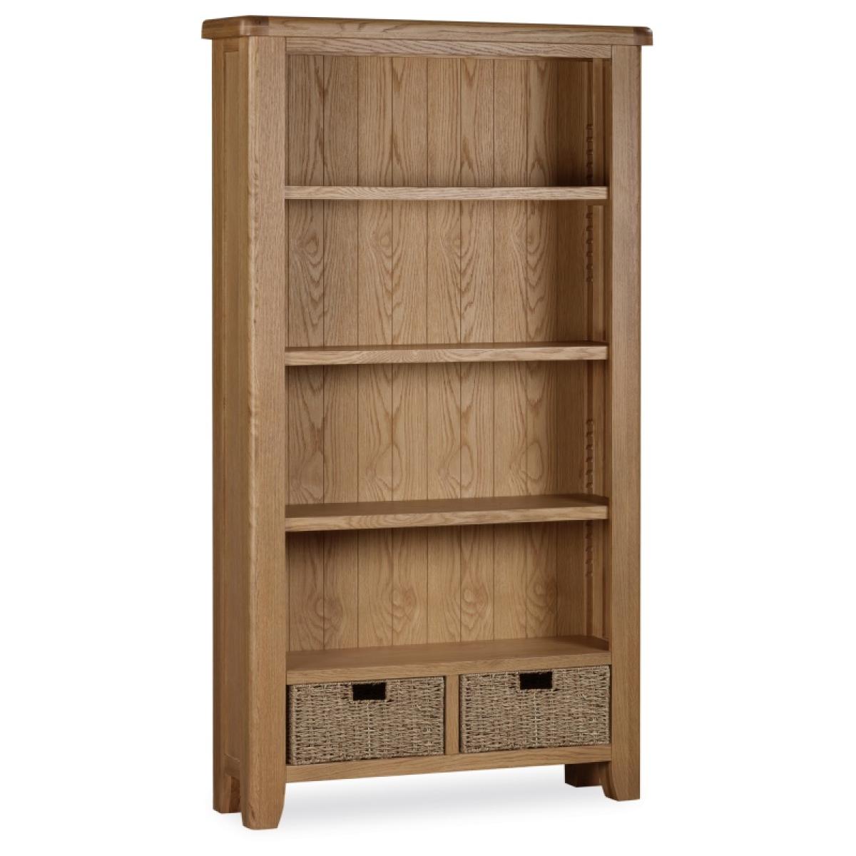 Spacious and Stylish Storage Showcase your favourite books and decorative pieces with the Juniper Large Bookcase. Combining generous storage with classic modern farmhouse design, it’s a timeless addition to your living or dining space. Key Features: Four shelves provide ample space for books, ornaments, and home décor Includes storage baskets for organising smaller items or accessories Crafted from oak and oak veneers for durability and lasting appeal Complements the Juniper living and dining collection for a cohesive home look Delivered fully assembled for your convenience Includes wall attachment device for safety and stability Dimensions: Height: 180cm Width: 100cm Depth: 30cm All screens vary in colour reproduction and whilst every effort has been made to display the colour as accurately as possible it is for guidance only.