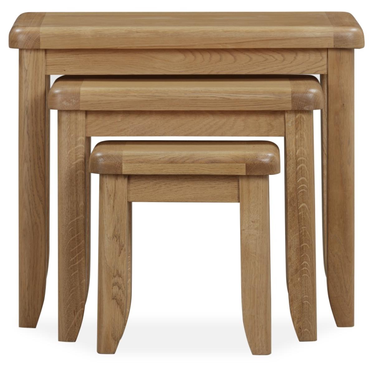 Versatile and Stylish Living Room Companions A true home essential, the Juniper Nest of Tables offers practicality with timeless modern farmhouse style. Whether used together or separately, these tables provide the perfect solution for entertaining and everyday living. Key Features: Set of three tables that nest neatly together when not in use Ideal for holding drinks, snacks, or decorative items Crafted from oak and oak veneers for durability and classic appeal Complements the Juniper living and dining collection for a cohesive look Delivered fully assembled for convenience Dimensions: Large - H: 55cm x W: 65cm x D: 40cm Medium - H: 45cm x W: 49cm x D: 32cm Small - H: 35cm x W: 33cm x D: 24cm All screens vary in colour reproduction and whilst every effort has been made to display the colour as accurately as possible it is for guidance only.