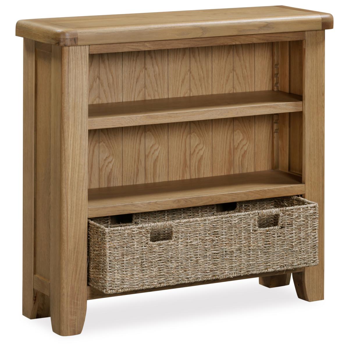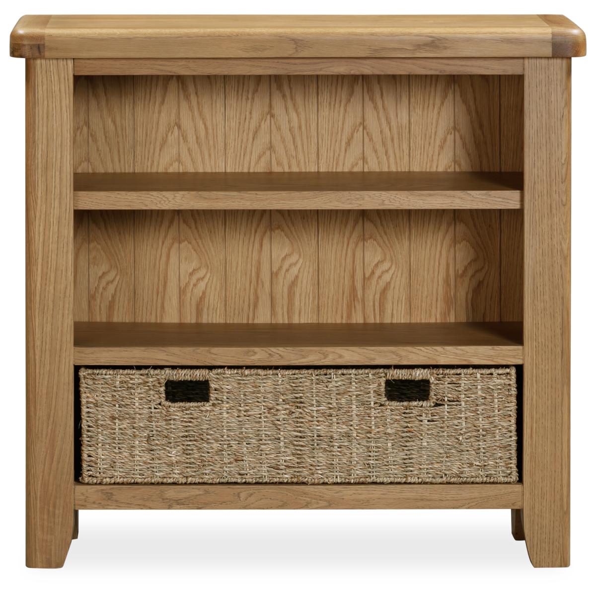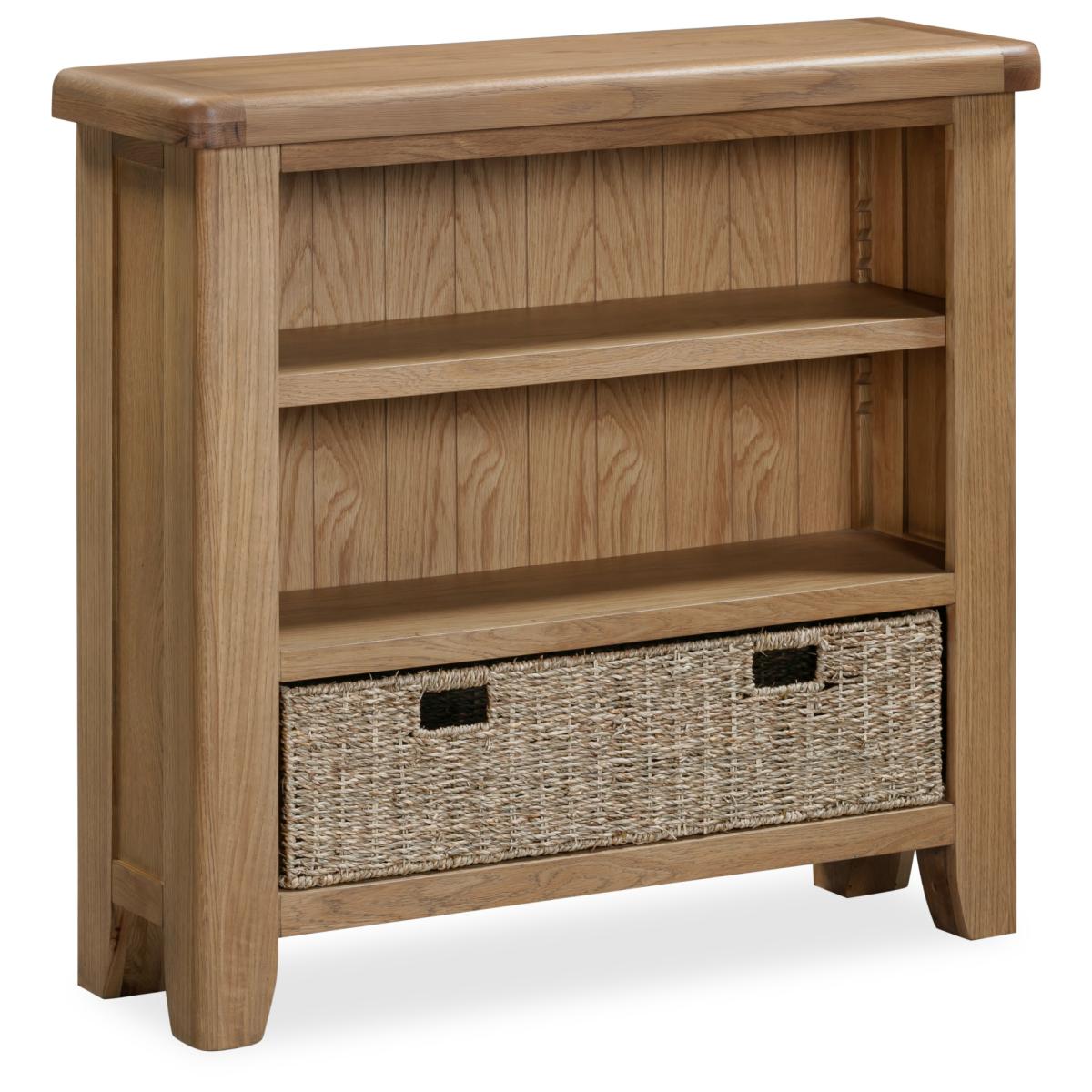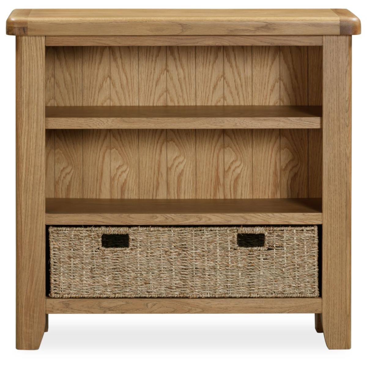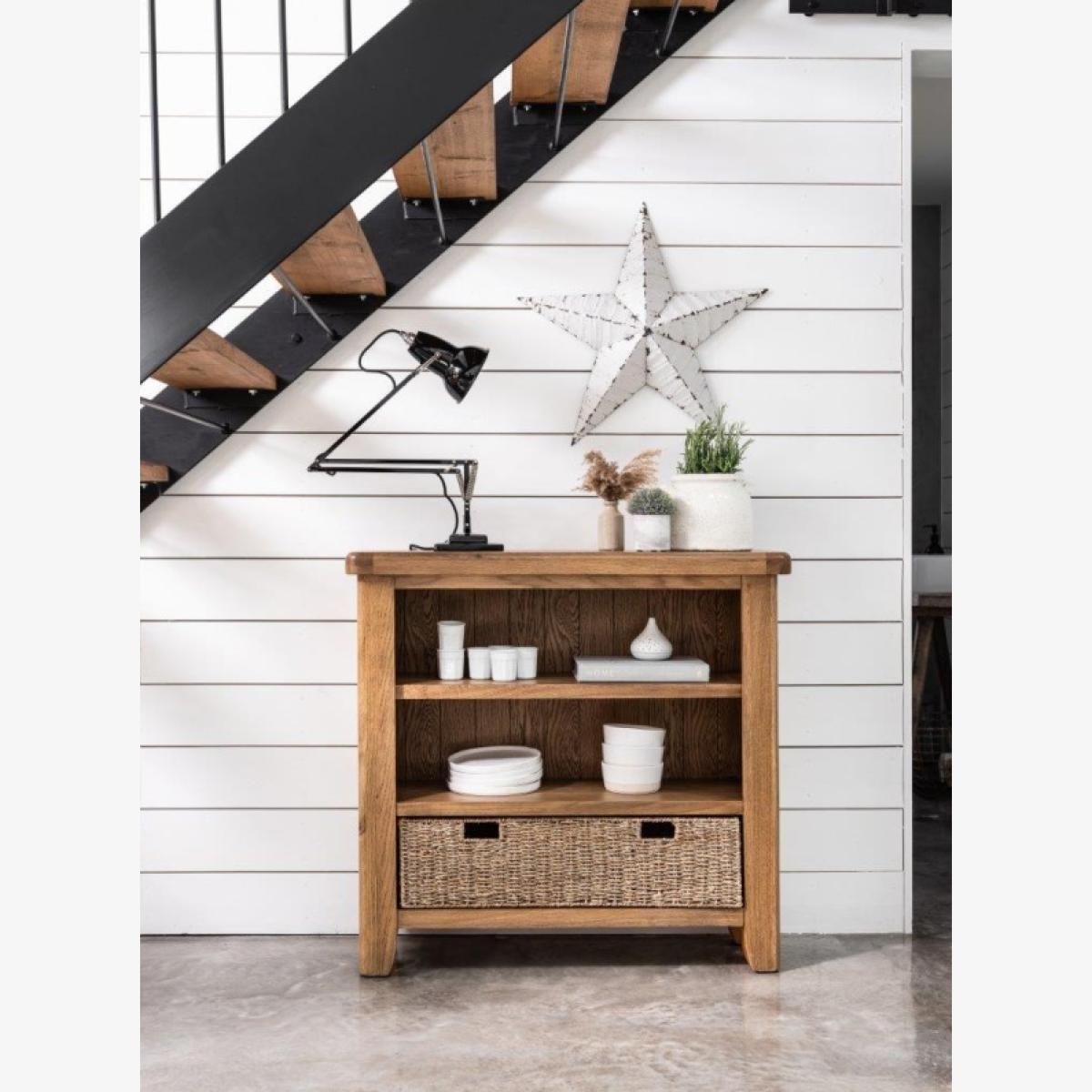 Perfect for a study, living space, or bedroom, the Juniper Small Bookcase in smoked oak offers practical storage with modern farmhouse charm. Its compact design keeps your essentials organised while adding a classic touch to your room. Key Features: Three shelves provide versatile storage for books, décor, or everyday items Includes one large basket, ideal for cables, accessories, or small items Crafted from oak and oak veneers for durability and lasting appeal Complements the Juniper dining and living collection for a coordinated look Delivered fully assembled and includes wall attachment device for safety and stability Dimensions: Height: 90cm Width: 95cm Depth: 30cm All screens vary in colour reproduction and whilst every effort has been made to display the colour as accurately as possible it is for guidance only