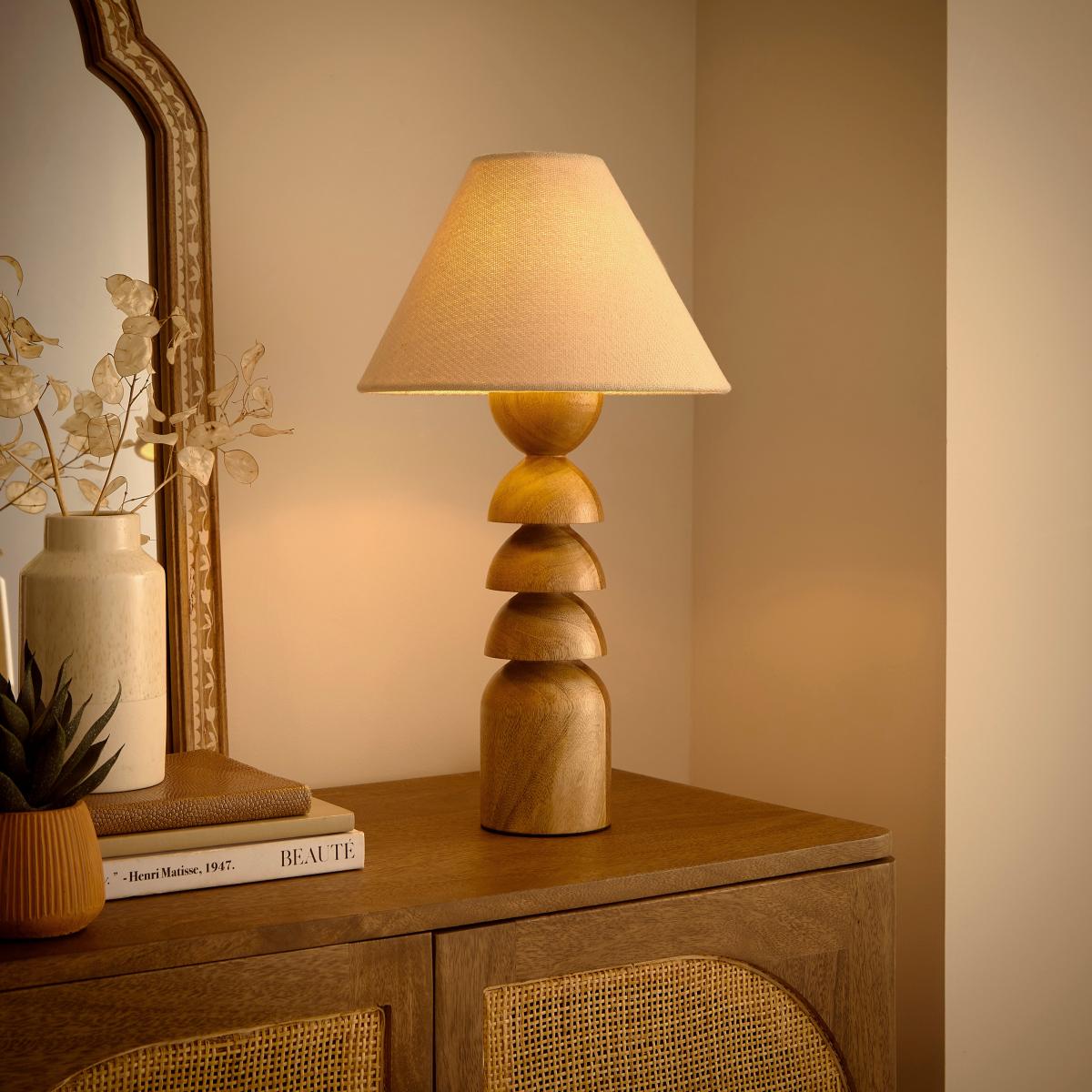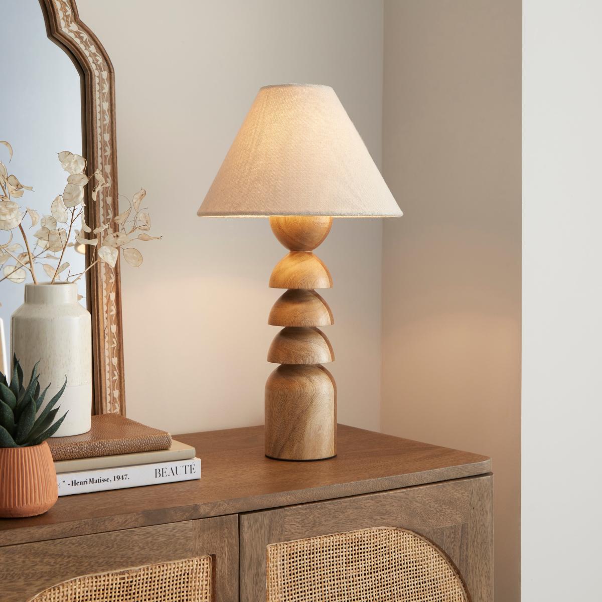 I love this stack of wooden lamp has a sculptural quality that brings warmth and texture to a variety of interior styles. It works particularly well in Scandi, minimalist, or rustic schemes where natural materials are key. To style it effectively, consider placing it on a side table or console with simple accessories to let the lamp stand out as a statement piece. Practically, its layered design adds visual interest without overwhelming, making it suitable for both functional lighting and decorative purposes in living rooms, bedrooms, or even home offices. For added cohesiveness, pair it with other wooden or neutral-toned accessories to create a harmonious look.