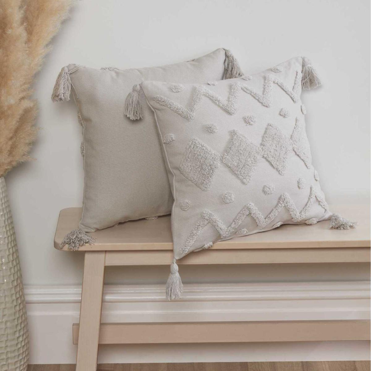 I really like this cushion cover for adding texture and subtle sophistication to a variety of interiors. Its silver tone makes it versatile for both contemporary and boho spaces, especially when paired with neutral or muted colour palettes. The tufted design with tassel detailing enhances tactile interest without overwhelming the space, making it ideal for sofas, armchairs, or even bed styling. For a polished look, consider layering it with other cushions in complementary fabrics or colours, and it works particularly well in living rooms or bedrooms aiming for understated elegance. Practical tip: its 43x43 size makes it a great statement piece on larger seating areas, while its muted hue helps it blend seamlessly into a calm, cohesive scheme.