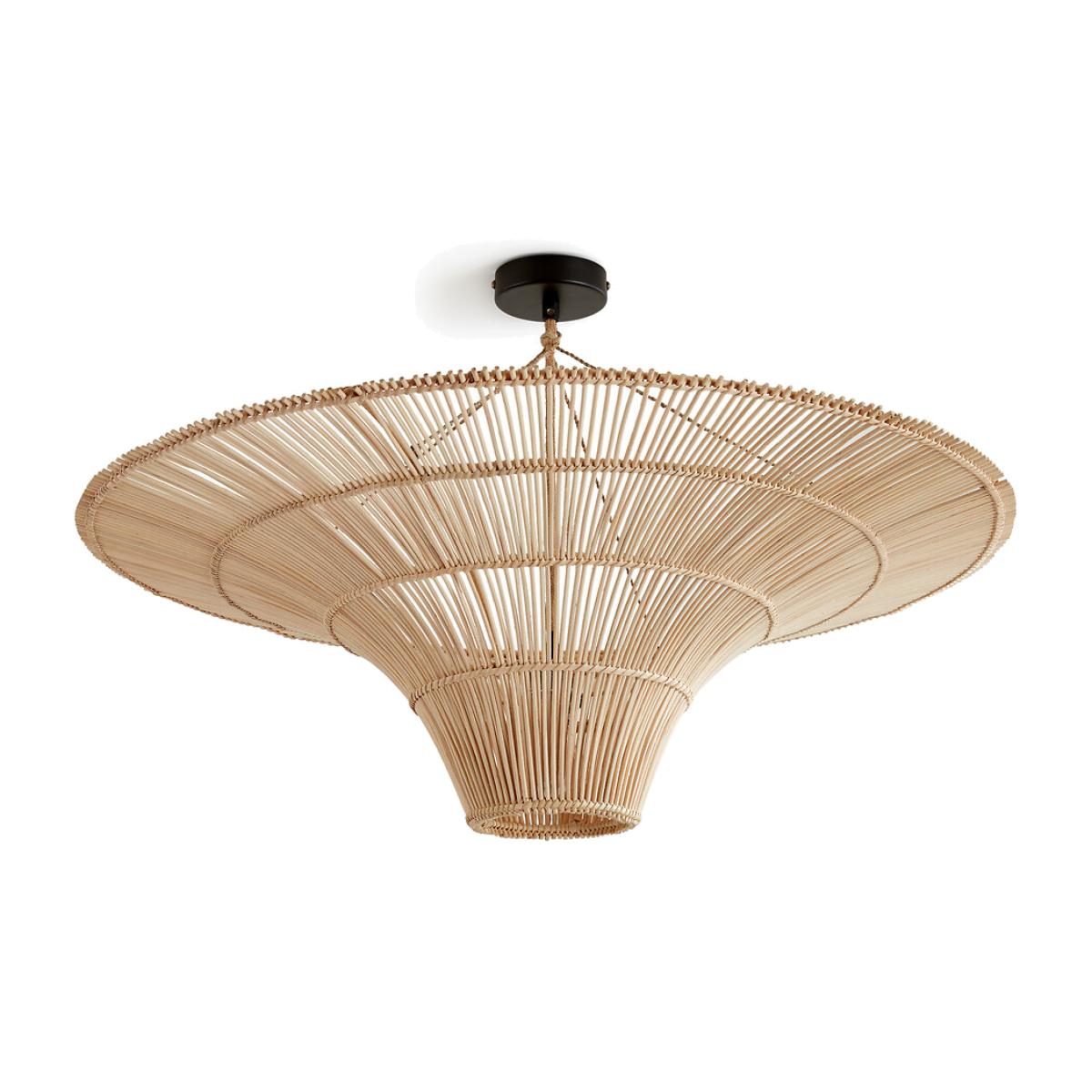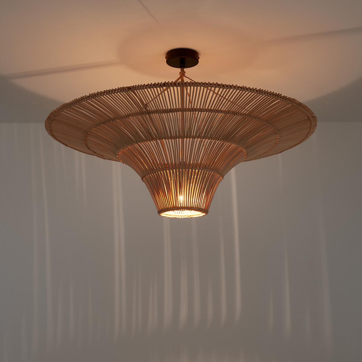 The Junita woven rattan pendant light seduces with its airy design and artisanal spirit. Product Details • In woven rattan • Iron structure covered with epoxy paint • Artisanal craftsmanship • Supports E27 bulb (not supplied) • This product is sold non-electrified, find the Baulind cable sold on the site. Dimensions • Diameter: 80cm • Height: 28cm Parcel dimensions and weight • 1 parcel • L85 x H29.5 x D83.5cm. 4.68kg.