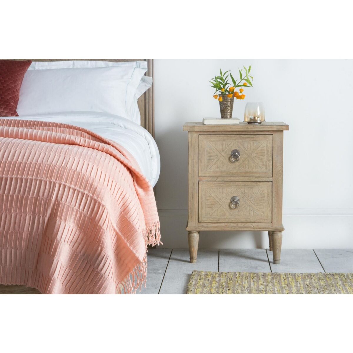 I’m a fan of the Juno bedside for its pared-back, slightly weathered oak finish and subtle carved detailing - it brings a relaxed, lived-in feel without looking fussy. It works especially well in Scandi-inspired or modern-rustic bedrooms, but equally sits comfortably in a traditional scheme as a soft contrast to sleeker bedframes. For practical styling, top it with a slim-profile lamp to free up surface space, then layer a small tray for your watch and a ceramic pot for loose change. If you want a pop of colour, tuck in a folded linen runner under a stack of books or a framed photo. The two drawers are perfect for stashing bedside essentials, keeping surfaces clear and your bedtime routine streamlined.
