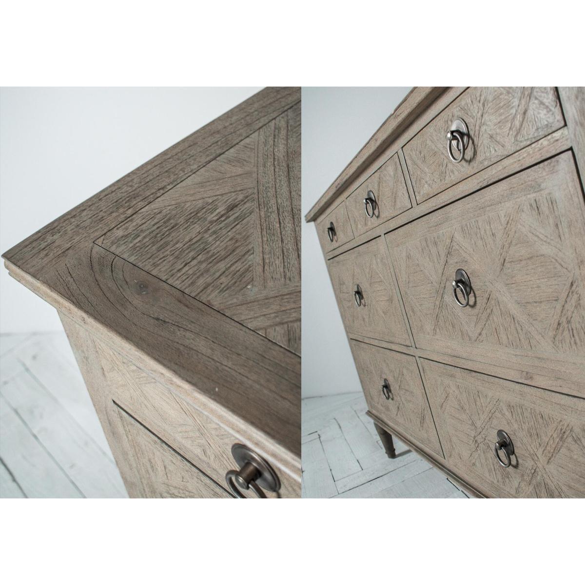 Give your clothes a stylish space to rest with the beautiful Juno chest of drawers. Crafted from silky Mindy wood, this clean-lined design has seven spacious drawers with metal handles to accommodate clothes, bed linen and home textiles. Beautiful marquetry detailing decorates its drawers and top surface while adding an organic feel to the piece. The Juno is ideal for those looking to revamp their bedroom - simply top it with a colourful vase and combine it with the matching bedroom pieces to create a suite that is a grand style statement in its very own right.