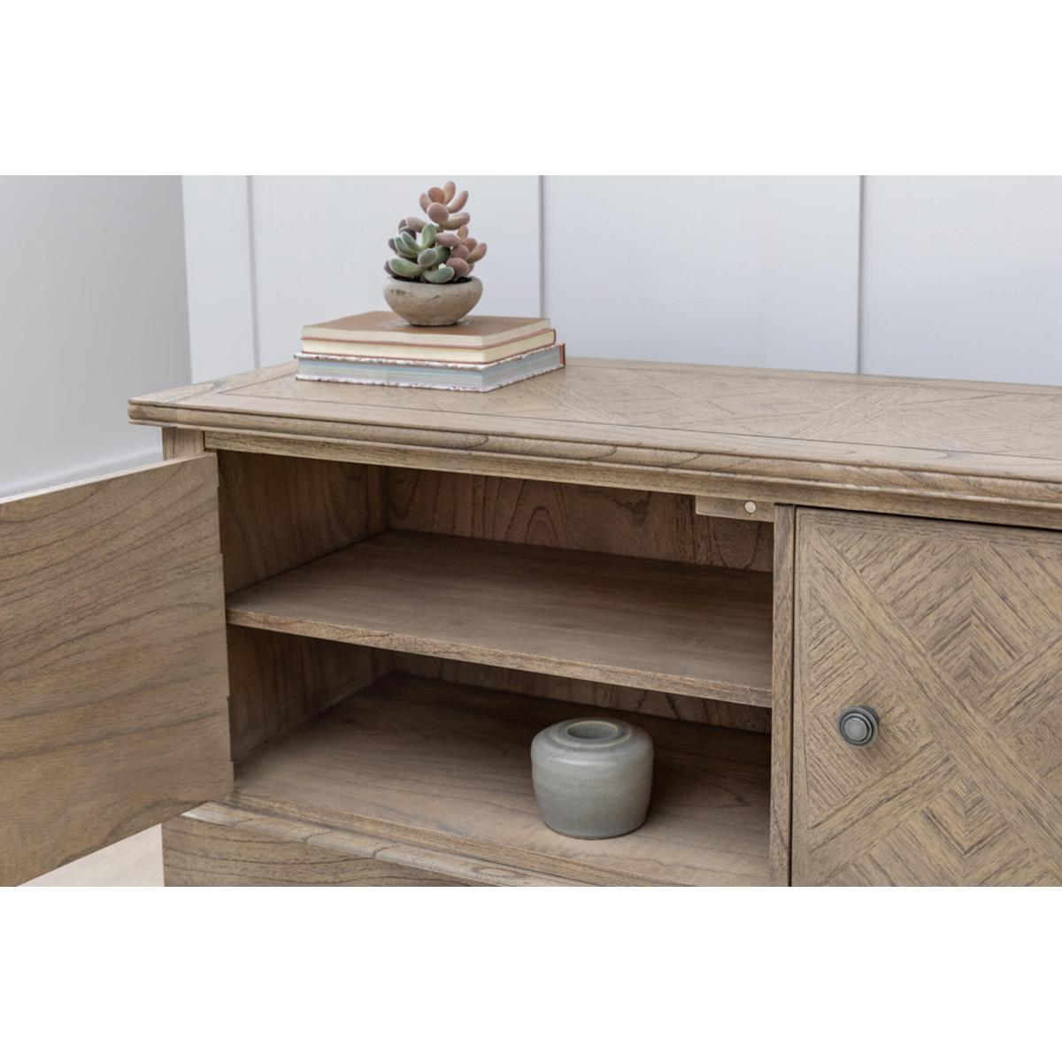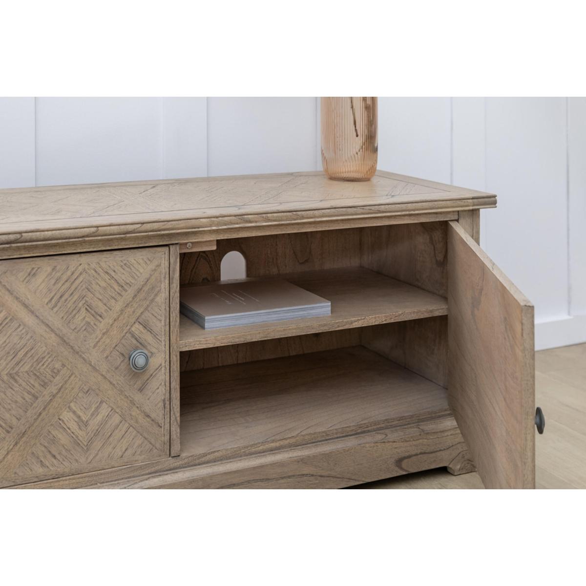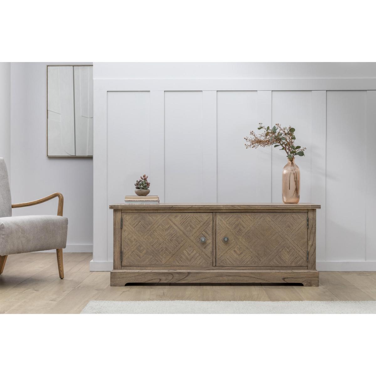 I love this grey-washed TV unit for its subtle chevron-style door panels and solid feel - it adds texture without overwhelming a space. It’s ideal for Scandi, coastal or modern-farmhouse interiors where pared-back colour schemes and natural materials take centre stage. To keep it practical, route your cables neatly through the back and store remotes or games controllers in slimline baskets behind the doors. On top, try a low-profile TV stand or a pair of slim vases either side of your screen, then finish with a small stack of art books or a simple table lamp to balance the look.