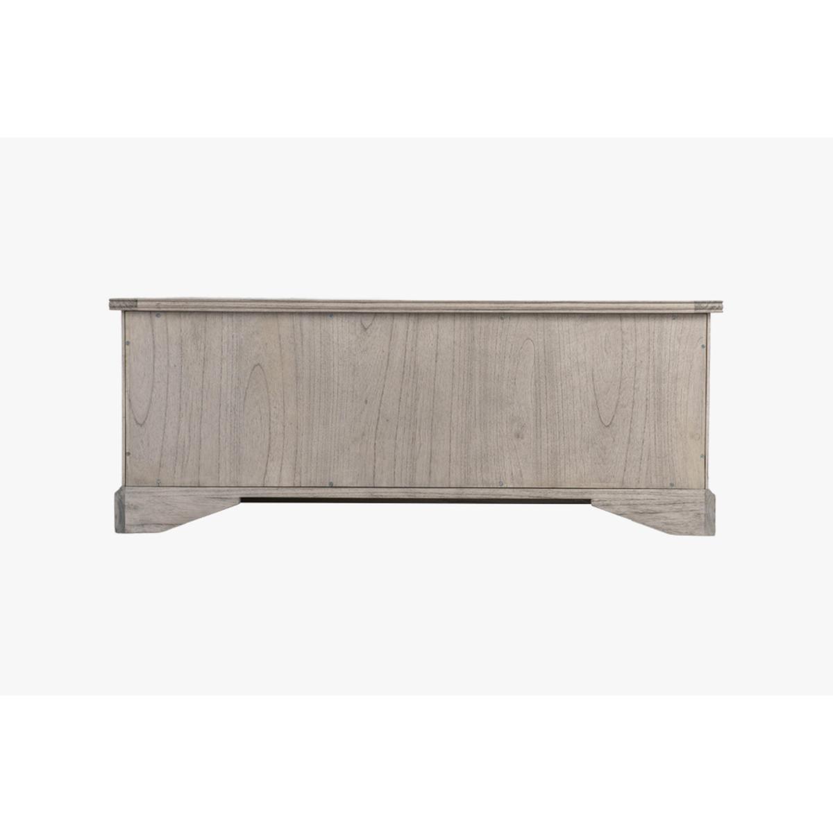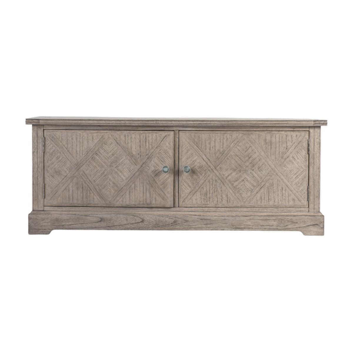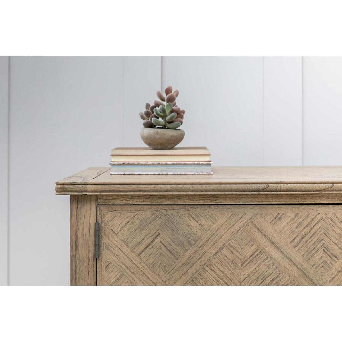 I love this grey-washed TV unit for its subtle chevron-style door panels and solid feel - it adds texture without overwhelming a space. It’s ideal for Scandi, coastal or modern-farmhouse interiors where pared-back colour schemes and natural materials take centre stage. To keep it practical, route your cables neatly through the back and store remotes or games controllers in slimline baskets behind the doors. On top, try a low-profile TV stand or a pair of slim vases either side of your screen, then finish with a small stack of art books or a simple table lamp to balance the look.