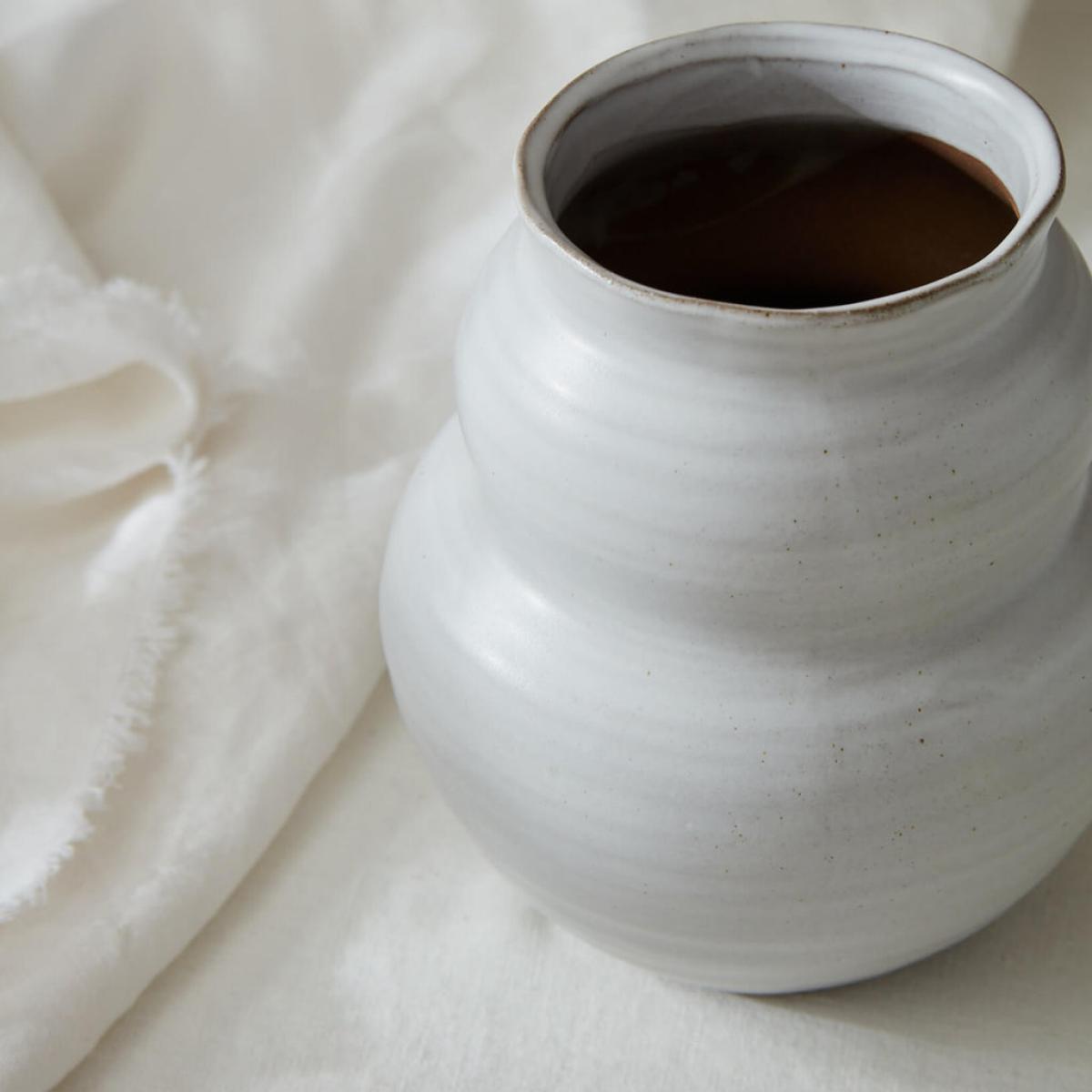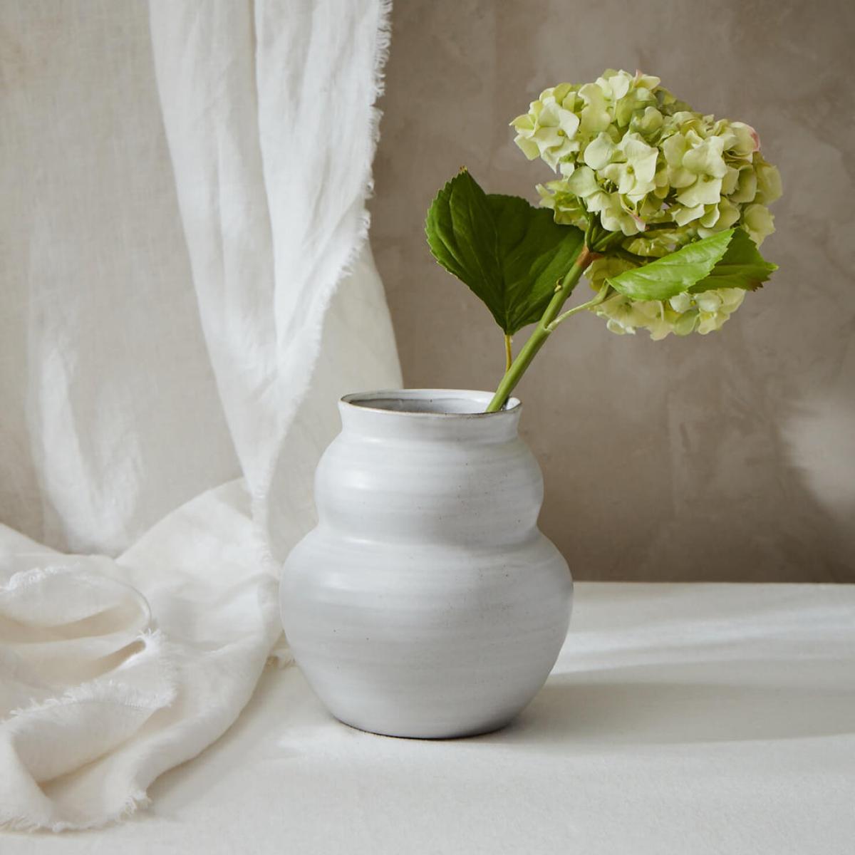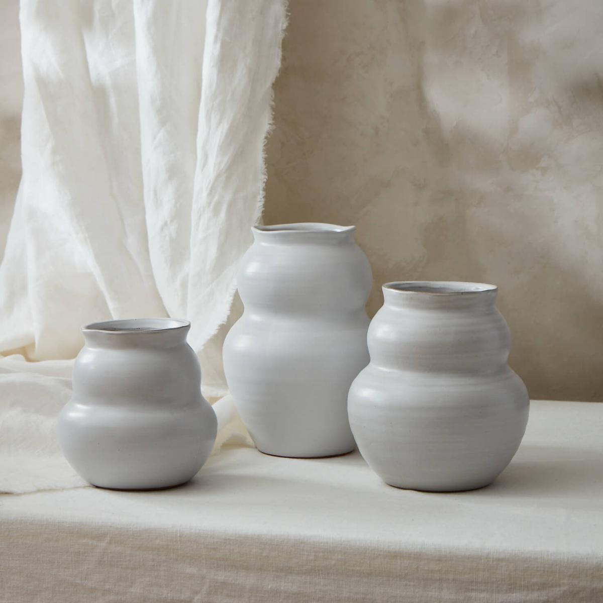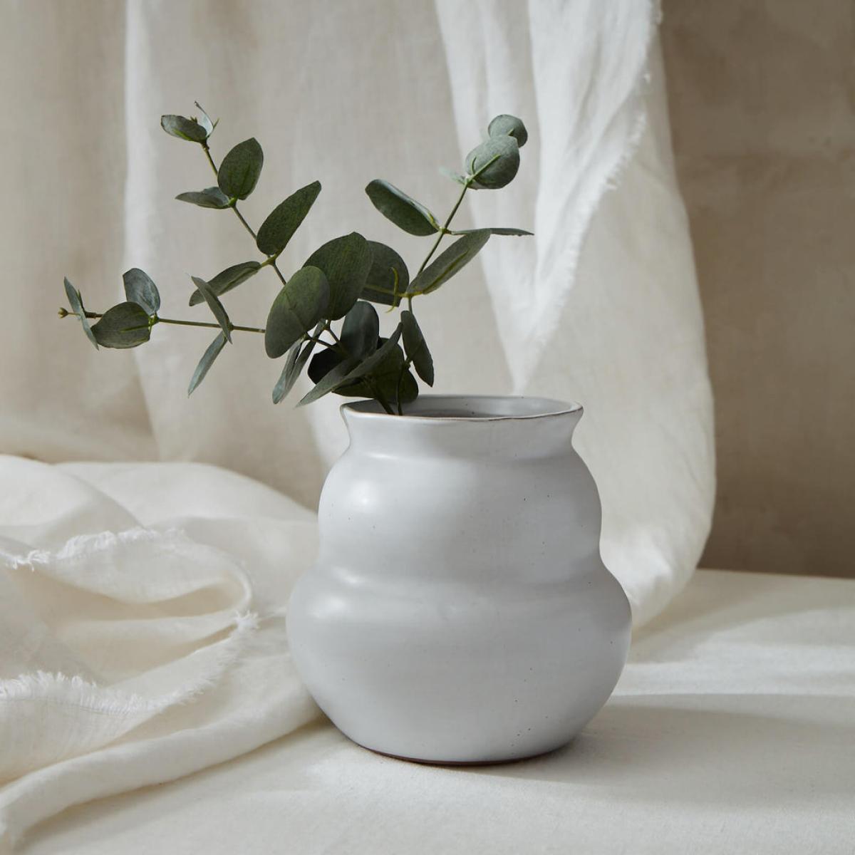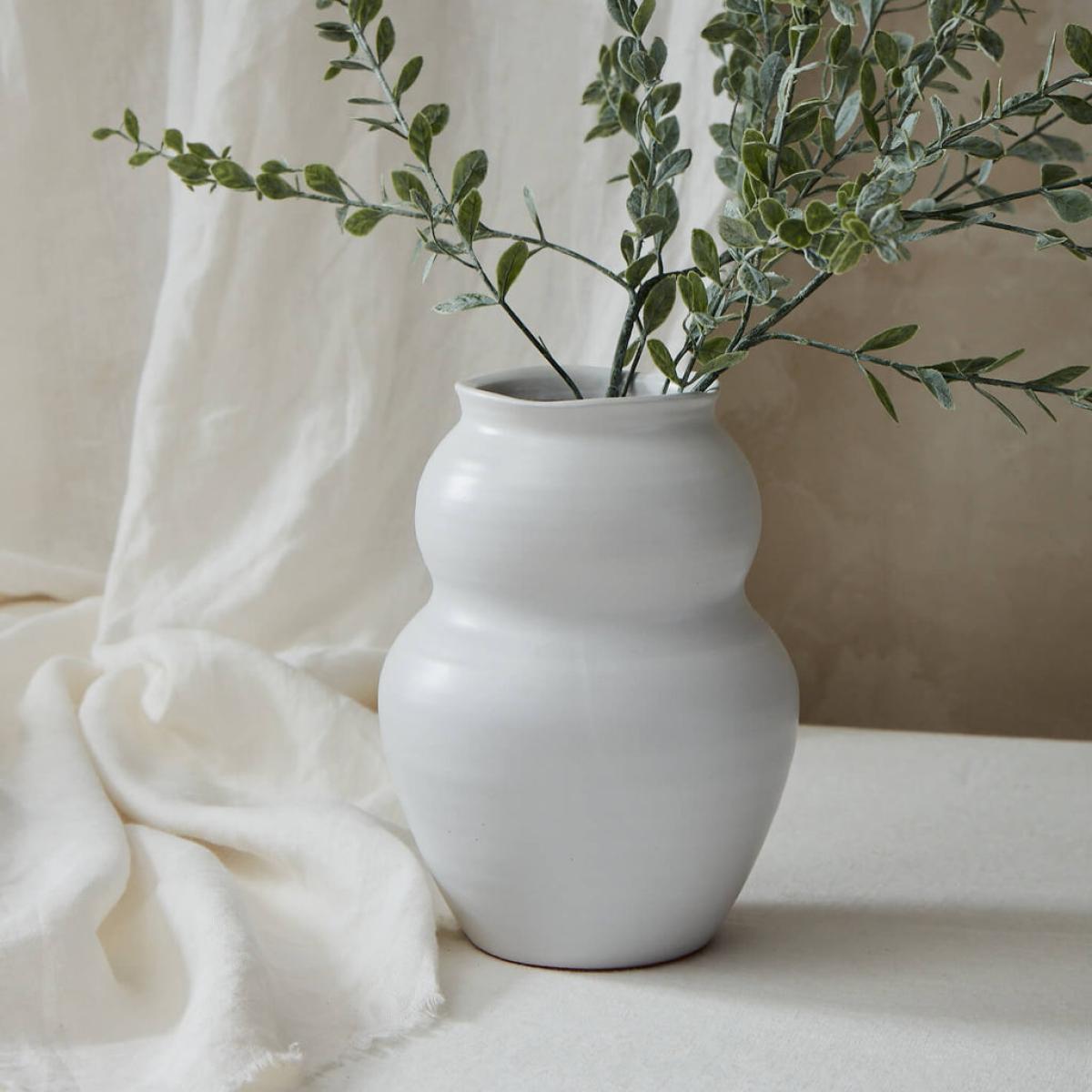 This organic shaped vase is made of clay and has been given a soft white glaze finish. Handmade it has an earthy appeal and each piece will be slightly unique. With a beautiful curvature ensure this takes pride of place on your sideboard or table. Available in 3 different sizes, they make fabulous shelf pieces even when empty or style with seasonal faux, fresh or dried flowers to complete the look.