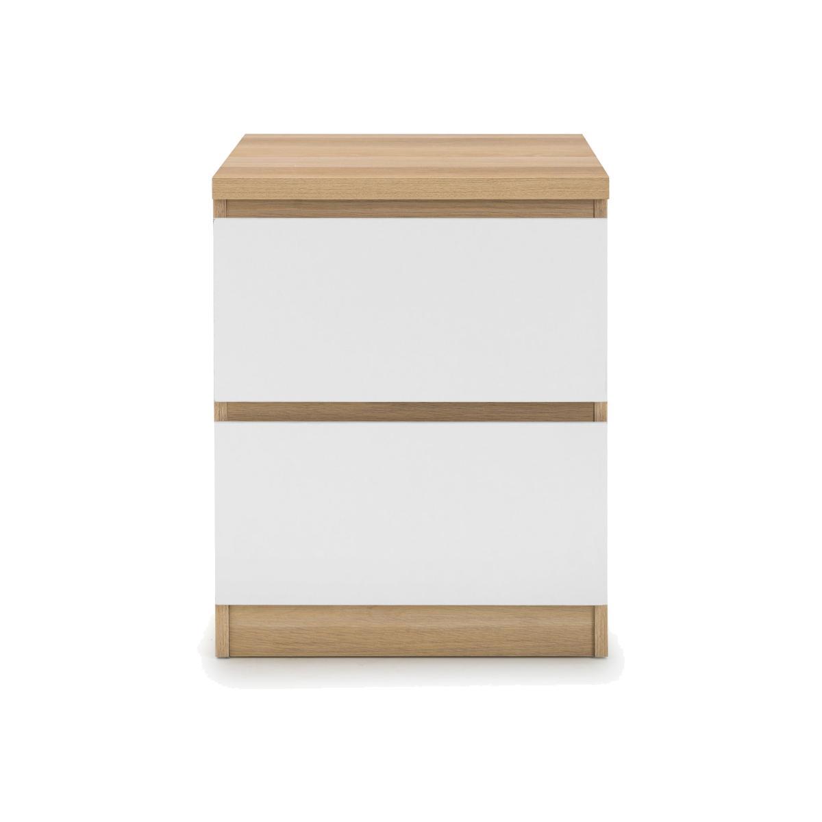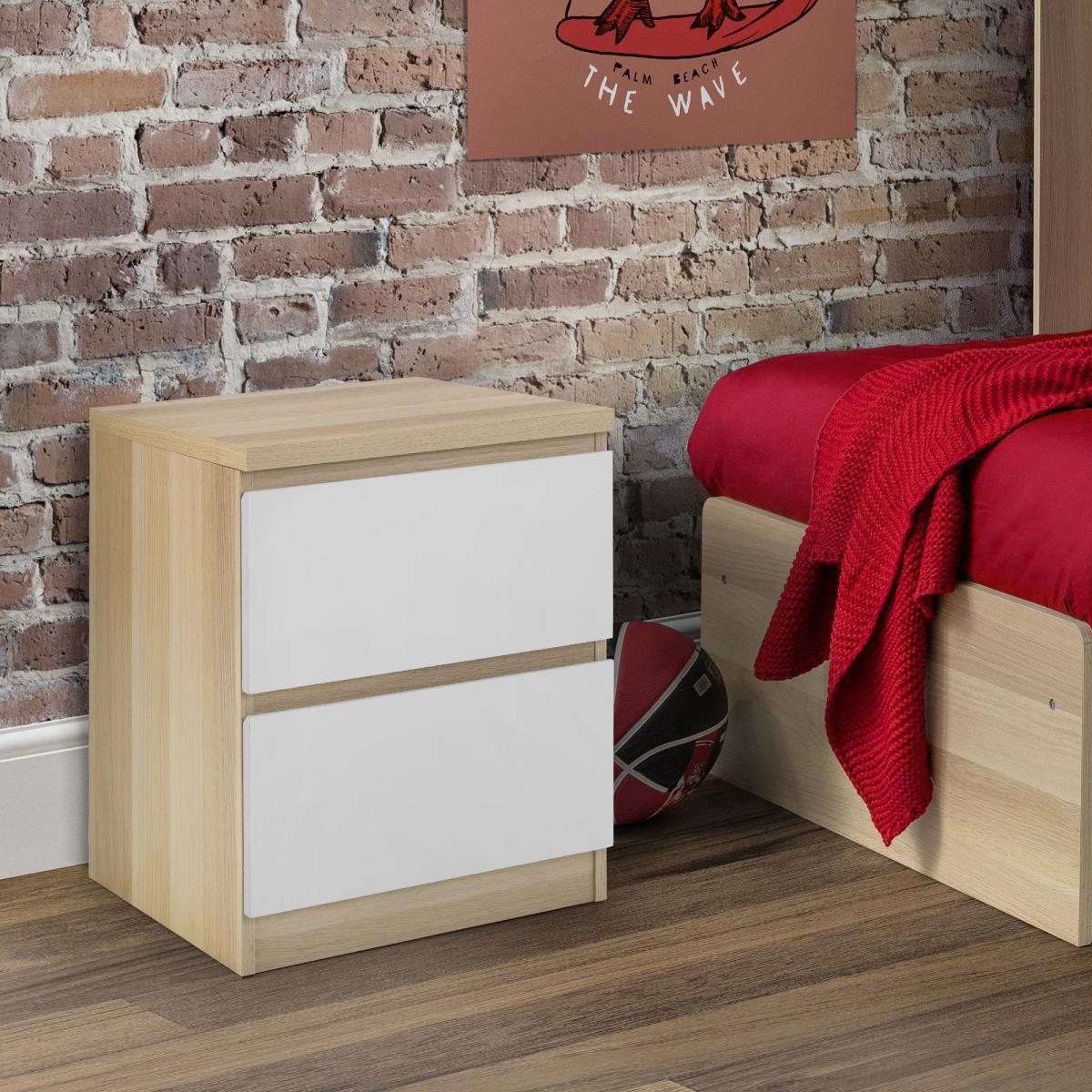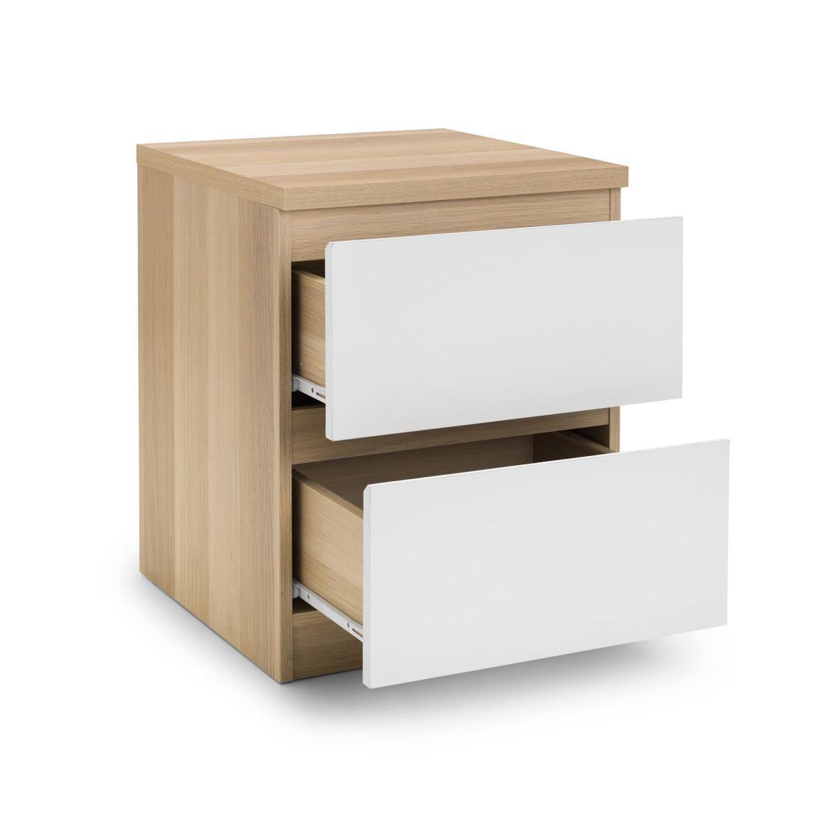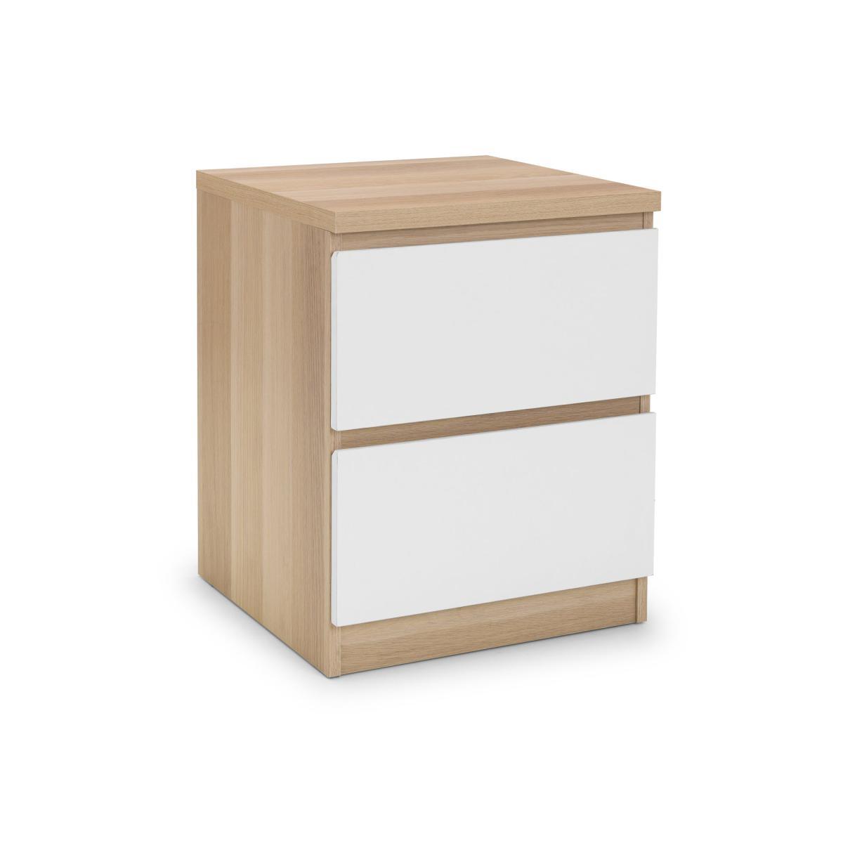 Perfect for adding a sleek, contemporary fininsh to any modern bedroom, the Jupiter bedside table features contemporary white high gloss drawer fronts and an oak effect frame. This self-assembly bedside table comes complete with two spacious, handleless drawers for a flawless finish.