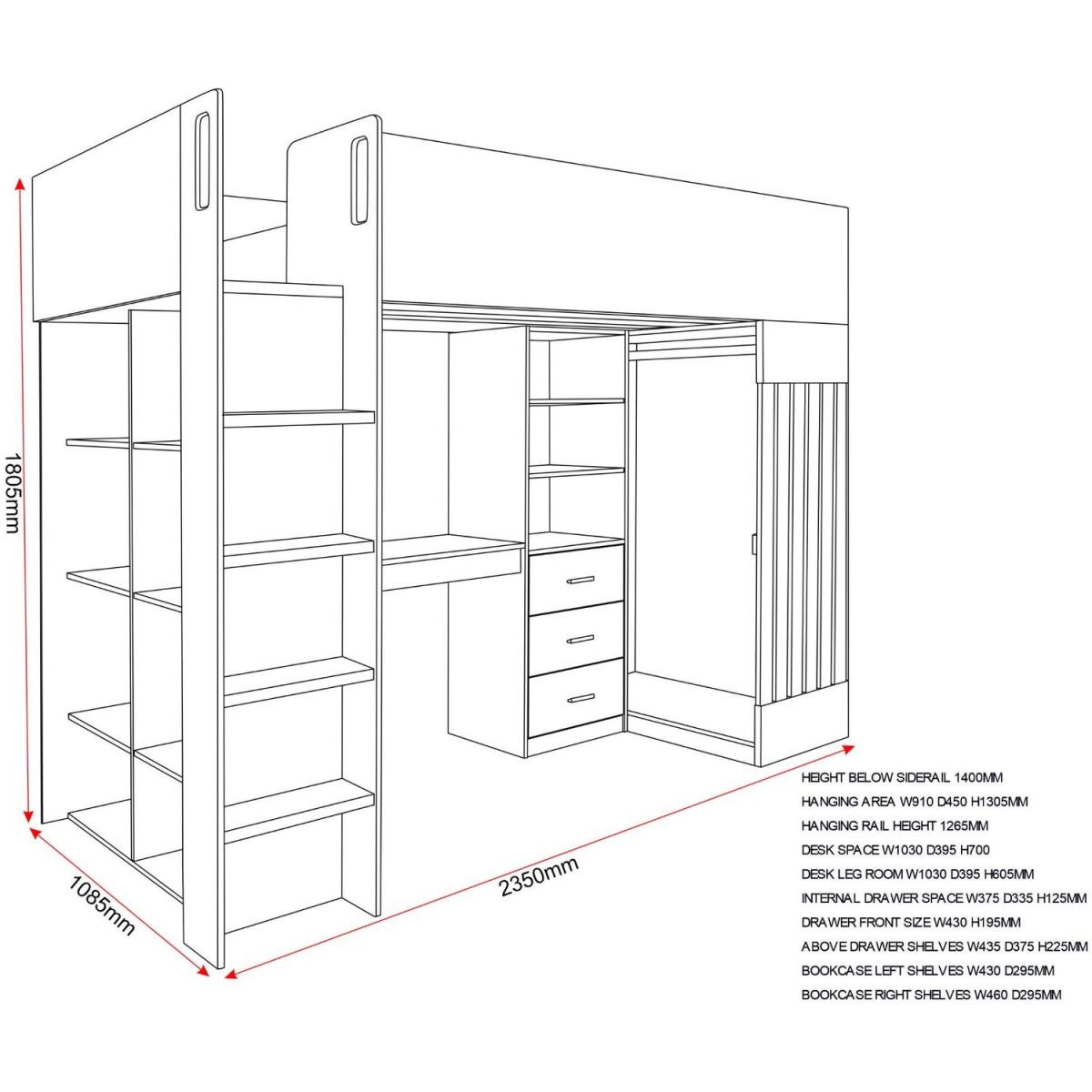 A perfect modern solution to space issues. This Jupiter high sleeper is equipped for all your child's needs, from a comfortable bed, working space at a desk, storage for clothes, books and toys, an all round great addition to any bedroom. UK Mainland delivery only, between 9am - 9pm (weekdays) the courier will contact you on the day of delivery to offer a time slot. This takes place within 10 working days (Ground floor only). Please also ensure that we have a note of your up-to-date address and contact information, including daytime phone number and email address to be passed to the couriers.