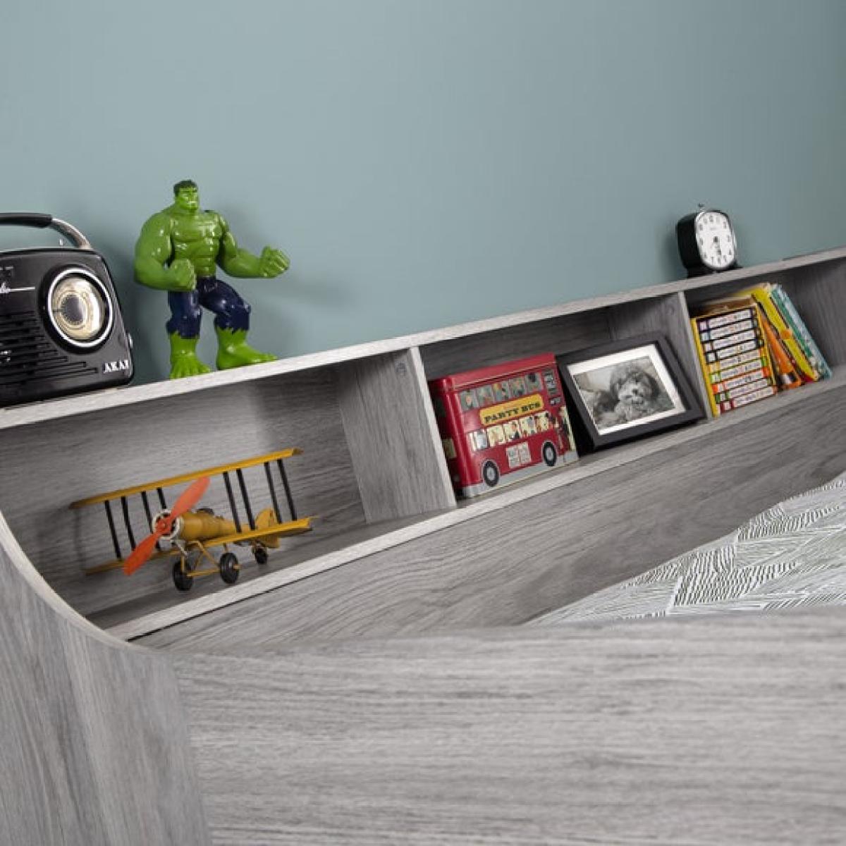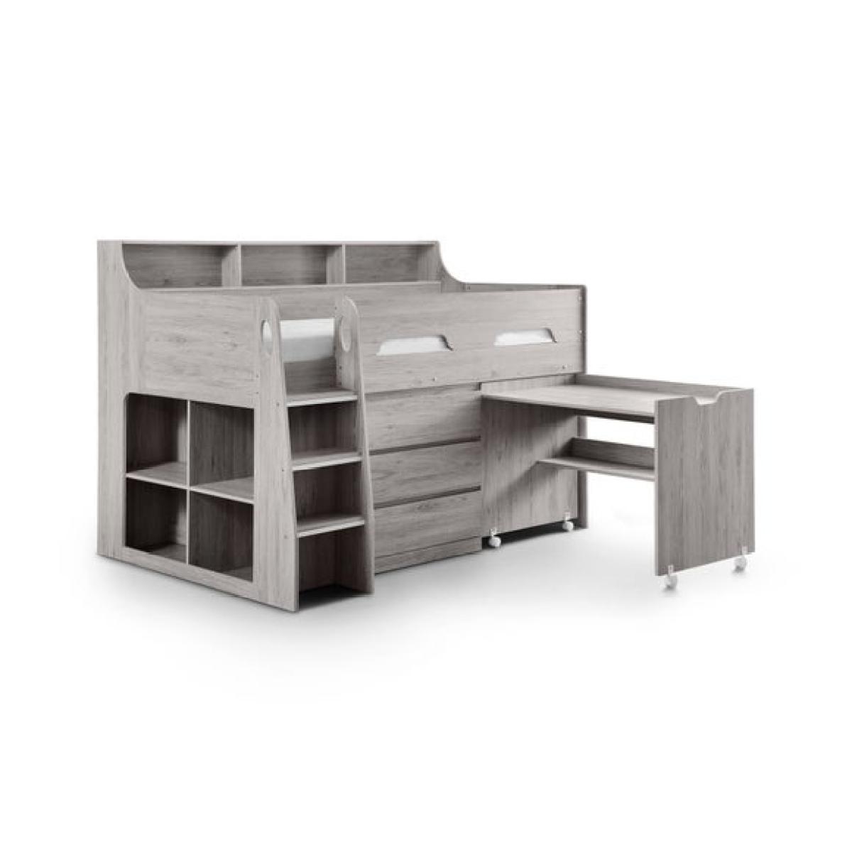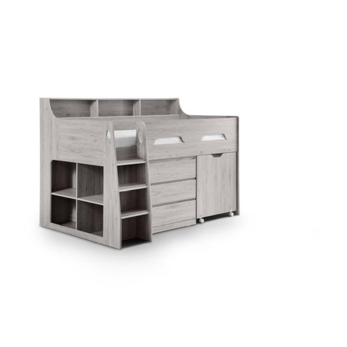 * Modern children's bed * Optimal storage * Sleek finish The Jupiter midsleeper is a clever space-saving solution that’s ideal for kids’ bedrooms. It features a built-in chest of drawers, open shelving, and a pull-out desk, offering plenty of room for storage, study, and display. The robust ladder includes cut-out handles and glow-in-the-dark strips for added safety and fun. With its clean lines and practical layout, Jupiter helps keep clutter under control while creating a fresh, modern environment that encourages creativity and independence.