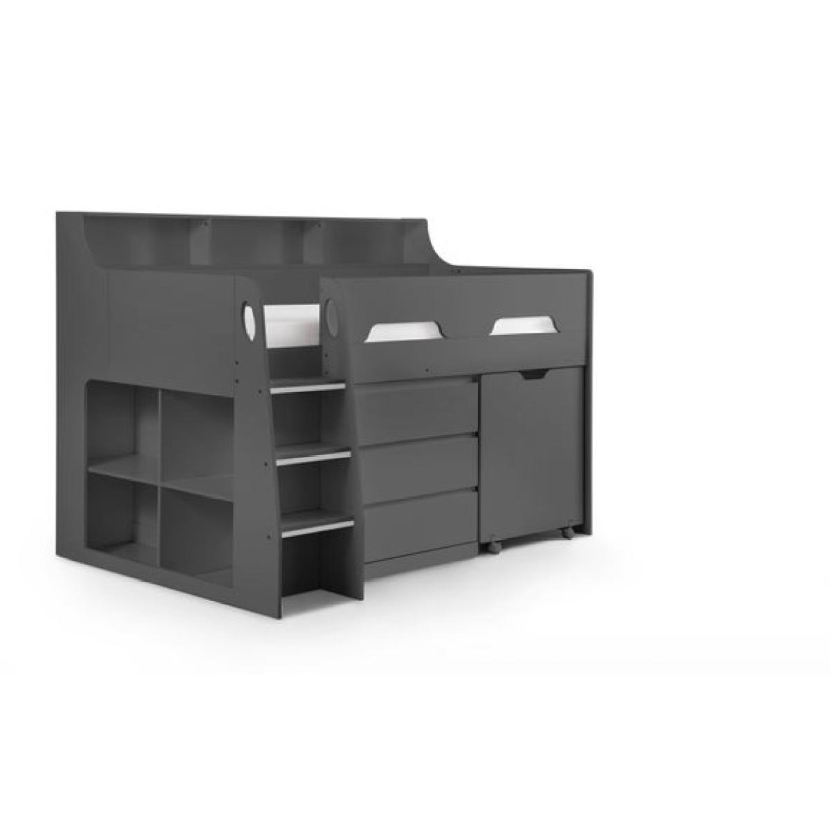 * Modern children's bed * Optimal storage * Sleek finish The Jupiter midsleeper is a clever space-saving solution that’s ideal for kids’ bedrooms. It features a built-in chest of drawers, open shelving, and a pull-out desk, offering plenty of room for storage, study, and display. The robust ladder includes cut-out handles and glow-in-the-dark strips for added safety and fun. With its clean lines and practical layout, Jupiter helps keep clutter under control while creating a fresh, modern environment that encourages creativity and independence.