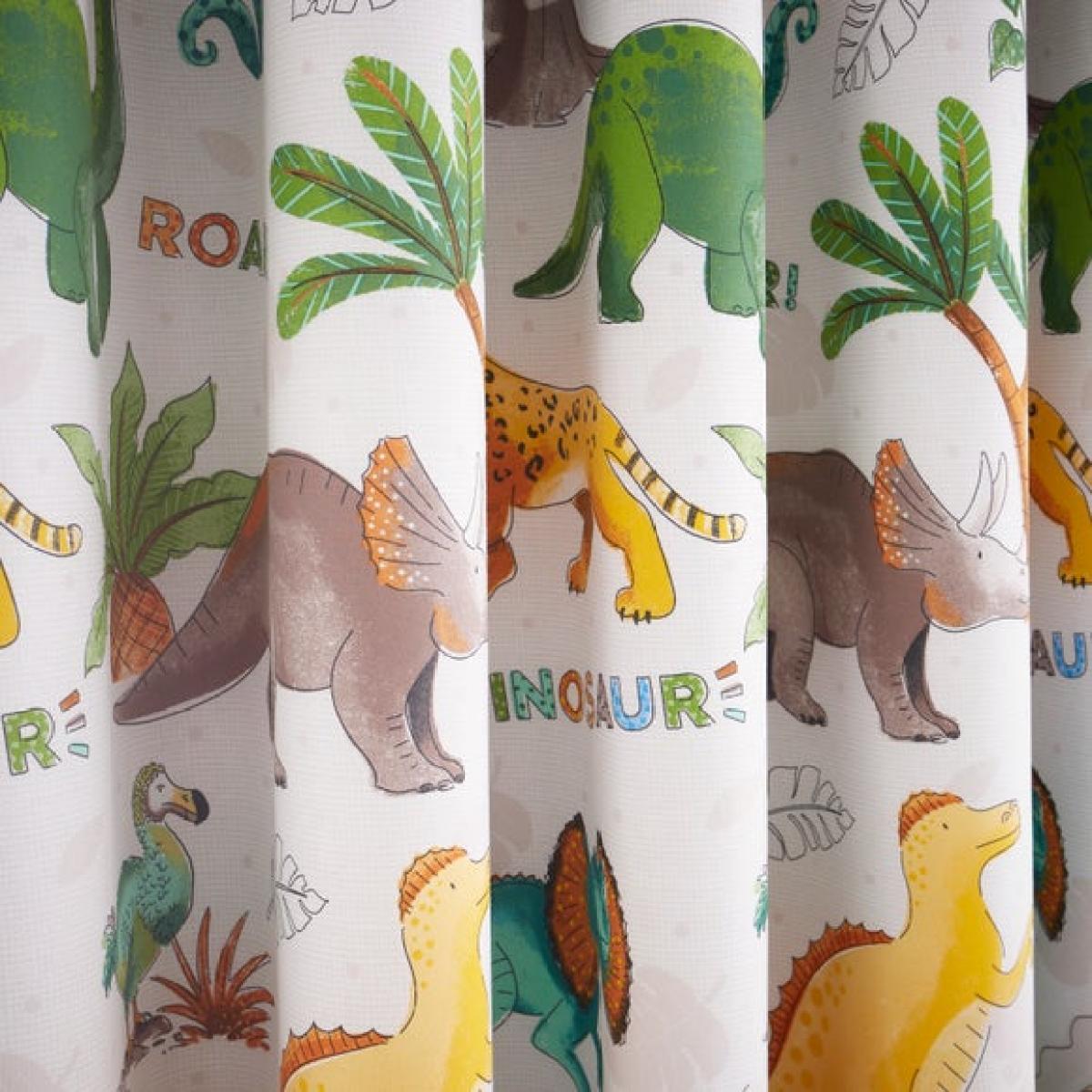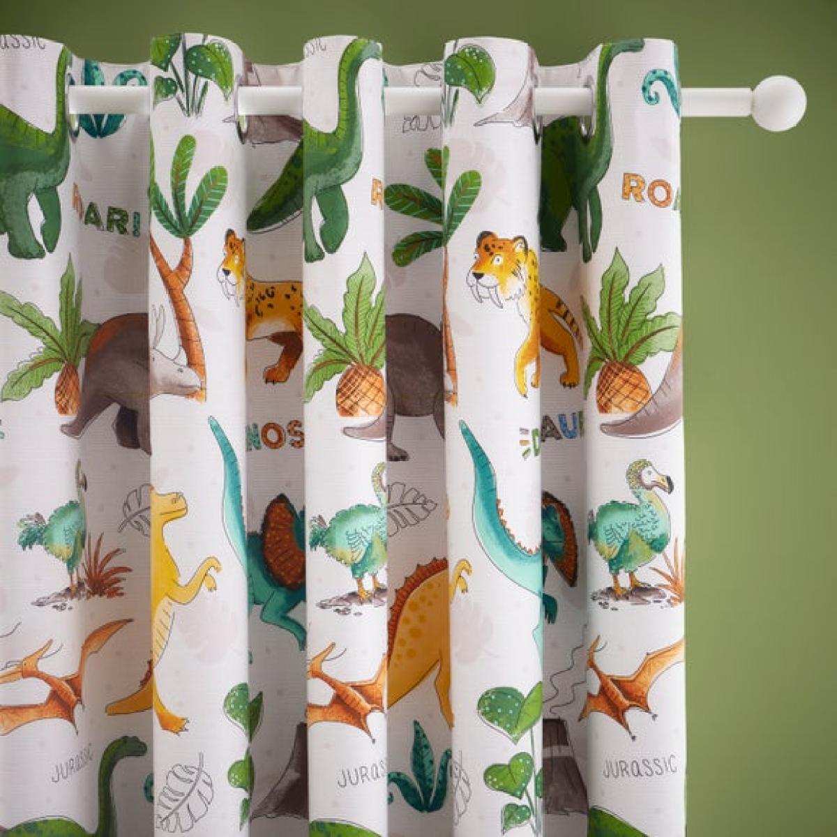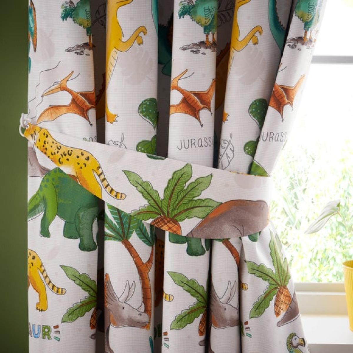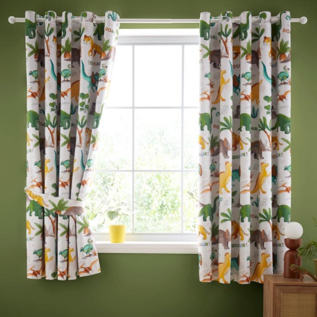 * Blackout lined * Fun dinosaur design * Tiebacks included * Bring the land before time to their bedroom with these Jurassic Dinosaur Blackout Eyelet Curtains. Featuring a roarsome dinosaur design, they’re perfect for little explorers who love all things prehistoric. The blackout lining helps keep the room dark and cosy—ideal for naps, lie-ins, and early nights. Made from easy-care fabric, they’re practical for everyday life and machine washable too. Eyelet headers make them simple to hang, and tiebacks are included to complete the look. A dino-mite finishing touch for a Jurassic-inspired room.