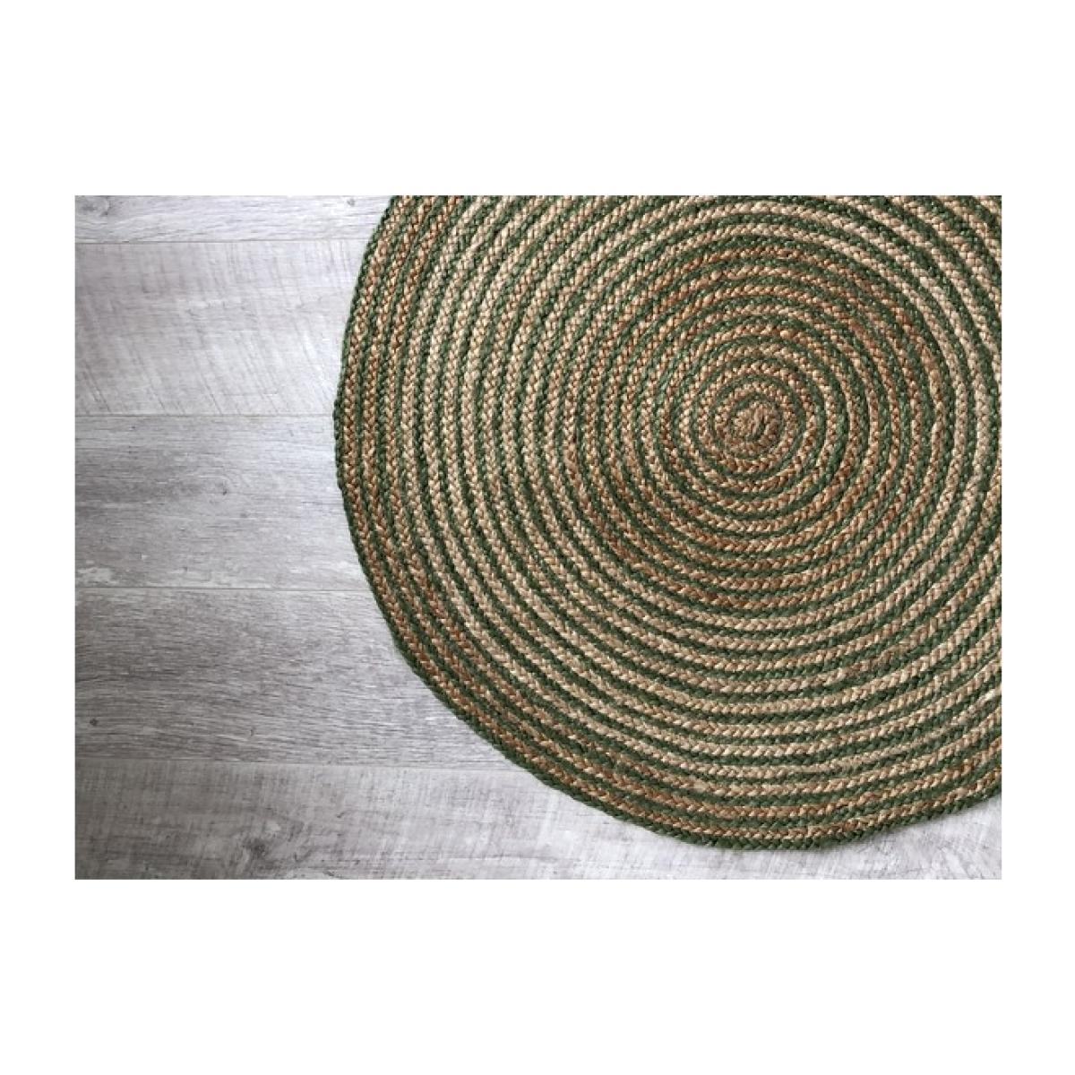 Modern round spiral jute rug natural texture and green spiral weaved jute would look good in any room. The natural sustainable jute fibre is ideal for floor covering given its strength and durability, making it resilient for high traffic areas. 95% Jute, 5% Cotton