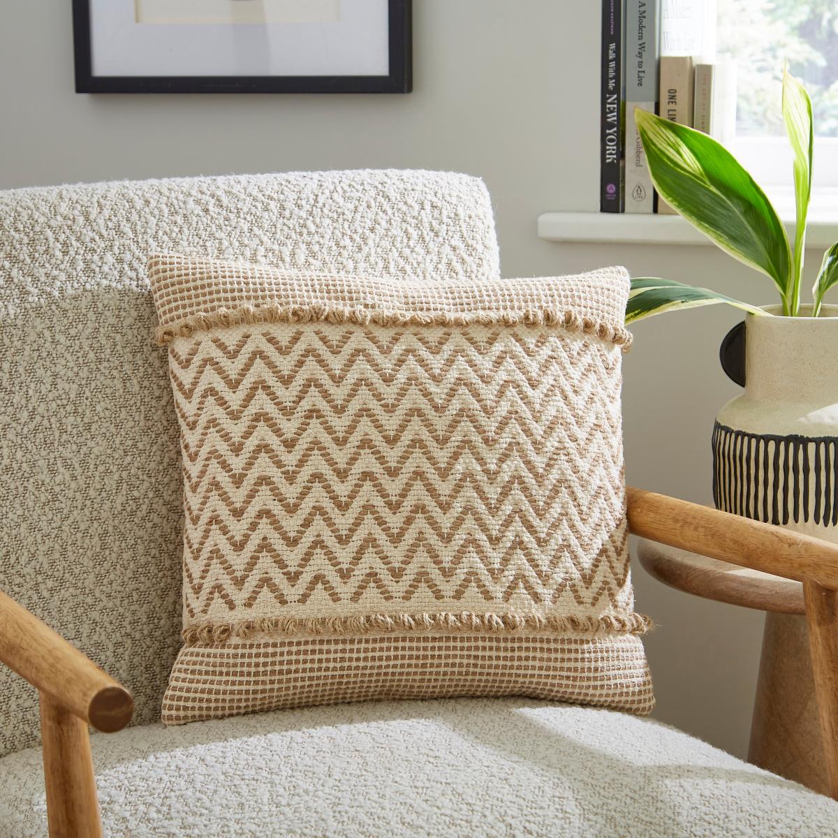 I love this one for its versatile texture and understated colour that works well in both contemporary and bohemian interiors. The zig zag pattern adds visual interest without being overwhelming, making it a great accent cushion for sofas or beds. It's particularly effective layered with other neutrals or natural fibres-think linen or rattan-to create a cosy yet stylish look. For practical styling, try pairing it with similarly textured cushions in complementary shades for a layered, relaxed vibe. Given its earthy tone and tactile appeal, it’s ideal for bringing warmth and a subtle pattern to living rooms or chill-out spaces.