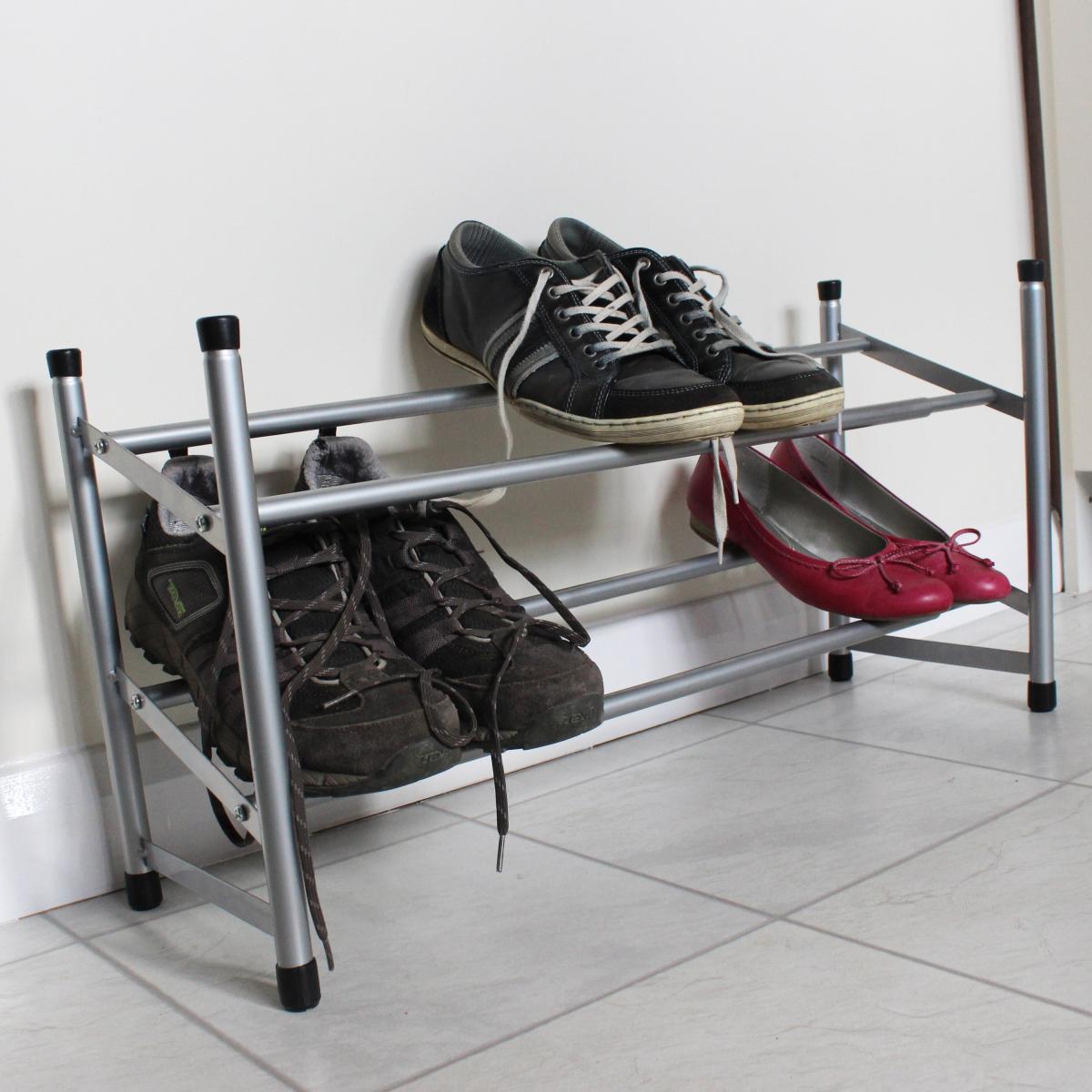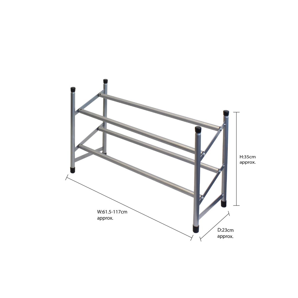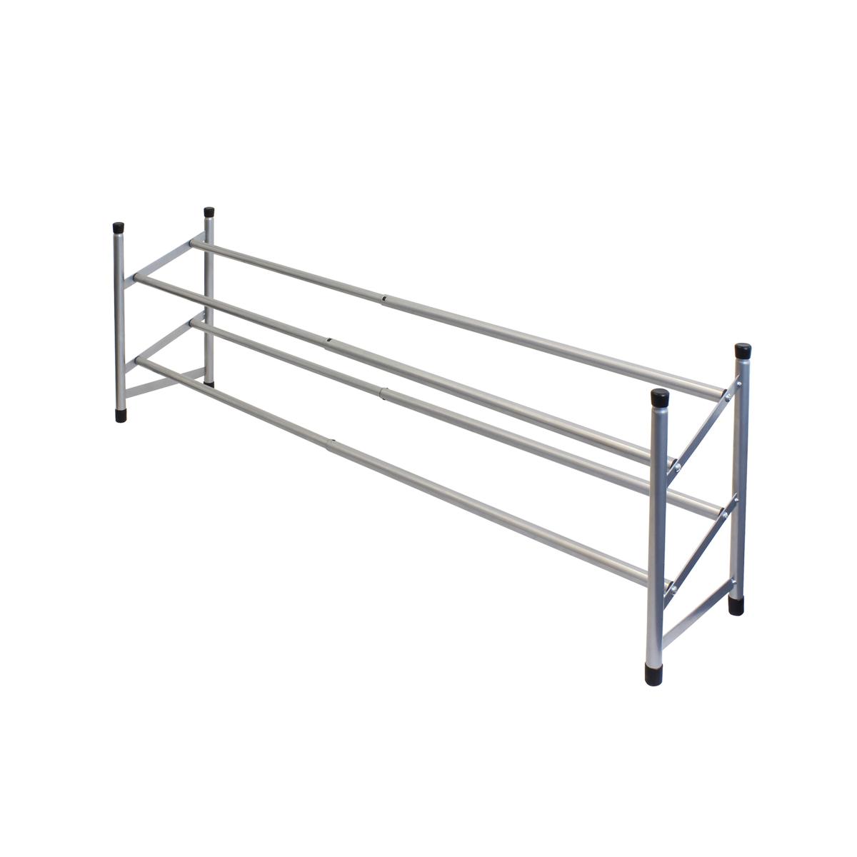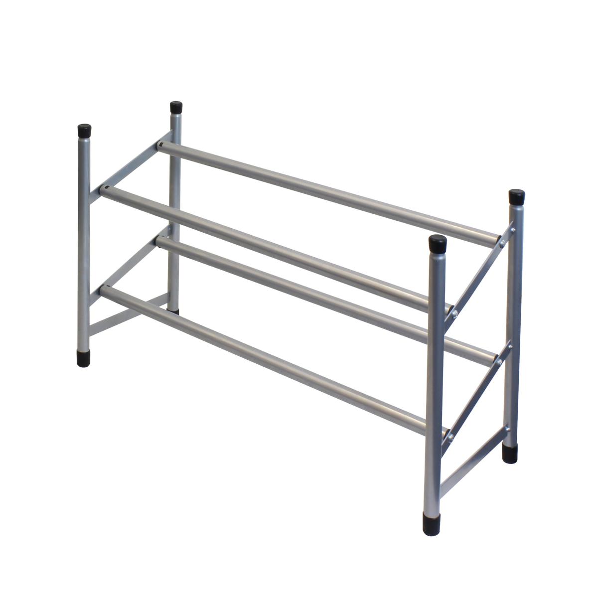 Say goodbye to cluttered hallways, rooms and entryways and hello to a clean and organized home with this sleek and functional shoe rack! This two tier extendable shoe rack is perfect for keeping your footwear organized and tidy in any room of the house as this stylish storage unit can hold up to 10 pairs of shoes. With a powder coated grey metal frame and protective rubber feet, this shoe rack is both durable and easy to maintain.
