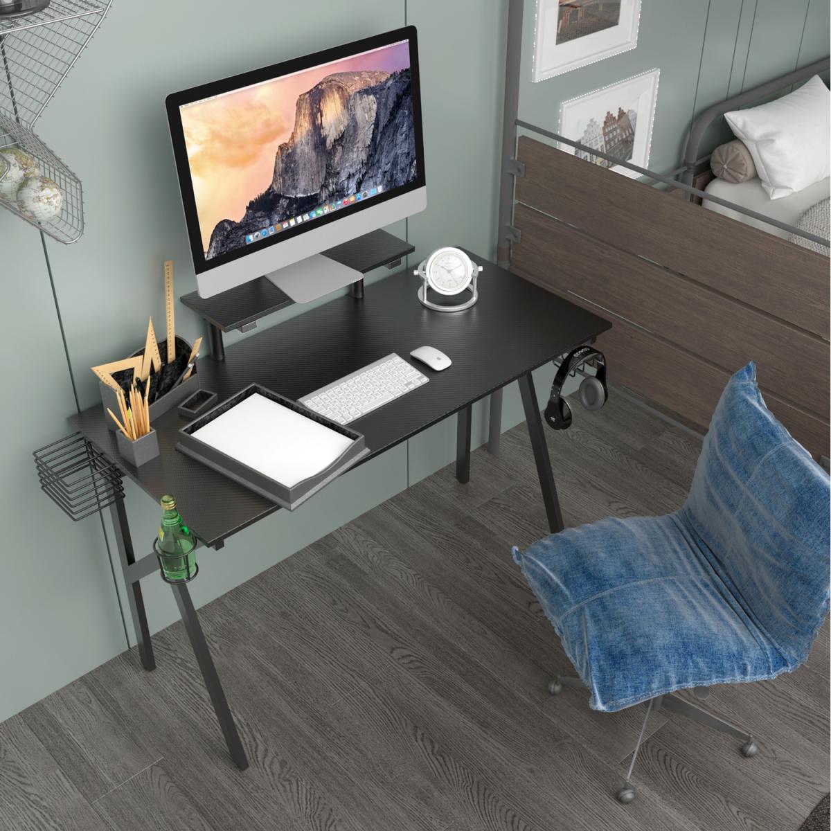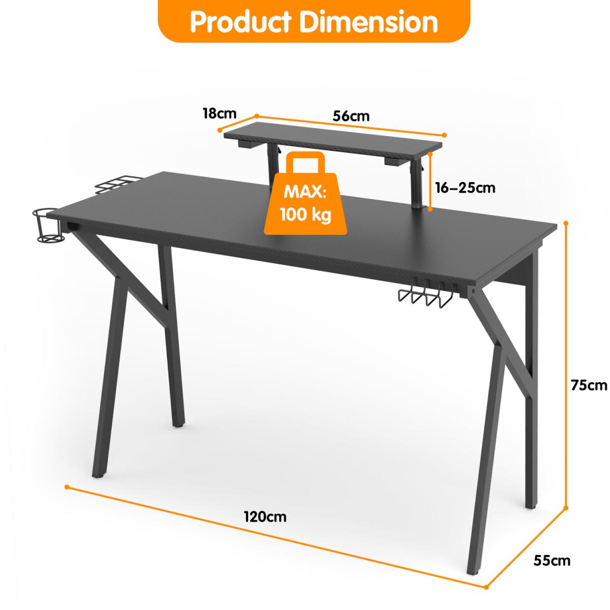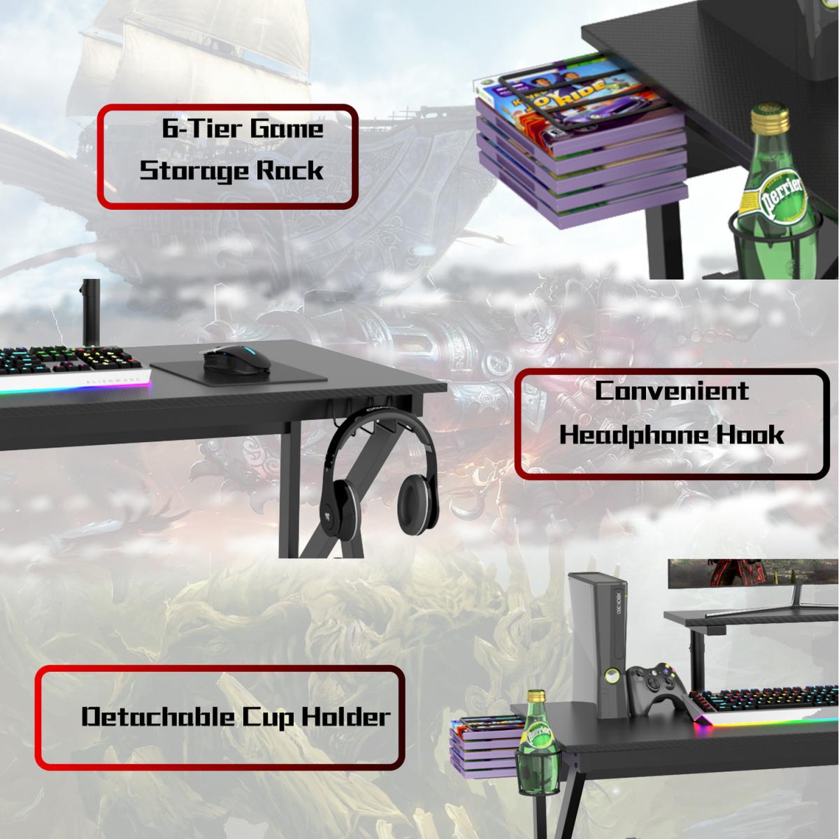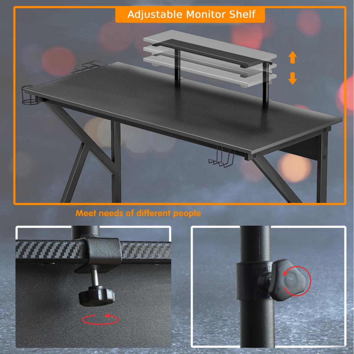 Our gaming desk offers a contemporary style that adds a touch of sleek sophistication to any home office, dorm room or bedroom. Designed with a rock-solid K-shape construction, this gaming desk is sturdy and durable. High-tech carbon fiber laminated tabletop and raised shelf provides ample space for your monitor, keyboard, laptop and other supplies. Our gaming desk is loaded with a lot of added convenient features to help you to have a gaming experience soar.