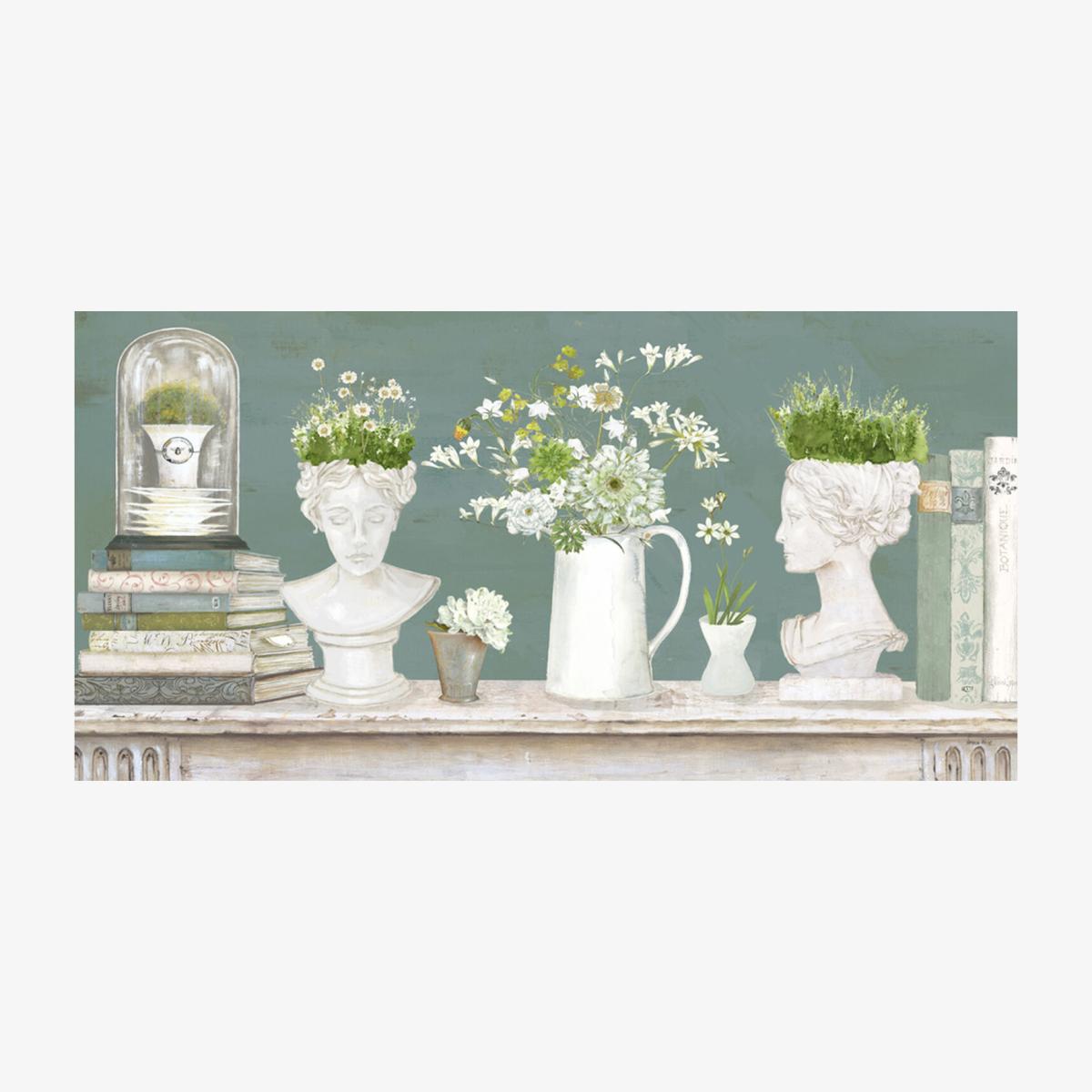 The K.White Fresh Floral Collection Canvas has a traditional, shabby chic feel with elegant tones of green, blue, and white. The artwork features vintage bust vases, stacks of books, and charming white florals in vases to create the impression of a gorgeous shelf. The canvas is a wonderful centrepiece for the living room, hallway, or bedroom, helping to brighten any area of your home with ease.