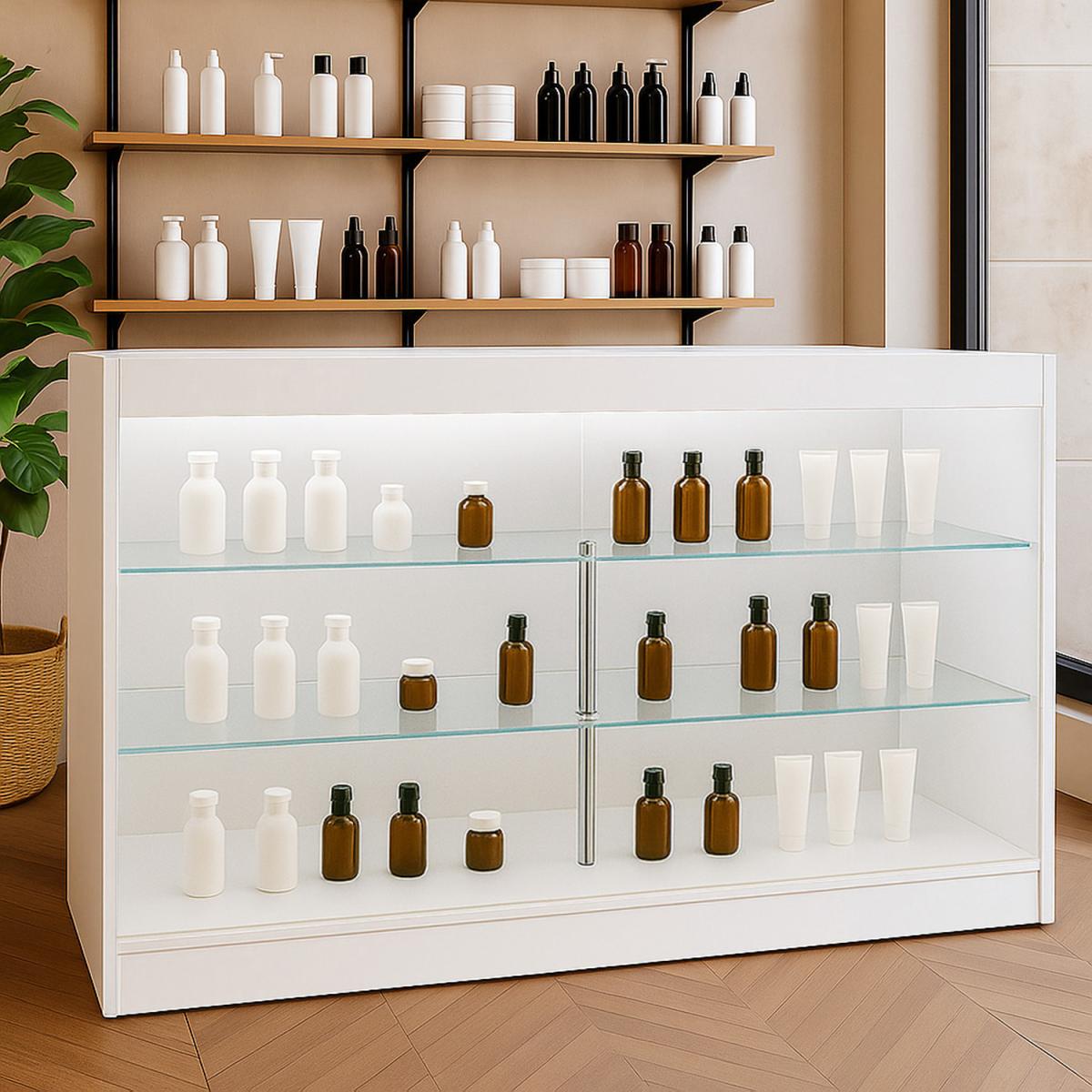Designed to bring a sleek, modern edge to any retail environment, the K1500 LED shop counter offers both style and practicality in equal measure. Ideal for retail settings such as clothing boutiques and jewellery shops, this elegant display counter is crafted to catch the eye while providing secure and efficient product presentation. Constructed from high-quality MDF with a durable melamine finish and toughened glass panels, the K1500 counter is built for lasting performance in busy commercial settings. The bright white LED lighting adds a crisp, professional glow to your display items, ensuring that products are showcased to their best advantage even in lower-light conditions. The counter clean exterior enhances its premium look, making it a refined addition to both contemporary and classic store layouts.