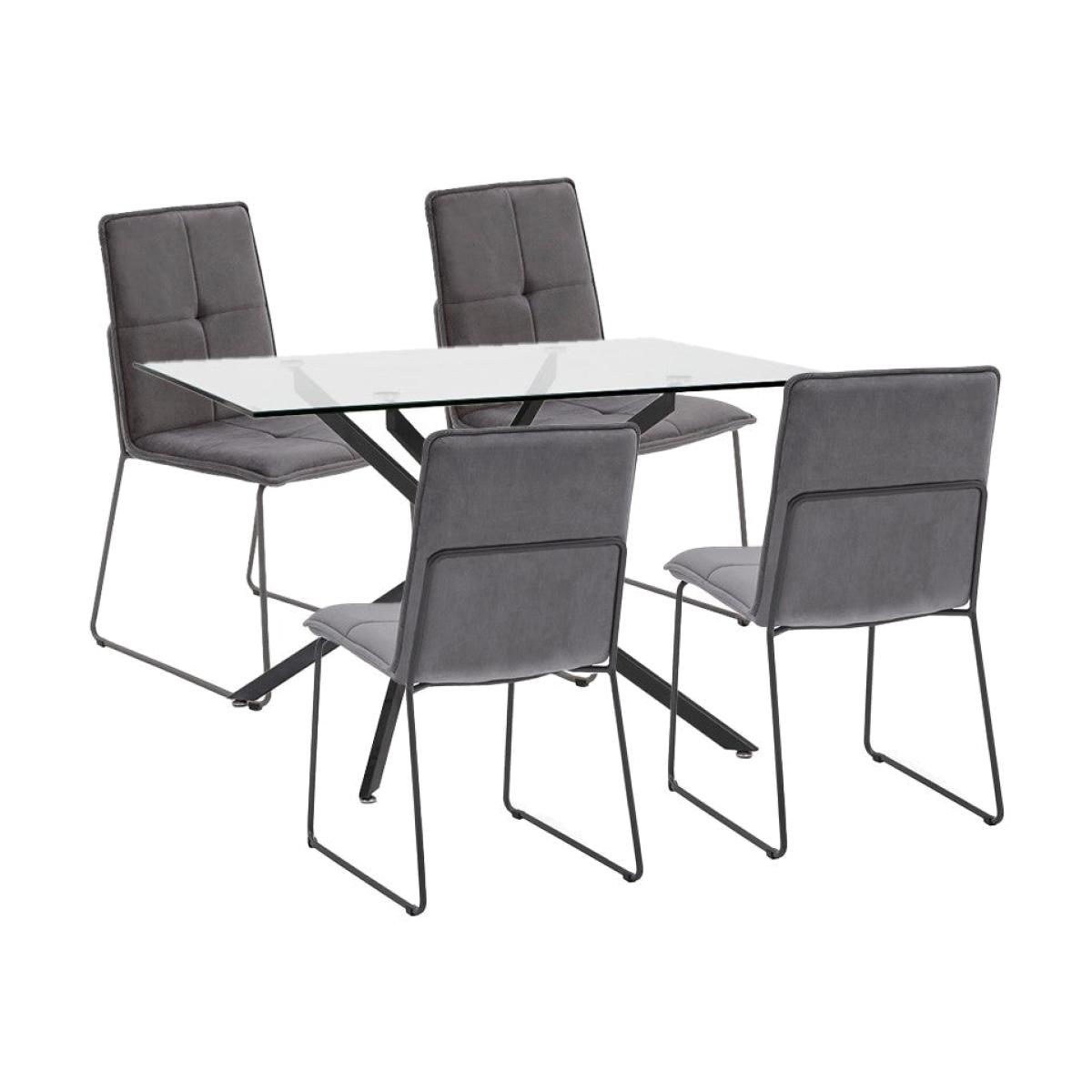 I love this 4-seater because of its sleek, modern look that works well in contemporary kitchens or dining rooms with minimalist decor. The glass top adds a sense of lightness, making it a great choice for smaller spaces, while the understated grey chairs keep it versatile enough to complement a variety of colour schemes. For styling, consider adding textured placemats or colourful centrepieces to bring warmth and personality. It also pairs well with both soft pastel accents and bold, statement colours, so it’s adaptable to different interior themes. Practical tips include using stackable or upholstered chairs for extra comfort and considering protective pads under the legs to prevent scratching, especially on wooden floors.
