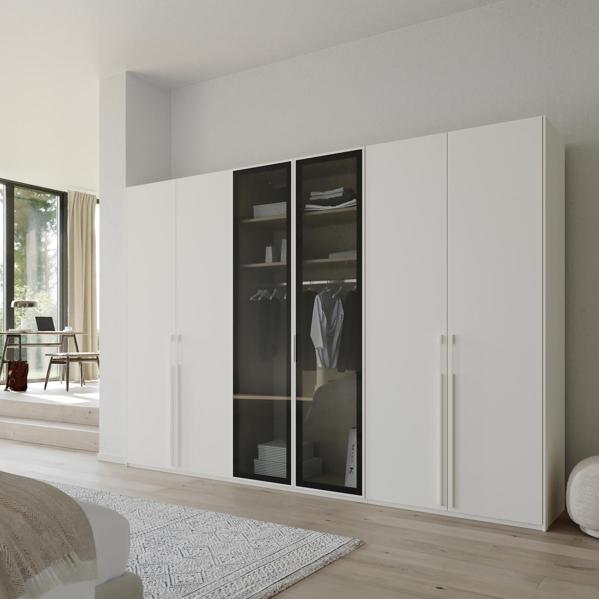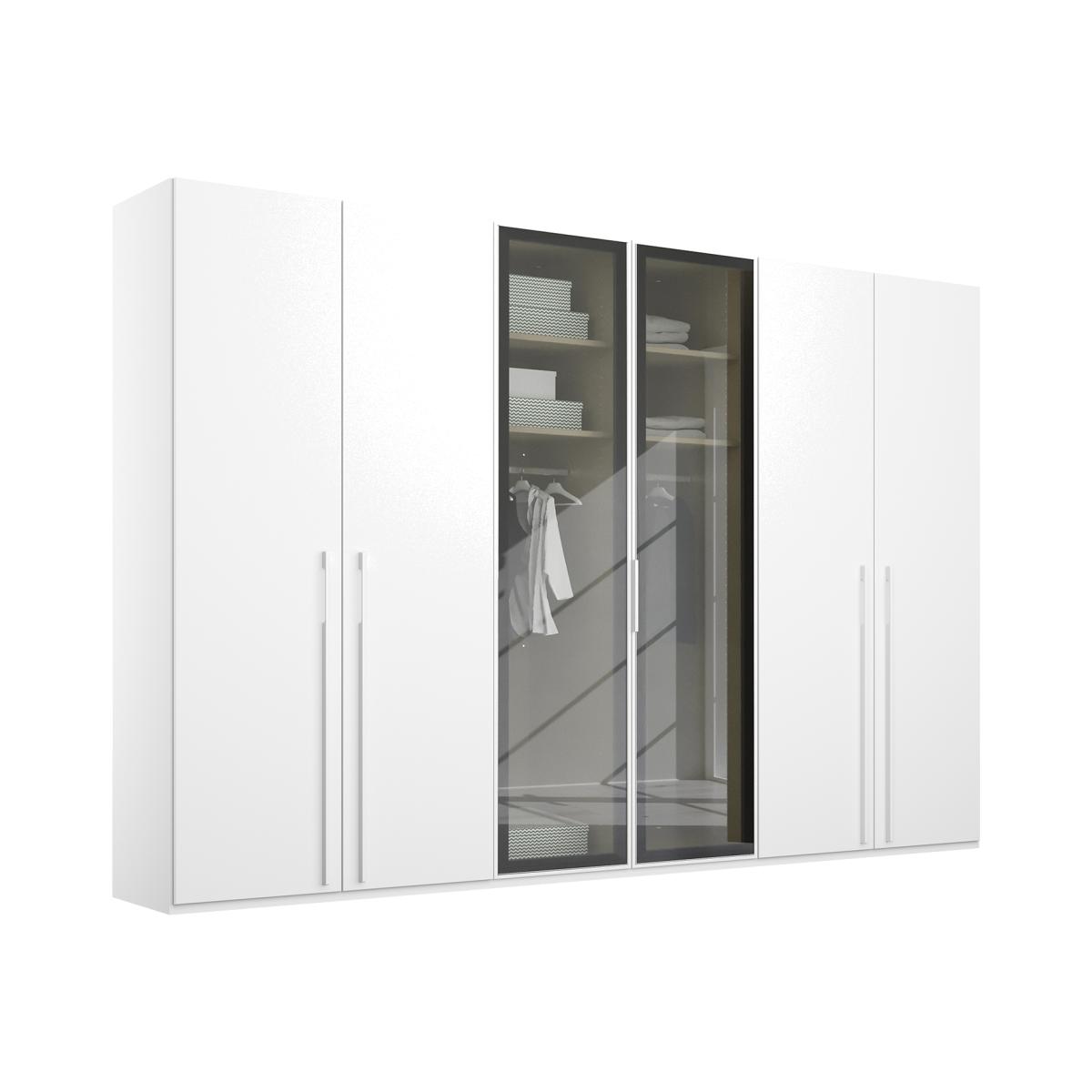 The Kacey 6 Door wardrobe with 2 Glass Doors is not only an incredibly practical solution to keeping your bedroom neat and tidy, but it also commands attention within the space thanks to its modern and unique design. Featuring coloured fronts to the wardrobes in a choice of three monochromatic shades, the Kacey 6 Door wardrobe with 2 Glass Doors also has transparent grey glass doors to the centre, perfect for showcasing your organised couture.