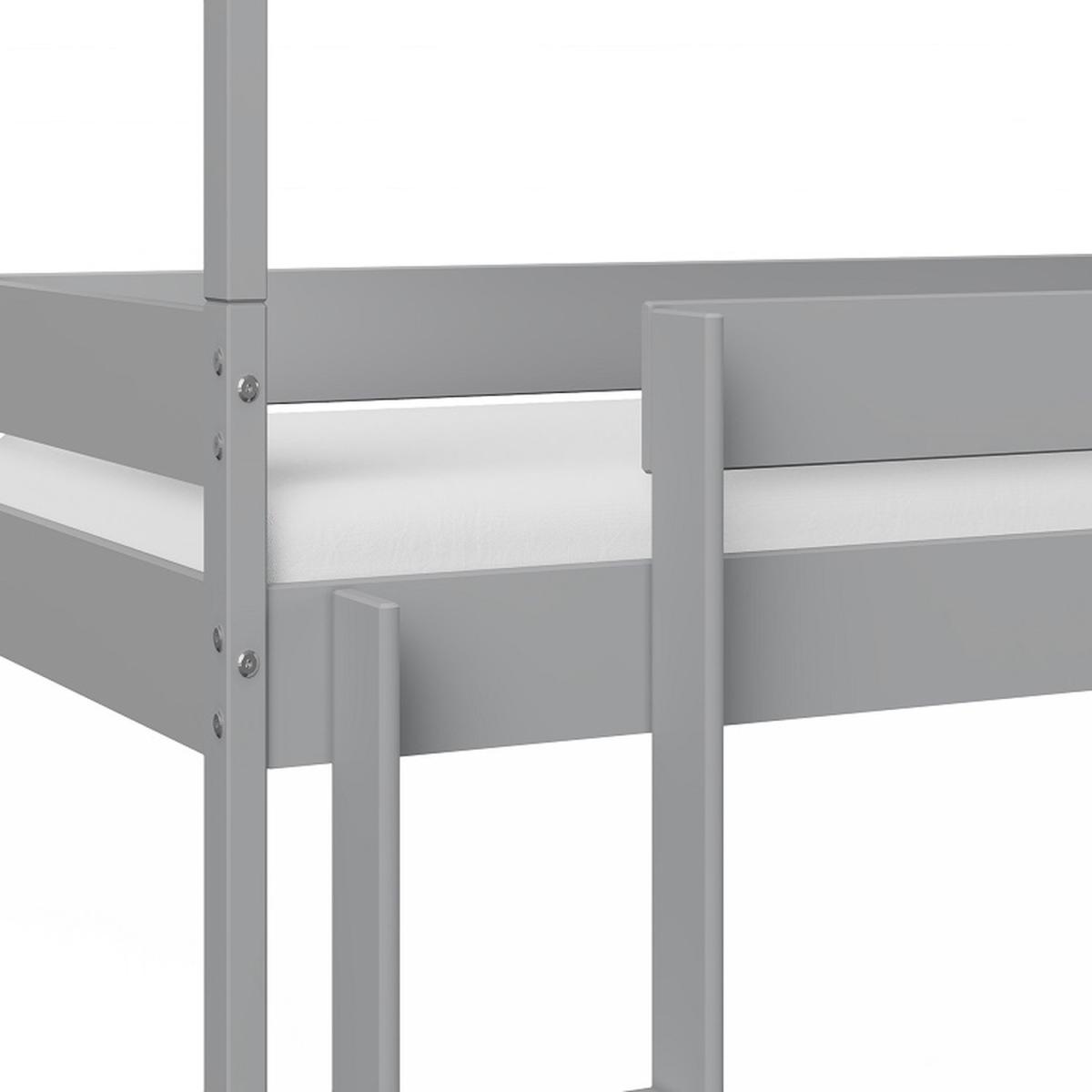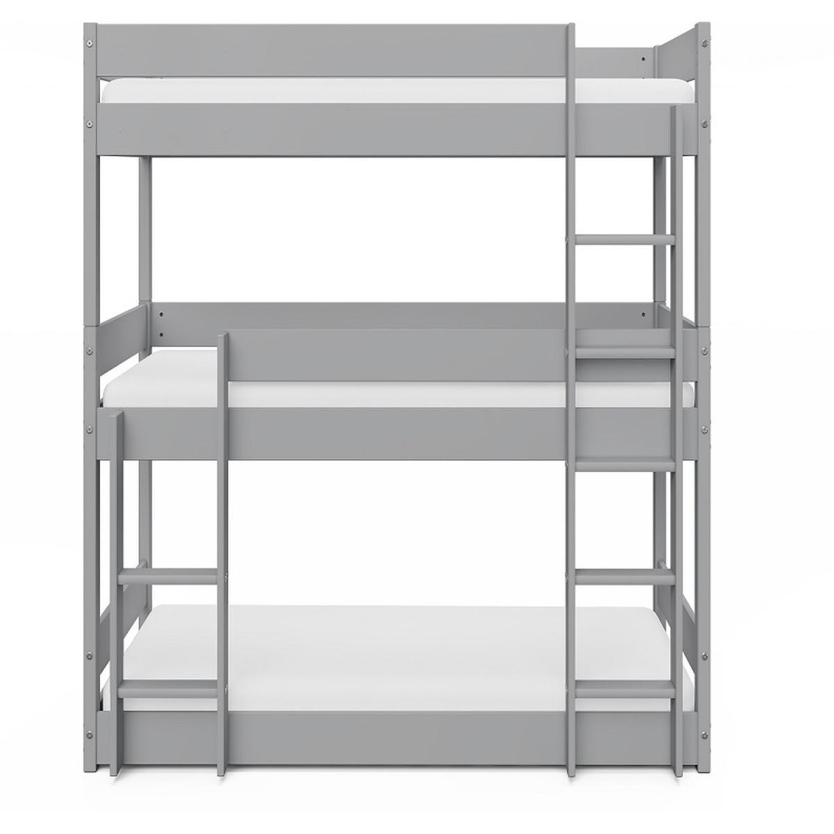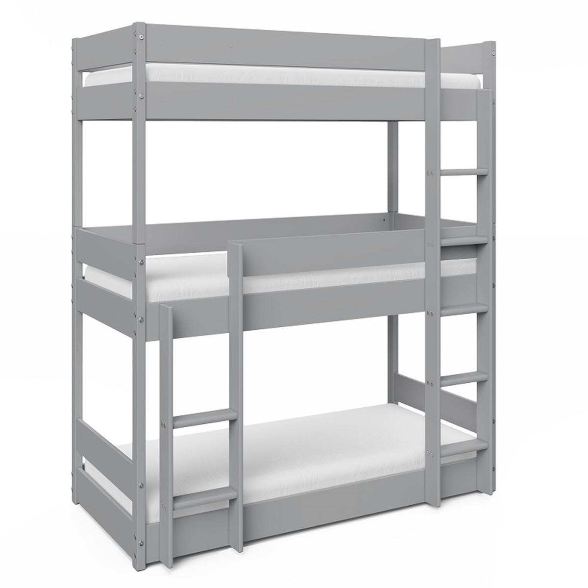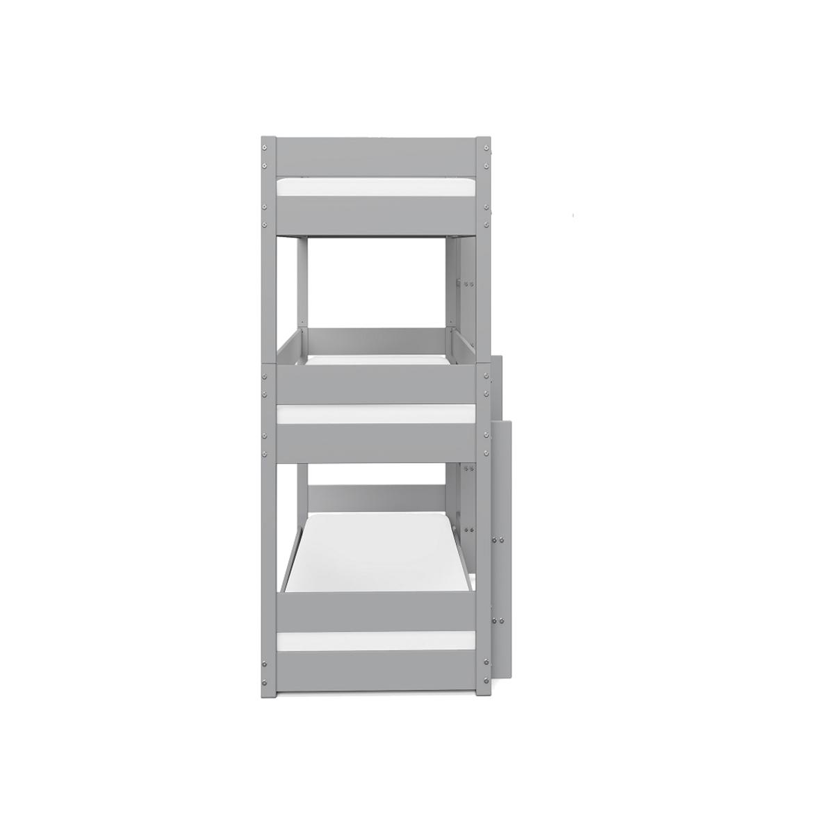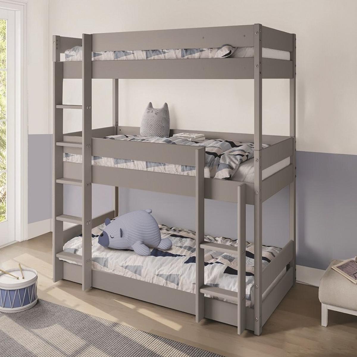 This KADEN kid's bed is part of our kid's bedroom furniture range. It is a kid's triple bunk high sleeper bed frame, perfect for a fun space for your children to sleep, play, and relax. The bottom bunk has been designed to be the perfect size for any child to enjoy and climb into without the help of an adult. The lower bed minimizes the risk of harm with less bed height to fall from. Please ensure the top bunks are not used by any child under the age of 6. This kid's triple bunk bed allows you to maximise any room's space with 3 beds in one bedroom, perfect for big families with limited space. Children can also have their own space on each tier of the triple bunk bed. This fantastic kids' bed frame is designed to fit any room with a white or grey finish. Style your room around this fantastic feature bed. The solid pine wood bunk frame offers an attractive modern finish and a solid feel to the bed. The great quality of the materials used in this will also provide security and reassurance, essential when looking for a long-term bed for a child's room.