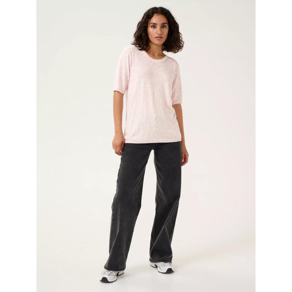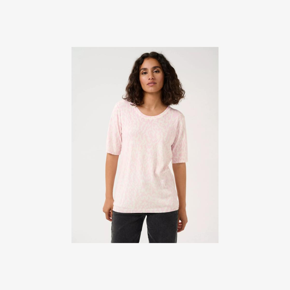 The liz pullover is a light and versatile knit top that will look great with both pants, jeans, and a skirt. It has a round neck and a regular fit, and it is made in a cool print. The sleeves are short with a straight fit, and the pullover is cut at the hips.