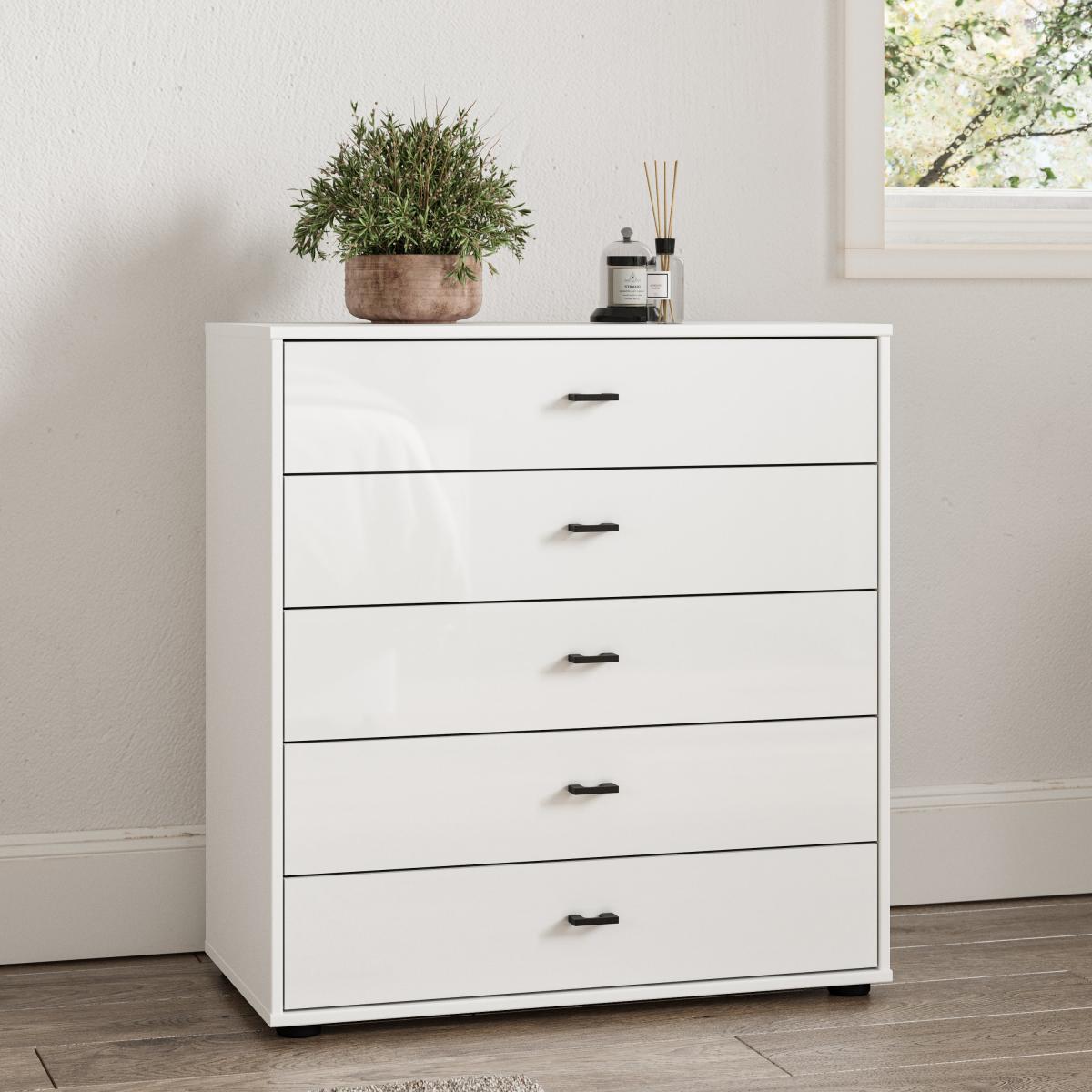 * Made to order* Modern Slate coloured handles* Highly resilient and durable metal fittings* Scratch resistant fronts* Delivered fully assembled* Made in Germany Experience elegance and practicality with the Kahla Glass Fronted Large 5 Drawer Chest. Available in a choice of trendy colours, this chest boasts modern slate coloured handles, adding a touch of sophistication to the glass fronted drawers. Designed with longevity in mind, this piece is crafted with highly resilient metal fittings and scratch resistant fronts. Delivered fully assembled, the Kahla Chest of Drawers will seamlessly integrate into your bedroom space, and provides plenty of storage.