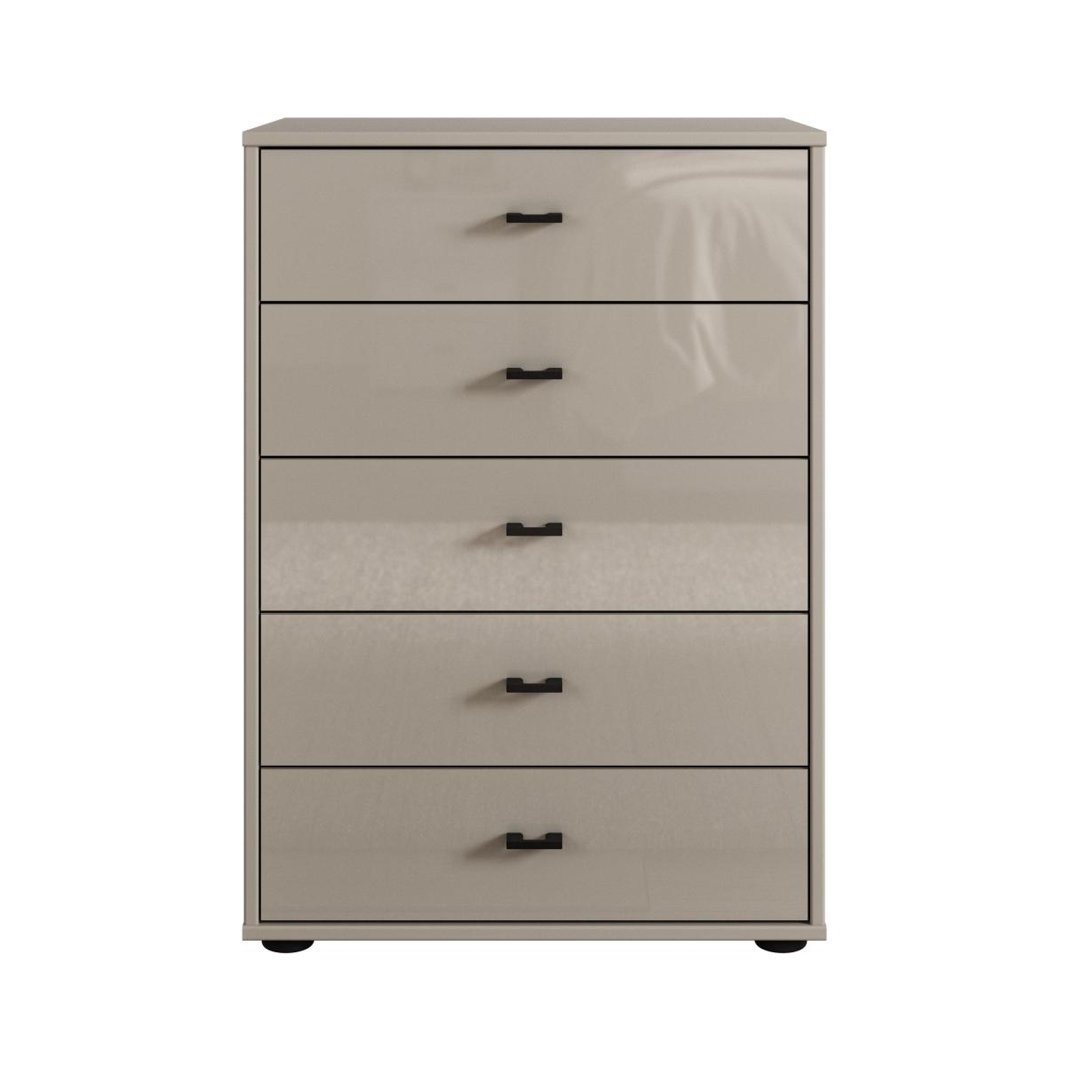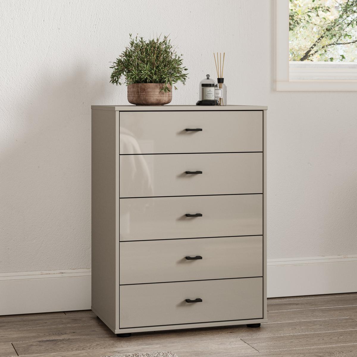 * Made to order* Modern Slate coloured handles* Highly resilient and durable metal fittings* Scratch resistant fronts* Delivered fully assembled* Made in Germany Experience elegance and practicality with the Kahla Glass Fronted Small 5 Drawer Chest. Available in a choice of trendy colours, this chest boasts modern slate coloured handles, adding a touch of sophistication to the glass fronted drawers. Perfect for smaller bedroom spaces, this chest of drawers is designed with longevity in mind, crafted with highly resilient metal fittings and scratch resistant fronts. Delivered fully assembled, the Kahla Chest of Drawers will seamlessly integrate into your bedroom and provide plenty of useful storage space.