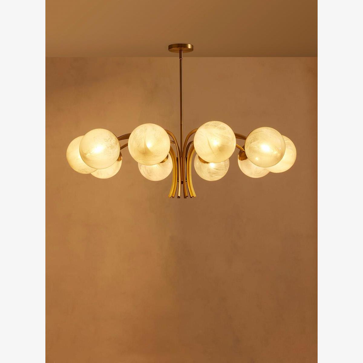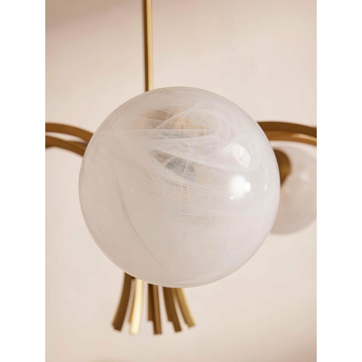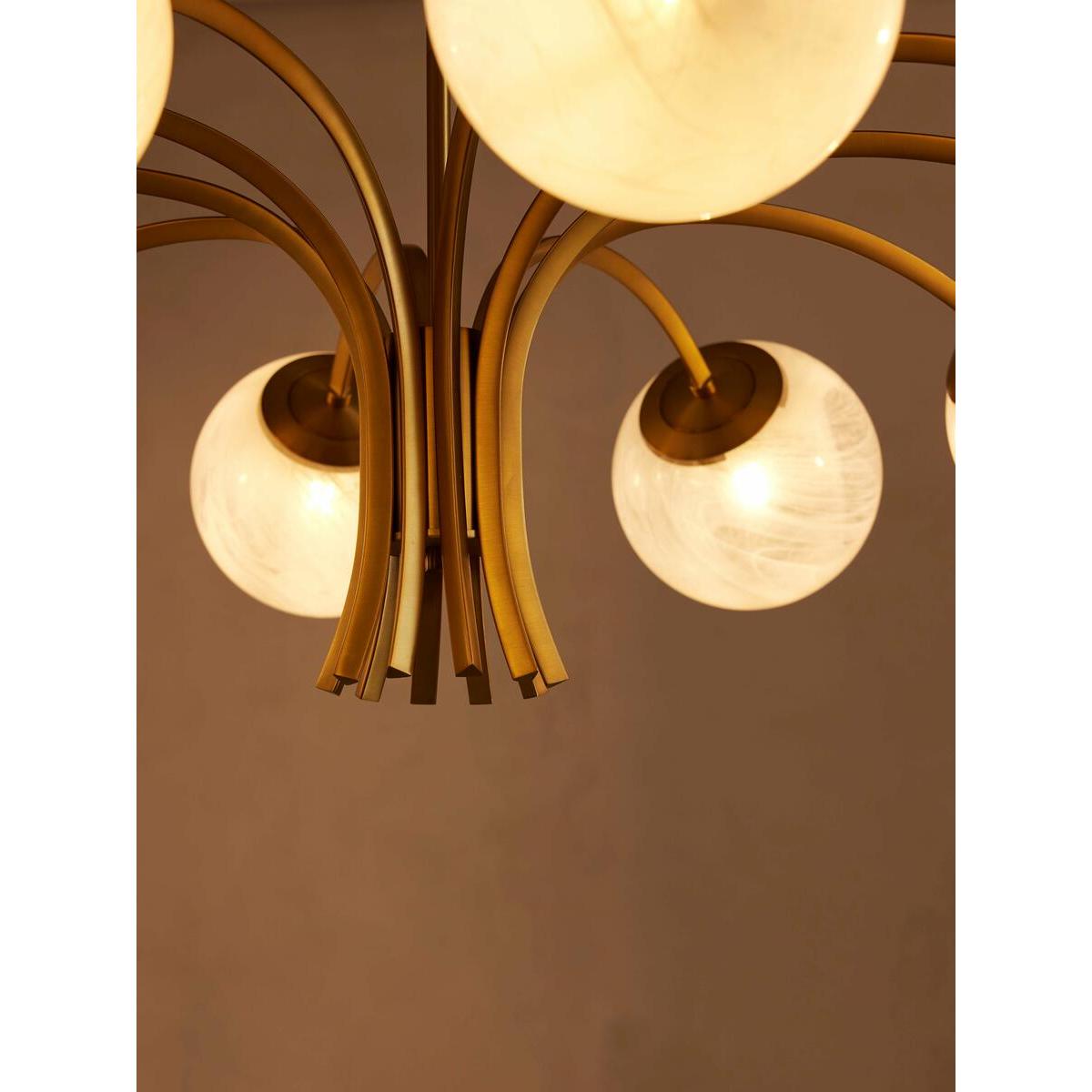 Creating an impressive entrance in the hallway or dining room, our Kai chandelier's contemporary silhouette takes inspiration from White City House. Antique brass finish metal is carved into refined angular arms, each bearing a glass globe hand-applied with pigment for a milky swirl. Ideal for a softer lighting scheme in your living space with design-led details as the focal point. Contemporary globular chandelier Refined arm shape Antique brass finish metal carved into angular arms 10 glass globes with a milky swirl Hand-applied white pigment We recommend wiring our ceiling lights with a dimmer control to tailor the light level Inspired by White City House