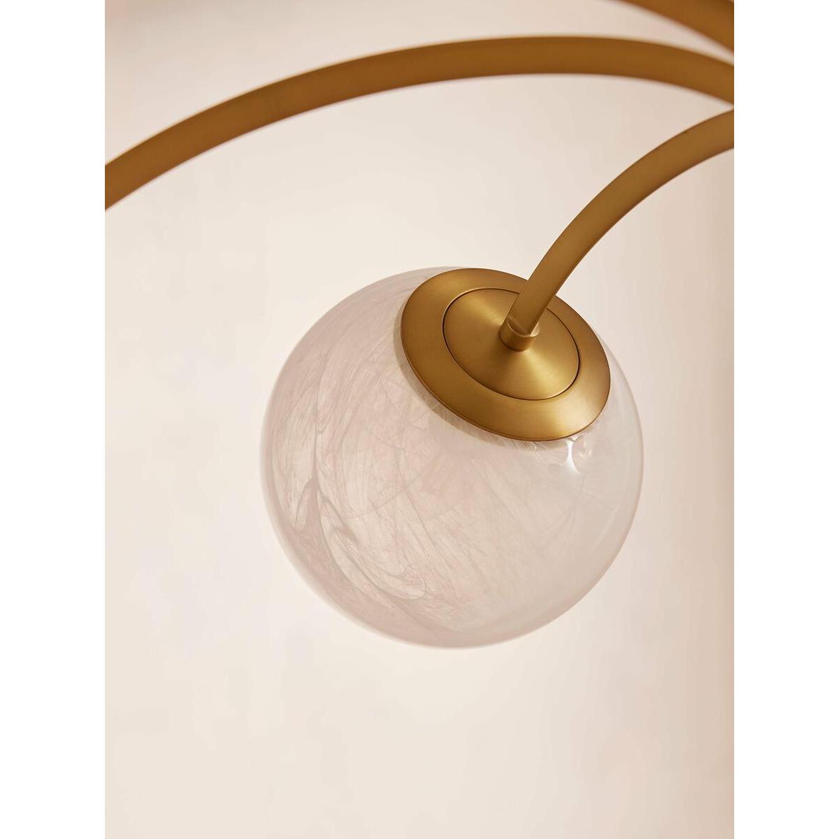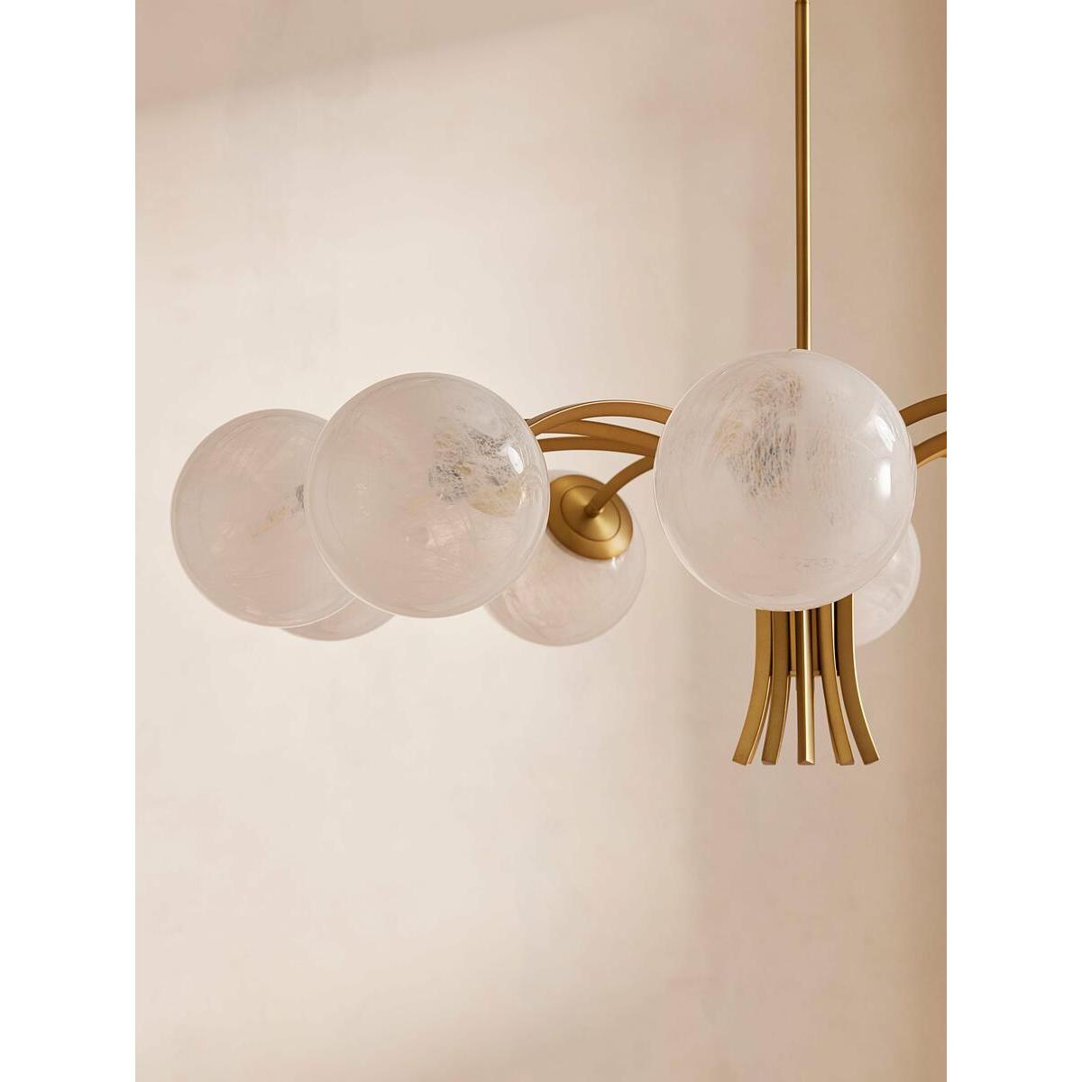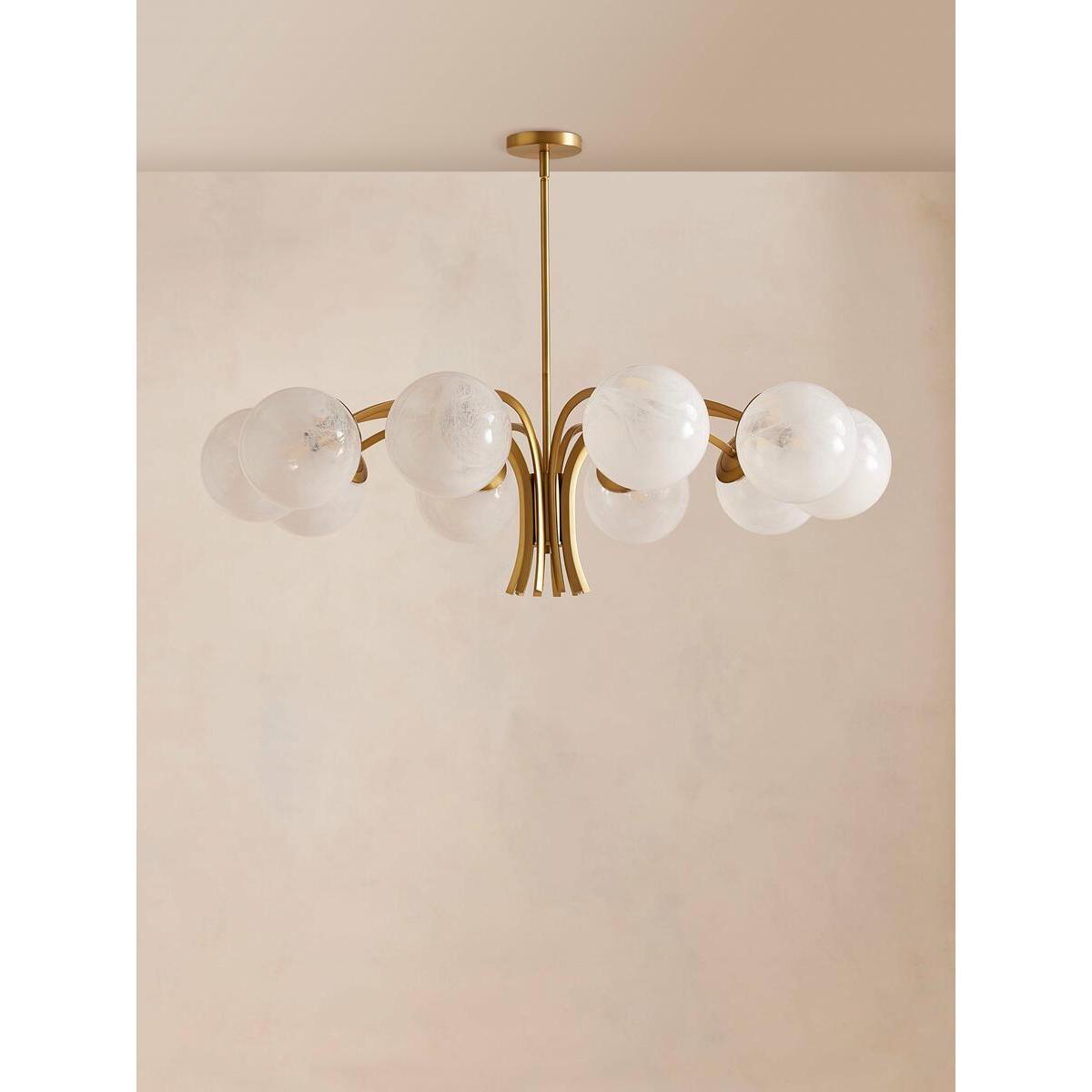 Creating an impressive entrance in the hallway or dining room, our Kai chandelier's contemporary silhouette takes inspiration from White City House. Antique brass finish metal is carved into refined angular arms, each bearing a glass globe hand-applied with pigment for a milky swirl. Ideal for a softer lighting scheme in your living space with design-led details as the focal point. Contemporary globular chandelier Refined arm shape Antique brass finish metal carved into angular arms 10 glass globes with a milky swirl Hand-applied white pigment We recommend wiring our ceiling lights with a dimmer control to tailor the light level Inspired by White City House