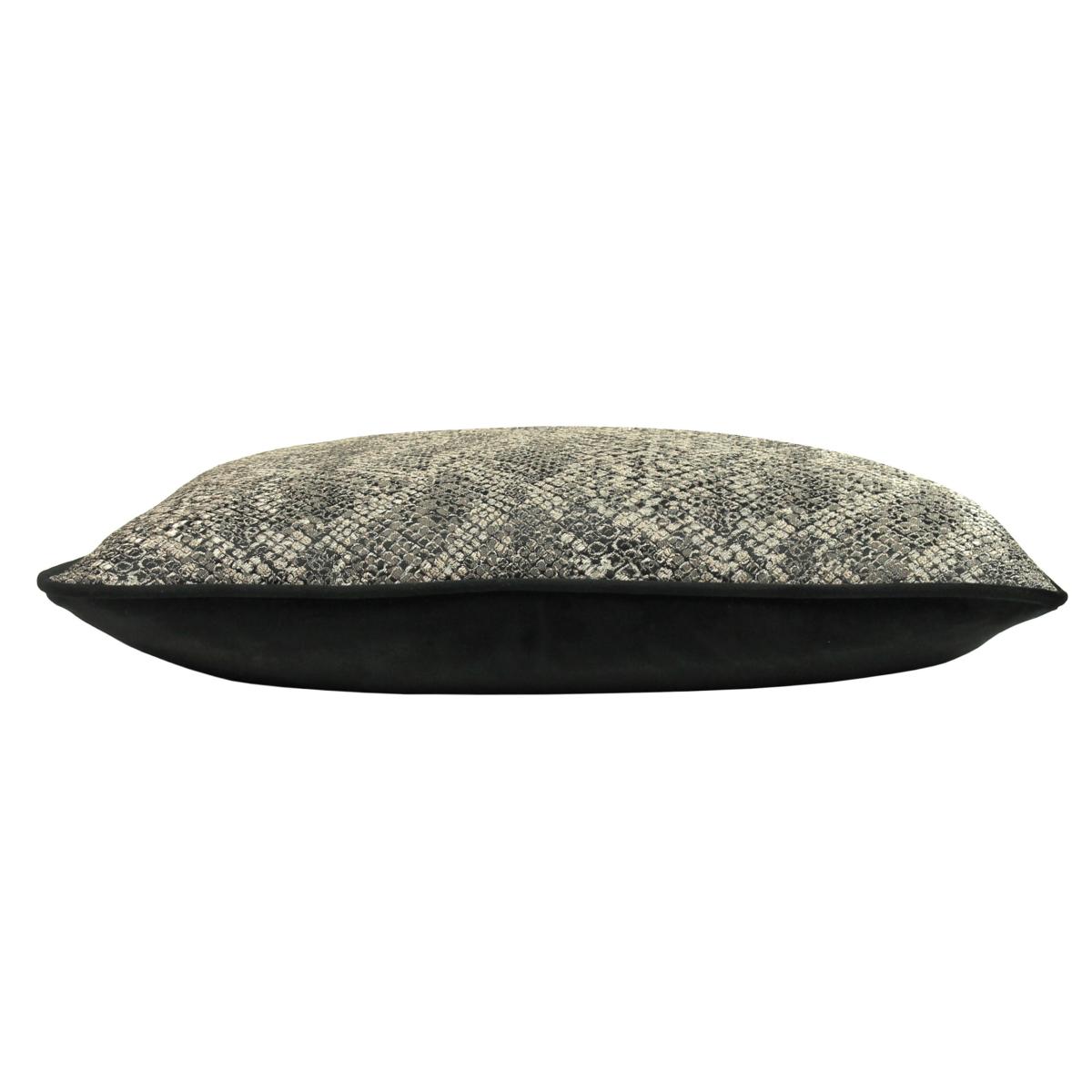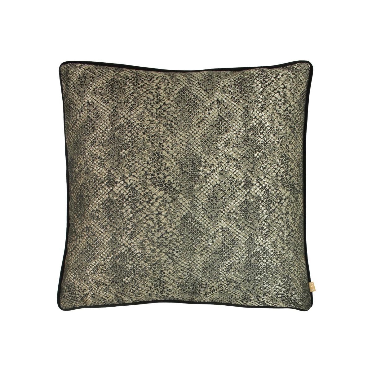 * Snake print design * Made from polyester * Square shape * Dry clean only Elevate your décor with the Kai Viper Square Cushion, a statement piece featuring a luxurious metallic snakeskin print. The soft velvet reverse, piped edging, and hidden zip closure ensure both comfort and elegance. Perfect for adding depth and texture to any interior.